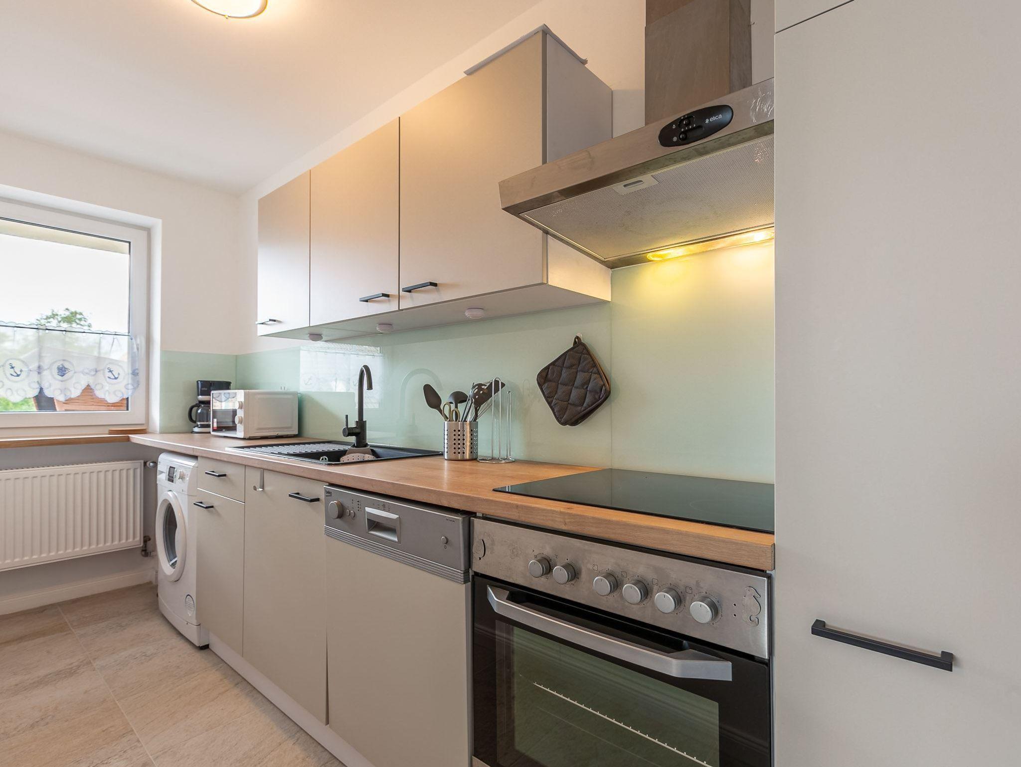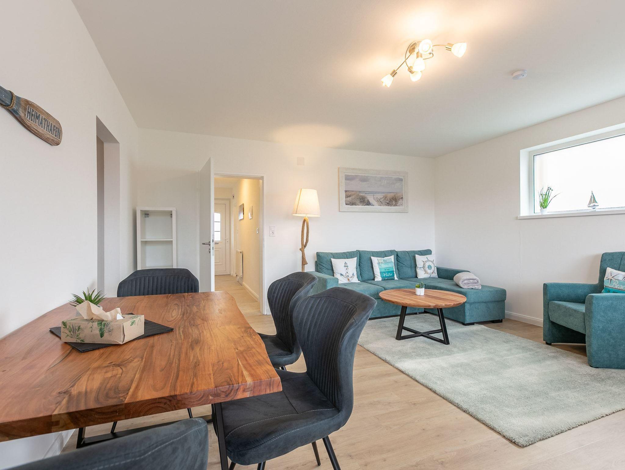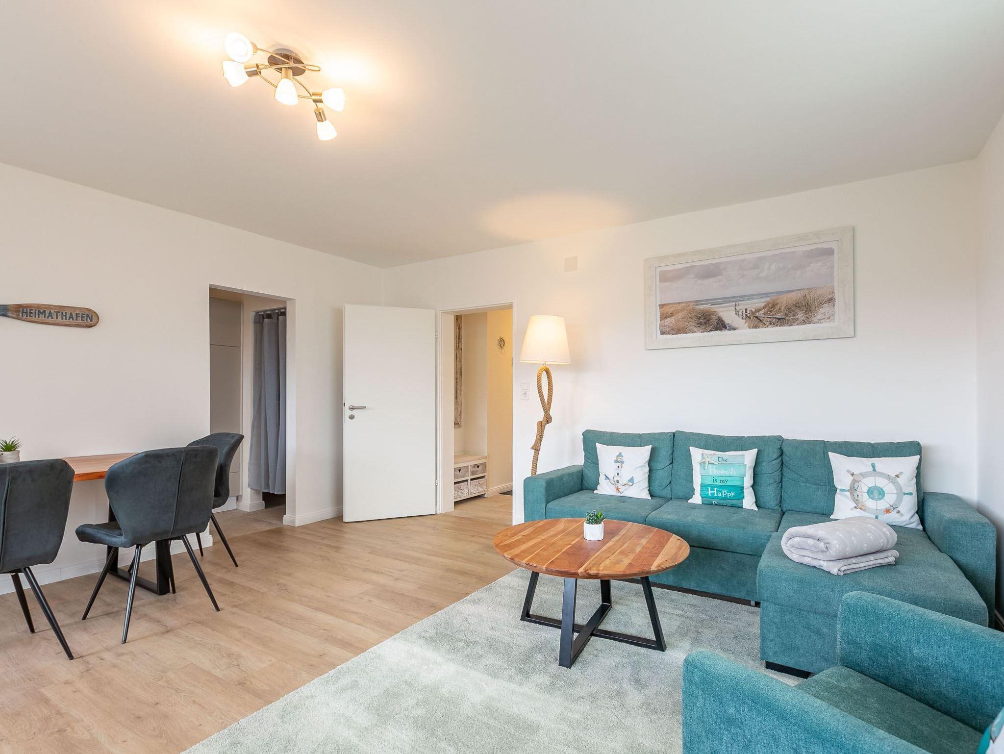 Wohnzimmer mit Sofa mit Ottomane, Sessel, großem SMART-TV (Waipu) und Esstisch mit 4 Stühlen. Direkter Zugang zum möblierten und überdachten Balkon nach Westen mit Strandkorb. Halboffene Küche mit Backofen, Mikrowelle, Geschirrspüler, Kühl-Gefrier-Kombination, Waschmaschine und Abstell- bzw. Vorratsraum.