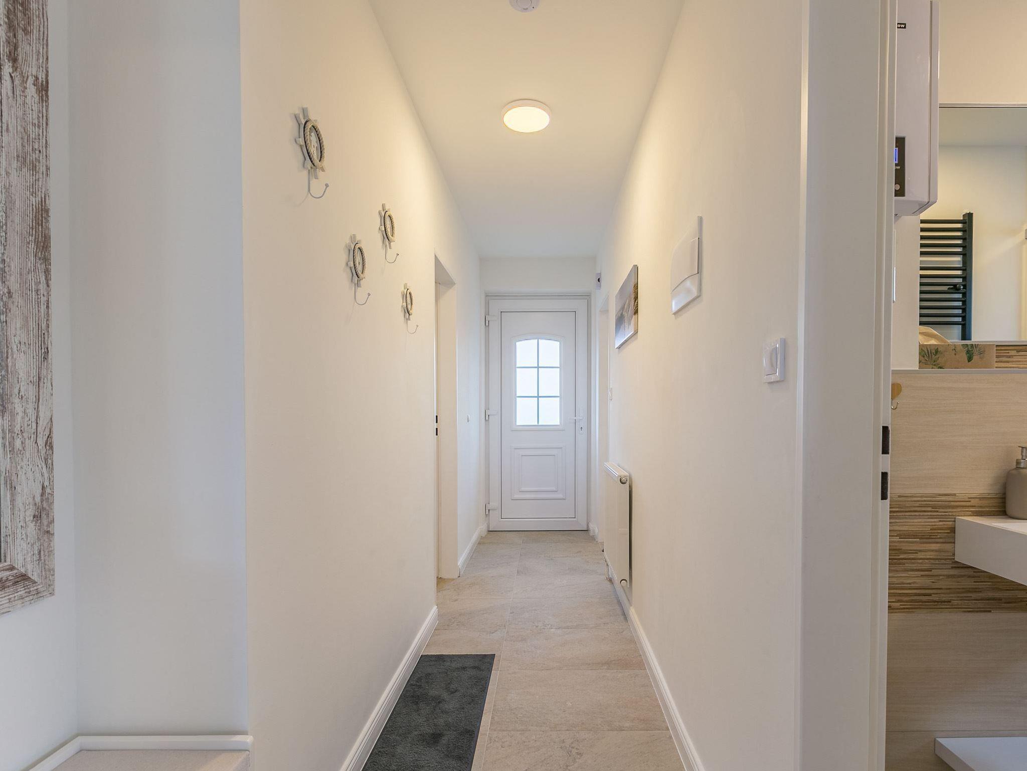 Flur mit Garderobe, Spiegel und Schuhbank im Eingangsbereich.