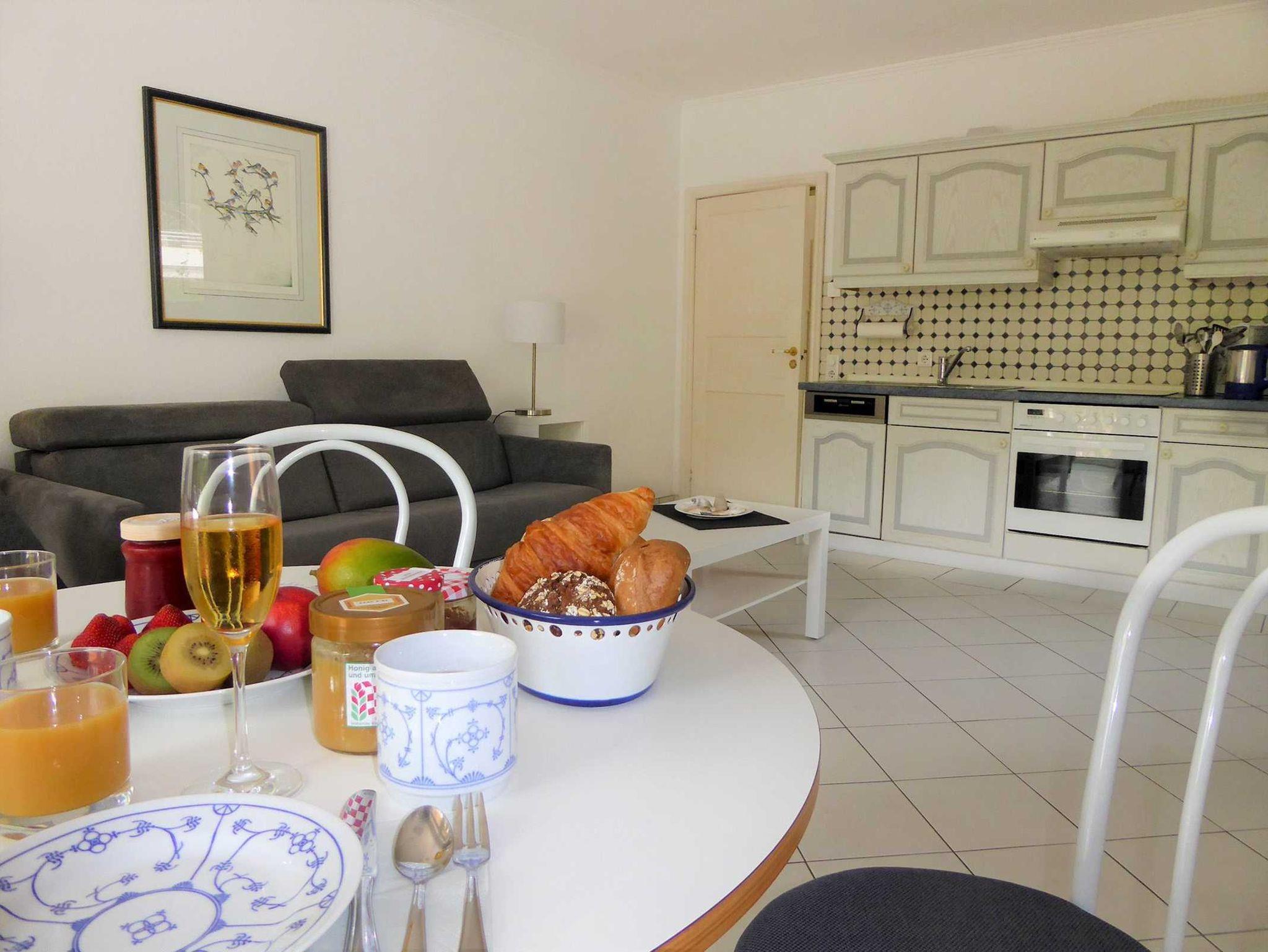Moderne Küchenzeile: Kochen Sie in der voll ausgestatteten Küche mit Cerankochfeld und Backofen Ihre Lieblingsgerichte.