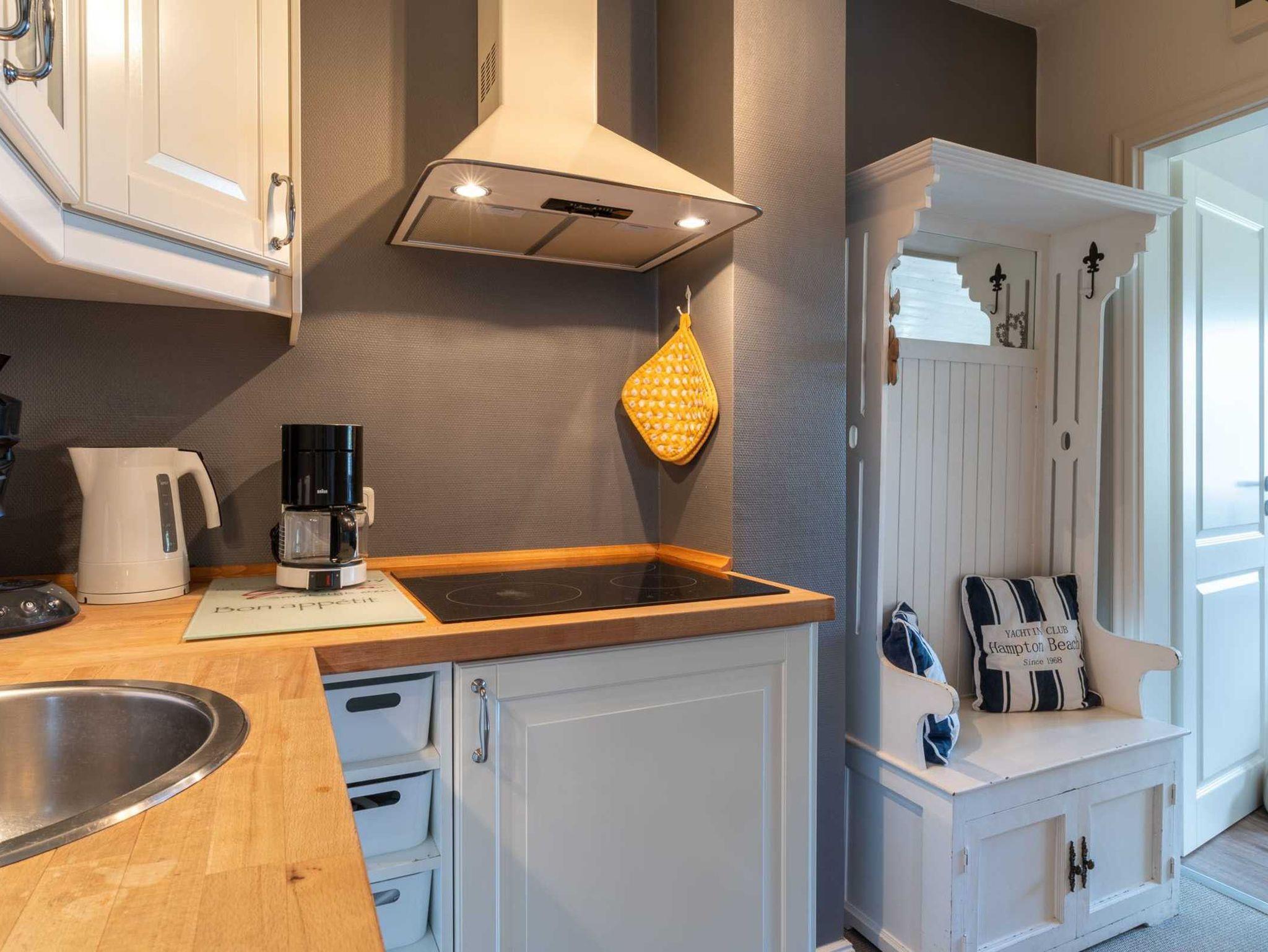 Wohnzimmer mit Ecksofa (3-4 Personen), TV (Kabel), Stereoanlage (mit Bluetooth-Funktion und DVD-Player) und Esstisch mit 3 Stühlen. Halboffene Küche mit Kühlschrank mit Gefrierfach, Geschirrspüler und Philips Senseo Kapsel-Kaffeemaschine. Keine Mikrowelle, kein Backofen.