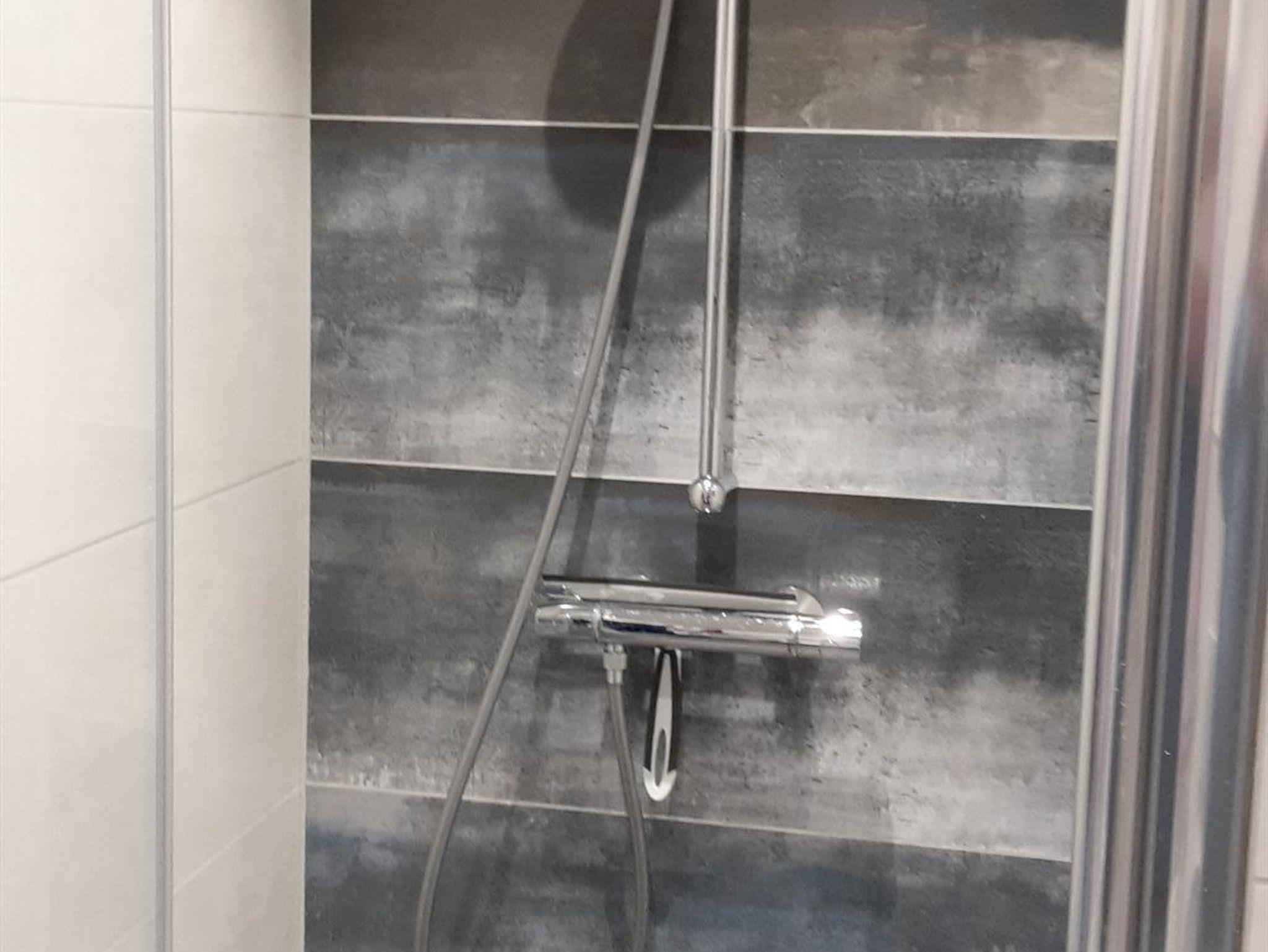 Das moderne Bad bietet Komfort auf hohem Niveau: Eine bodengleiche Dusche mit eleganter Glasabtrennung, stilvolle Armaturen, ein beleuchteter Spiegelschrank und edle Fliesen verleihen dem Raum eine exklusive Note. Ein Föhn ist ebenfalls vorhanden.