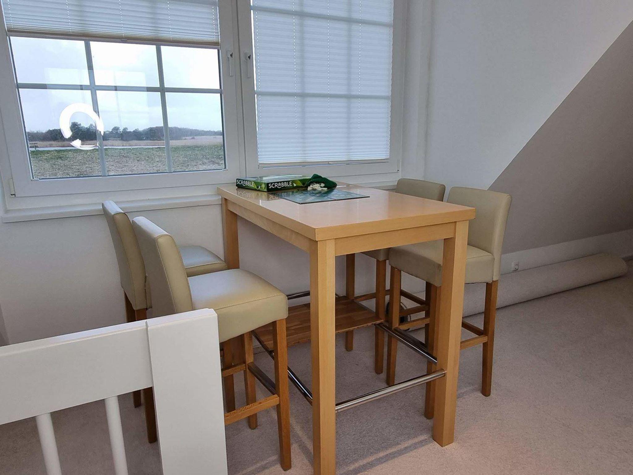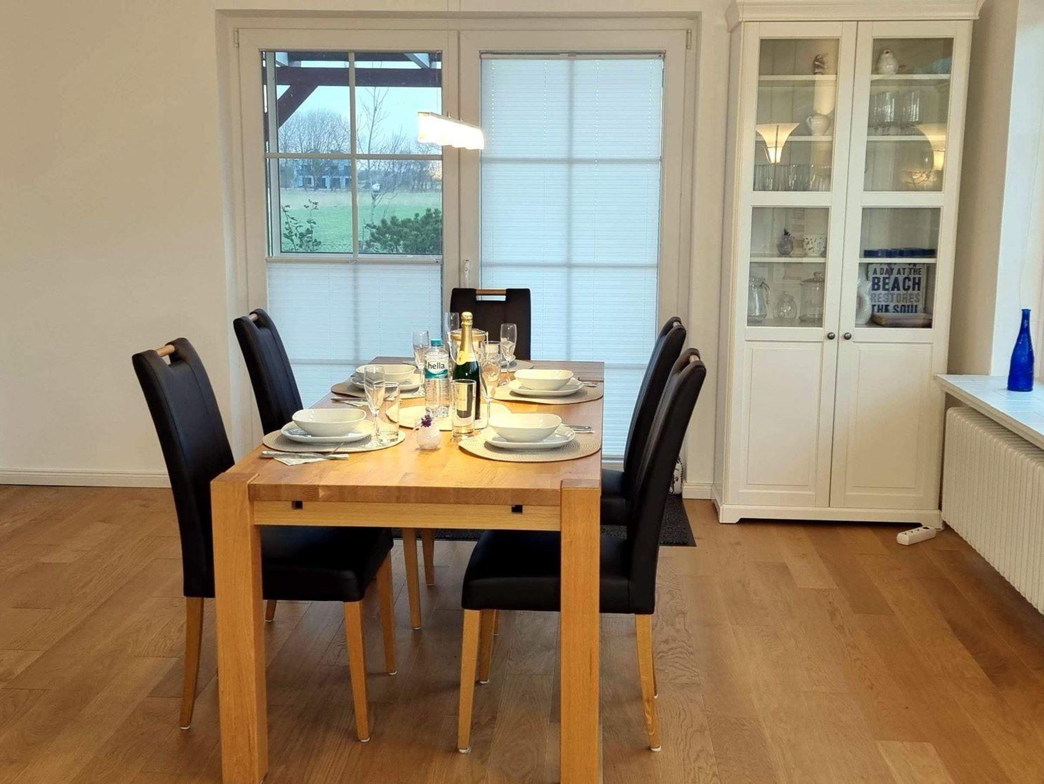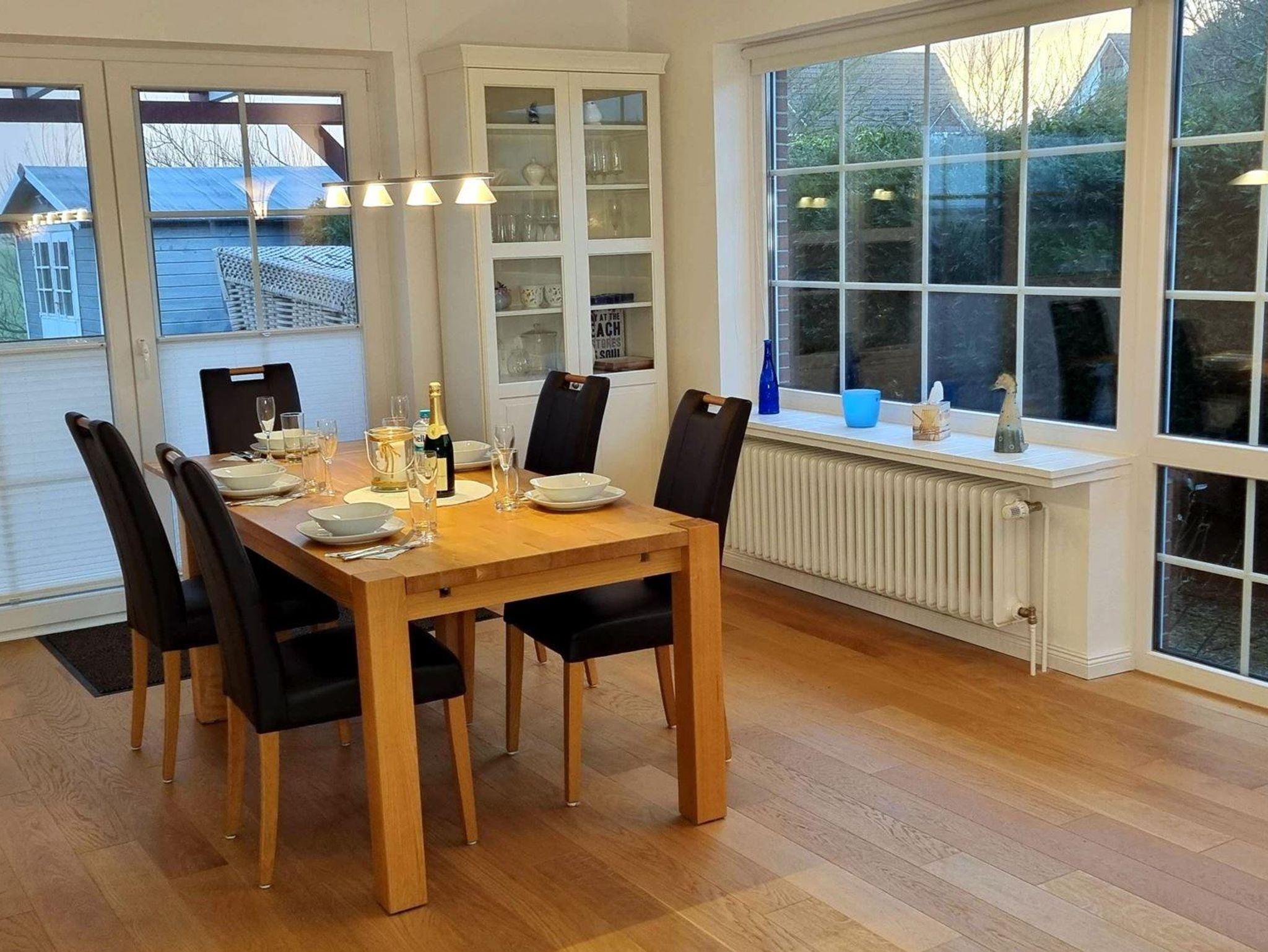 • Esszimmer mit Esstisch und 5 Stühlen, direkter Zugang zur Terrasse und zum Garten.