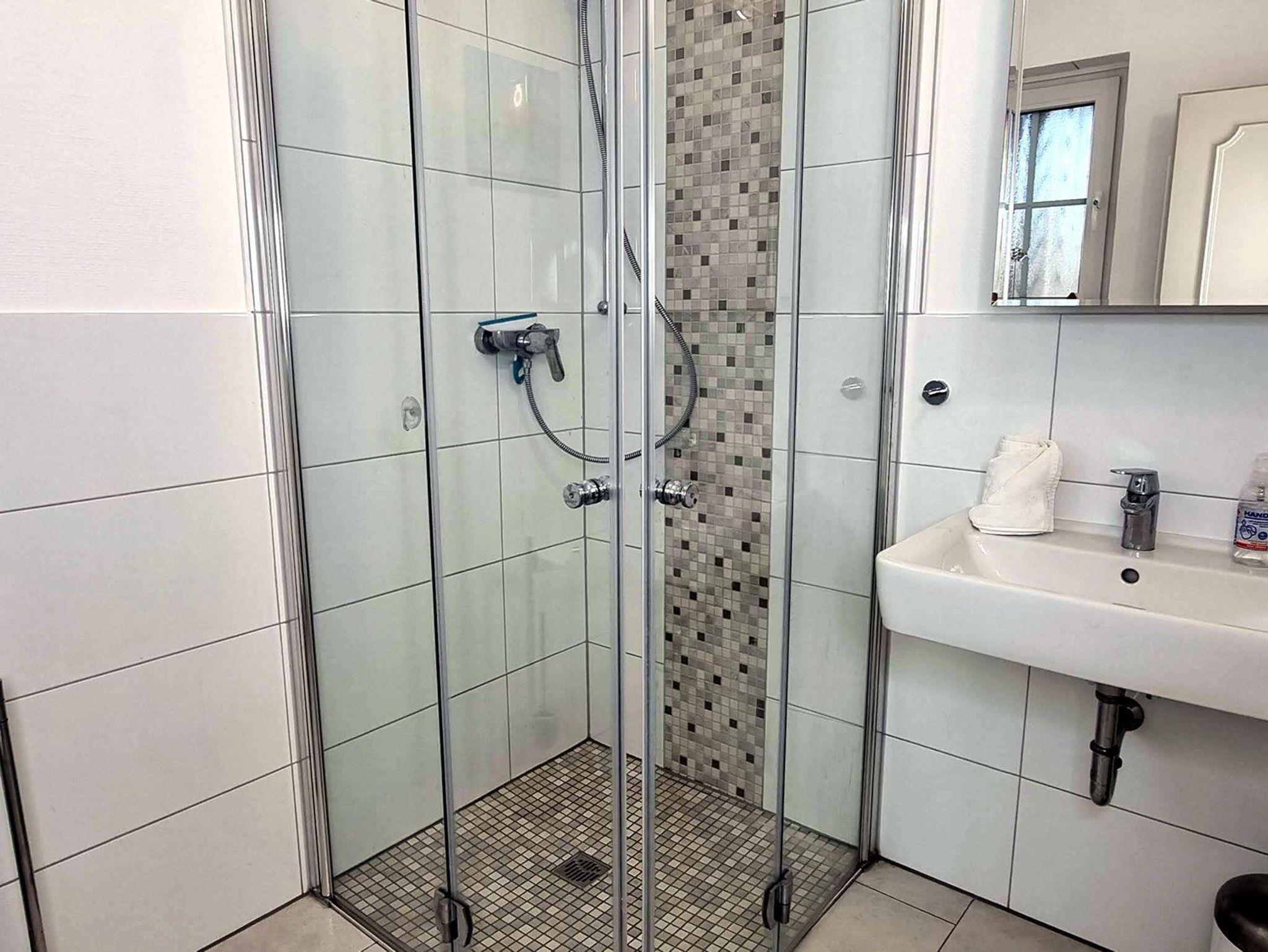 • 1 Badezimmer im EG (Duschbad) mit bodengleicher Dusche, WC, Waschbecken.