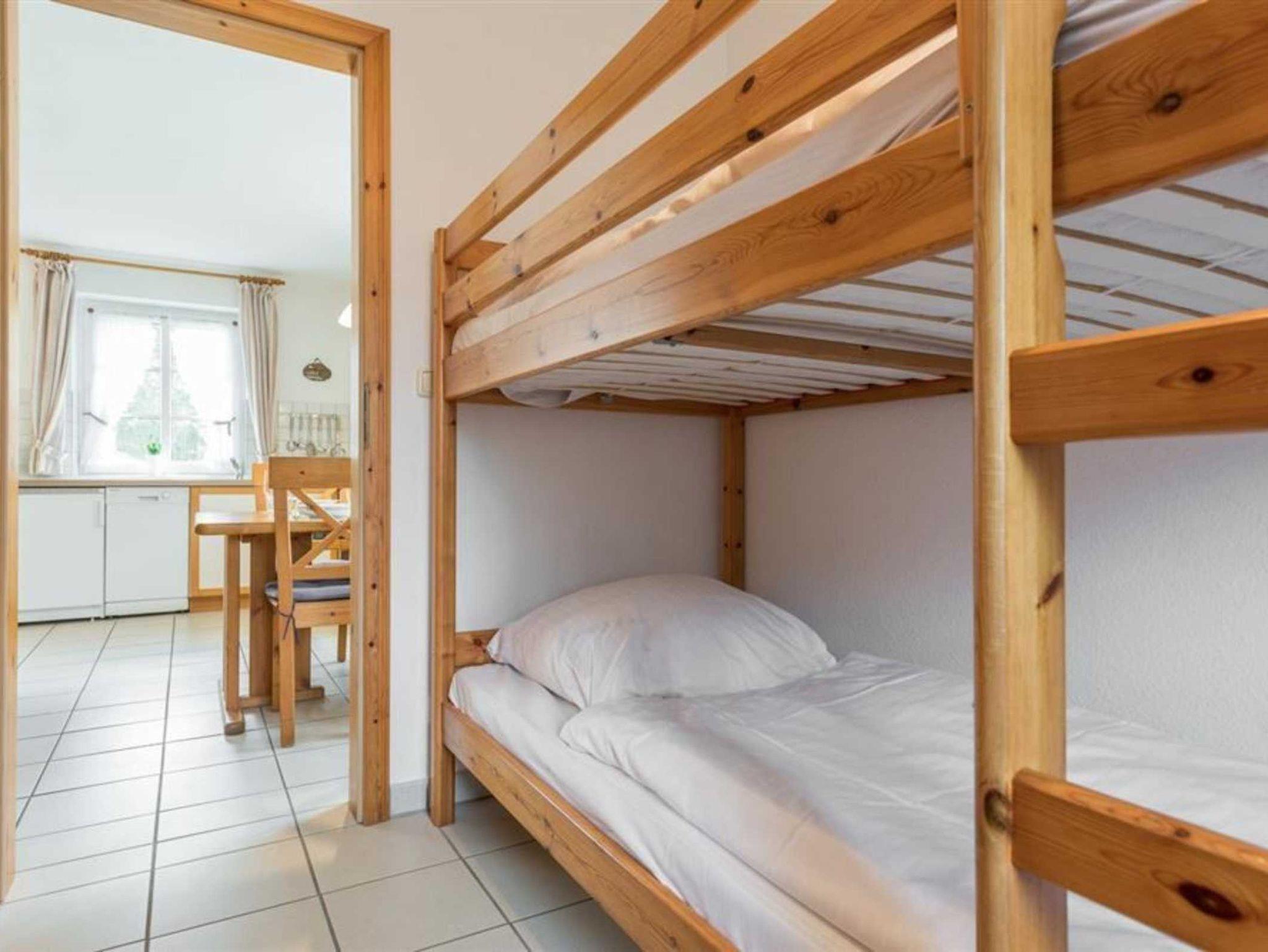 Schlafzimmer mit 2 Etagen-Einzelbetten (je 90x200cm) und Einbauschrank.