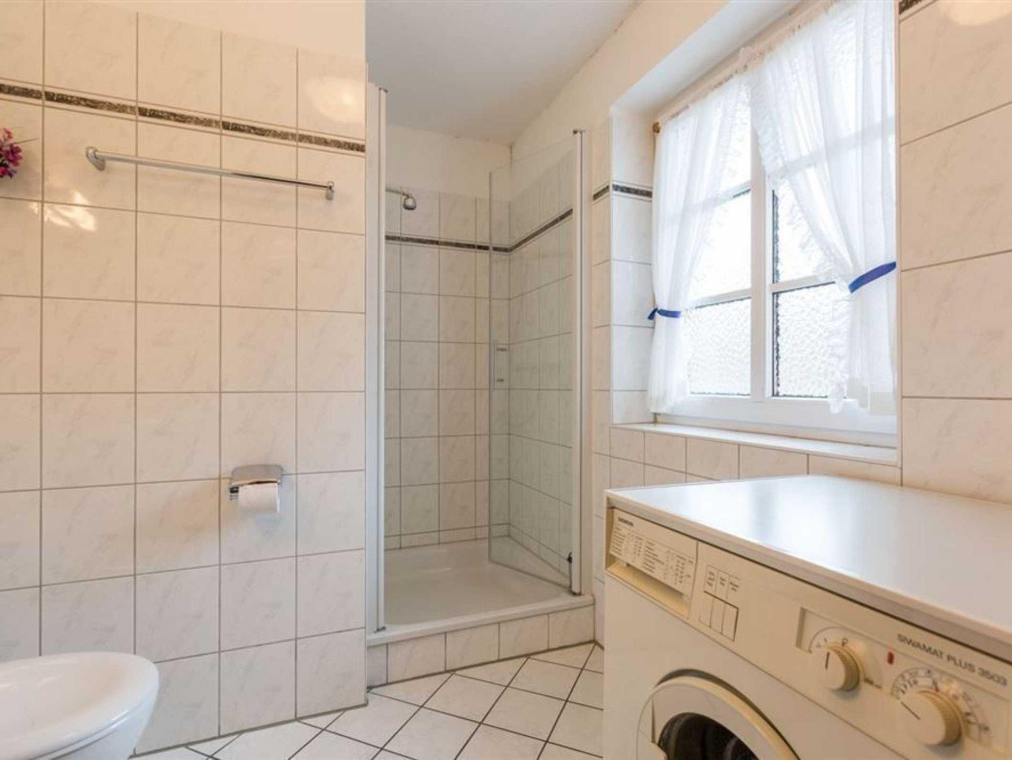 Badezimmer (Duschbad) mit Dusche, WC, Waschmaschine und Tageslicht. Fußbodenheizung für besondere Behaglichkeit.