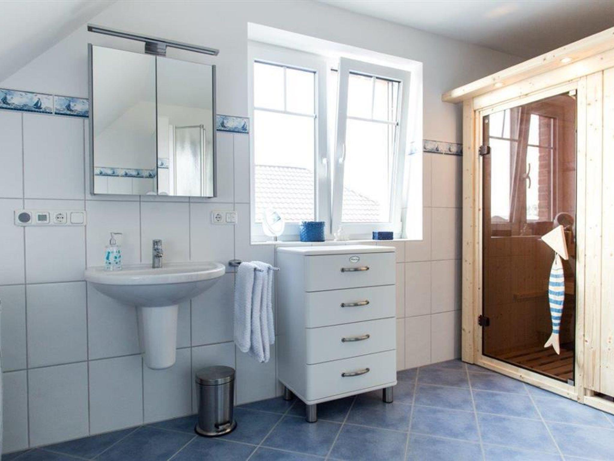 Das hochmoderne Bad verfügt über eine flache Runddusche mit Glasschiebetür, Waschtisch, Fön, WC, Fußbodenheizung und einer exklusiven Sauna. Zudem finden Sie eine Waschmaschine und Trockner. Für Kinder gibt es einen Fußhocker am Waschbecken. Kinderstuhl und Kinderbett sind