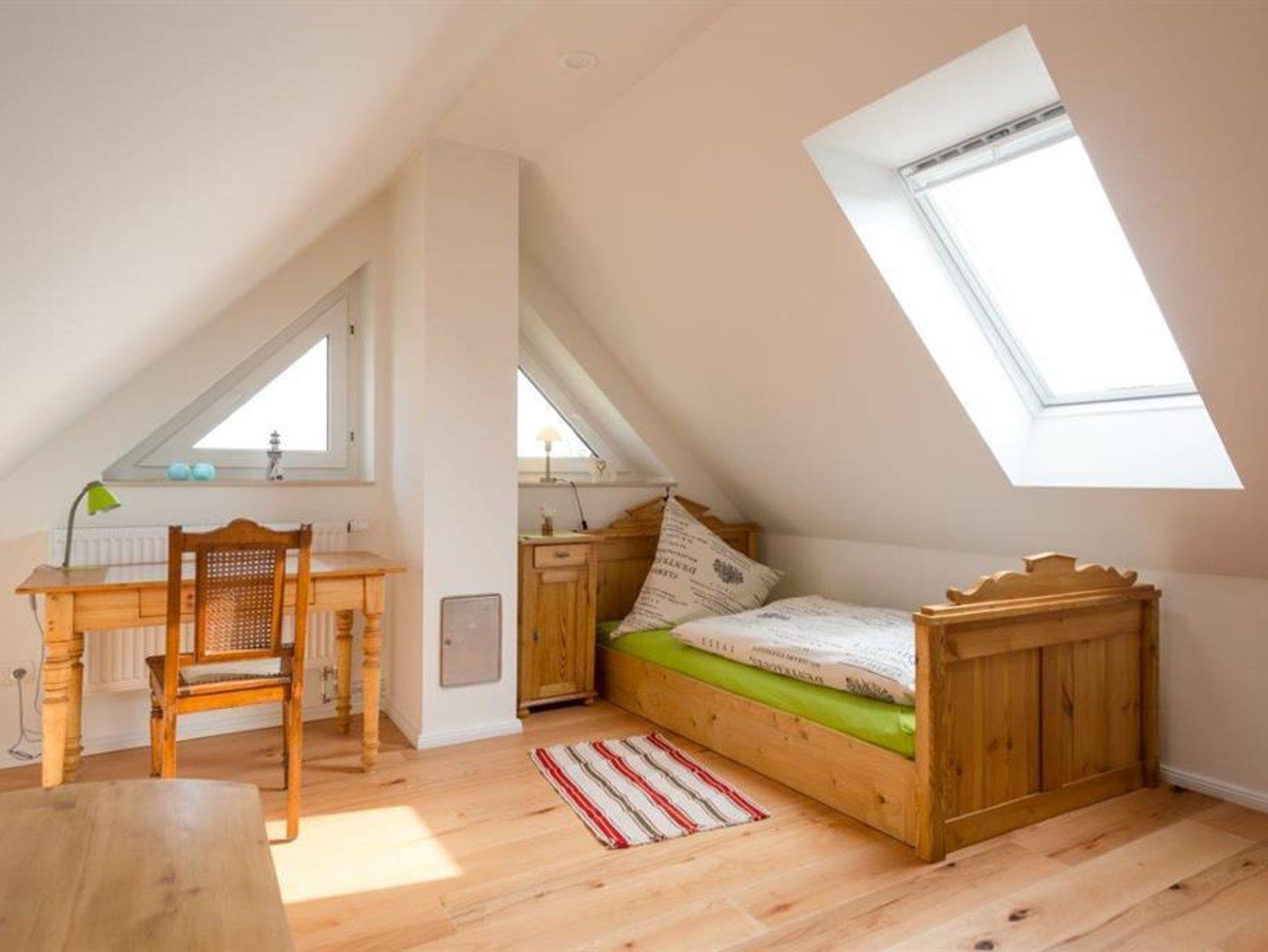 Das unsere Schlafzimmer verfügt über eine Doppelbett. Die Treppe hinauf gelangen Sie in den offenen Spitzboden mit 2 gegenüberliegenden kleinen Schlafräumen, jeweils mit einem Einzelbett ausgestattet. Bei einer Buchung von 1-2 Personen gehört der Spitzboden NICHT zum Mietumfang.