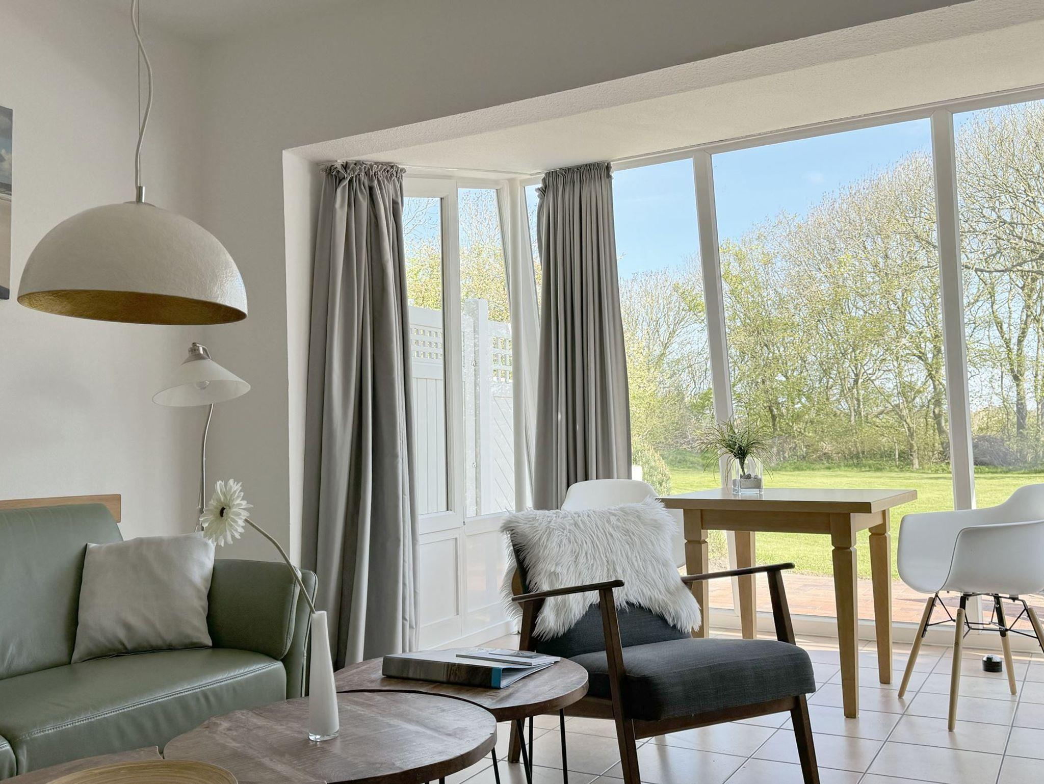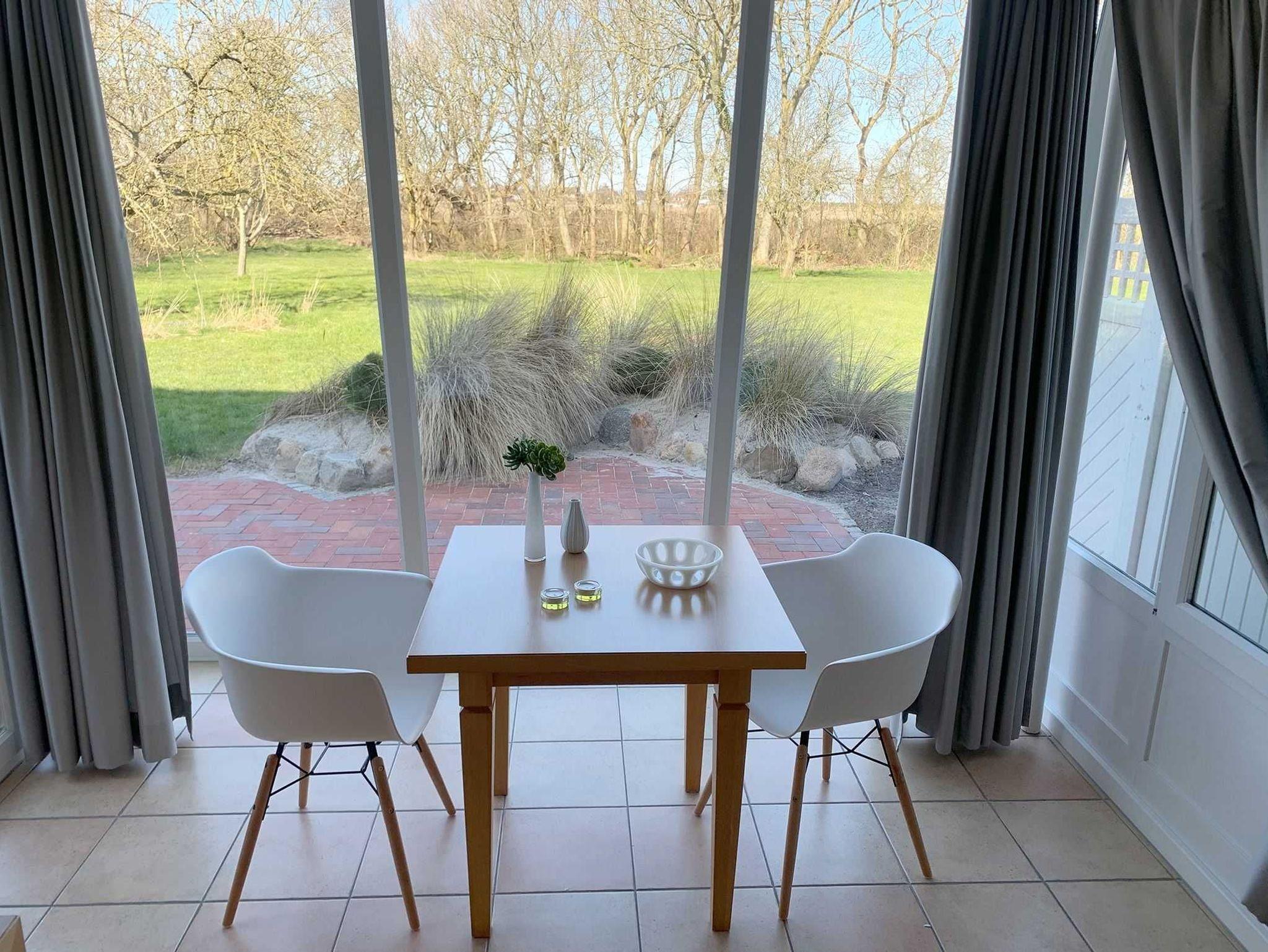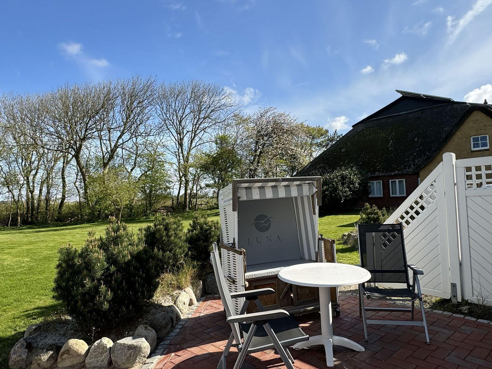 Helle, strandnahe Ferienwohnung in St. Peter-Ording mit Terrasse und Blick in den Obstgarten für erholsame Nordseeurlaubstage.