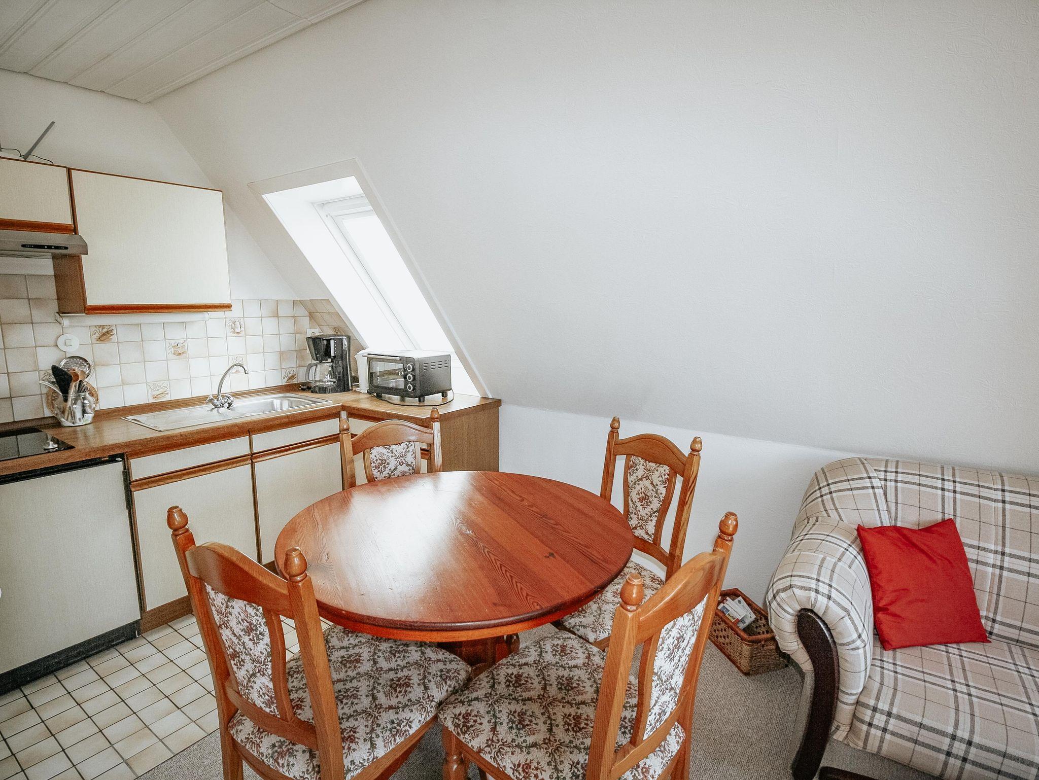 Die Ferienwohnung ist ausgestattet mit einem Wohnzimmer mit Essecke, Küchenzeile,