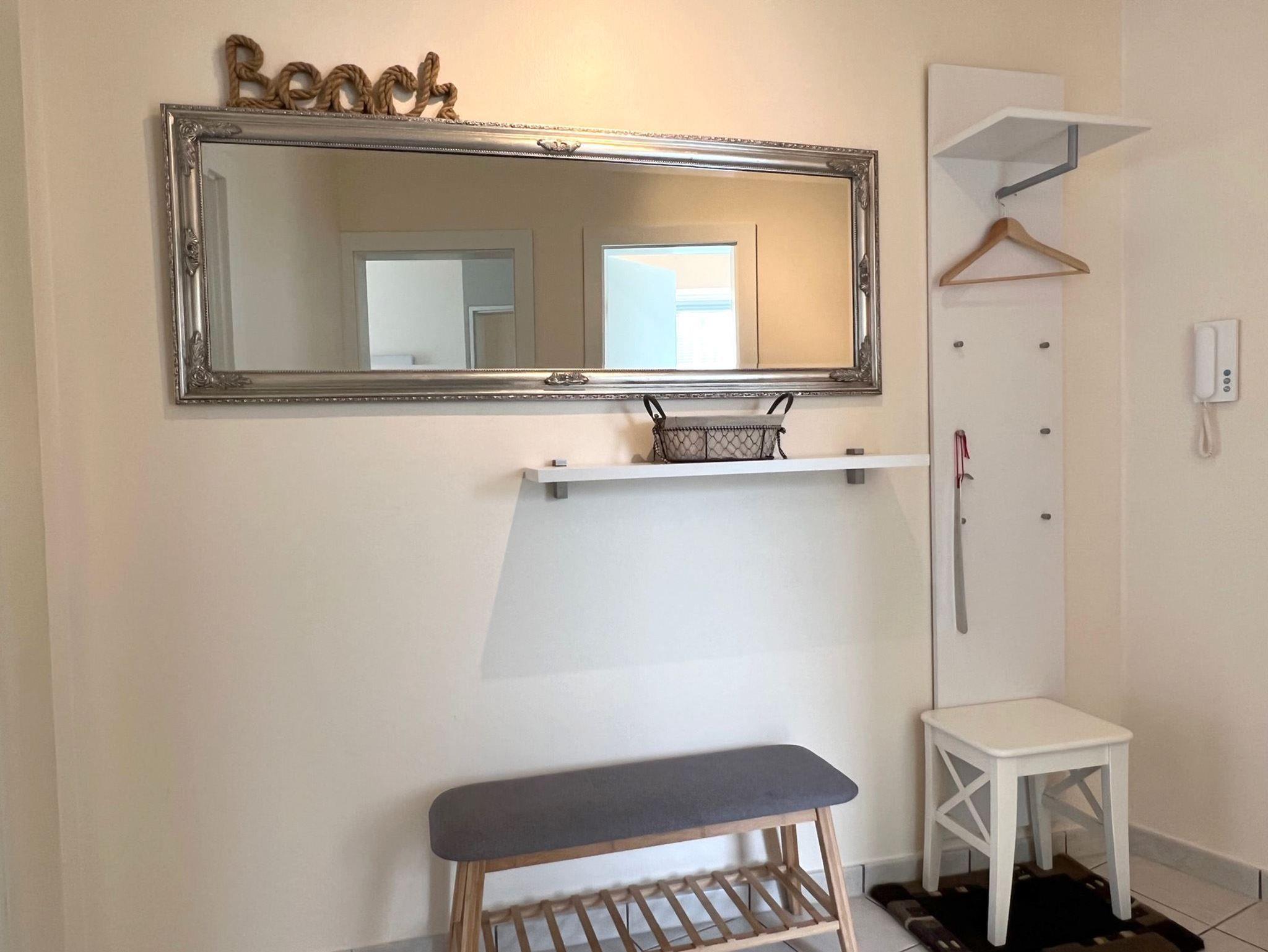 Moderne Einrichtung: Die gesamte Wohnung ist mit hochwertigen Fliesen ausgestattet und bietet moderne, gemütliche Möbel, die zum Entspannen einladen.