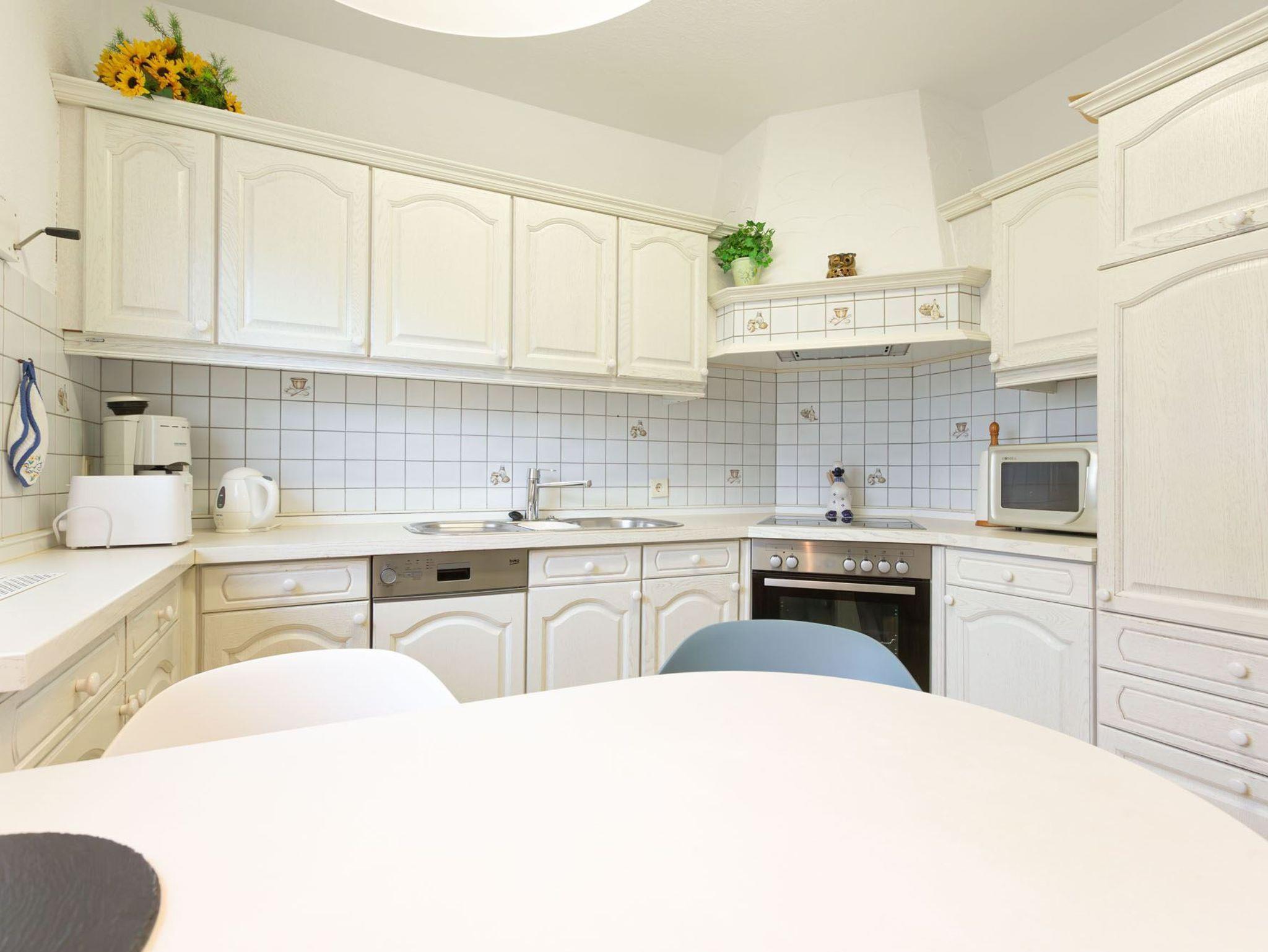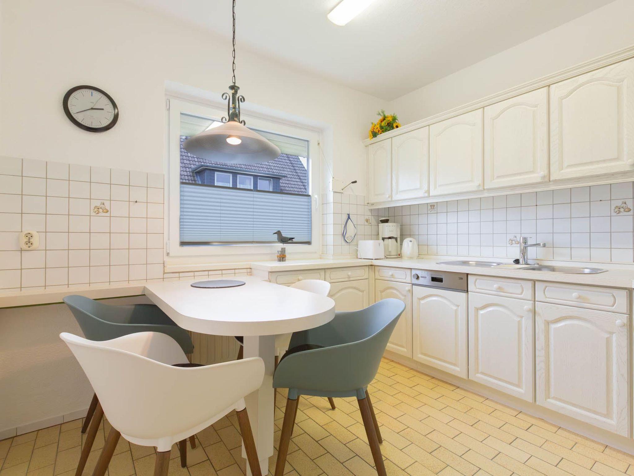 Separate Küche mit Backofen, Mikrowelle, Kühlschrank mit Gefrierfach, Geschirrspüler und Esstisch für bis zu 4 Personen.