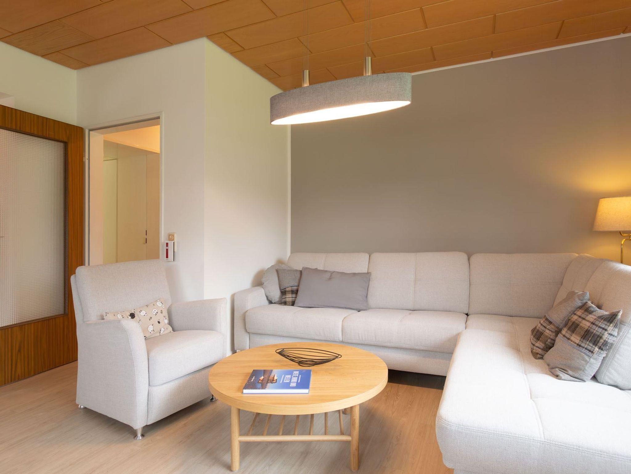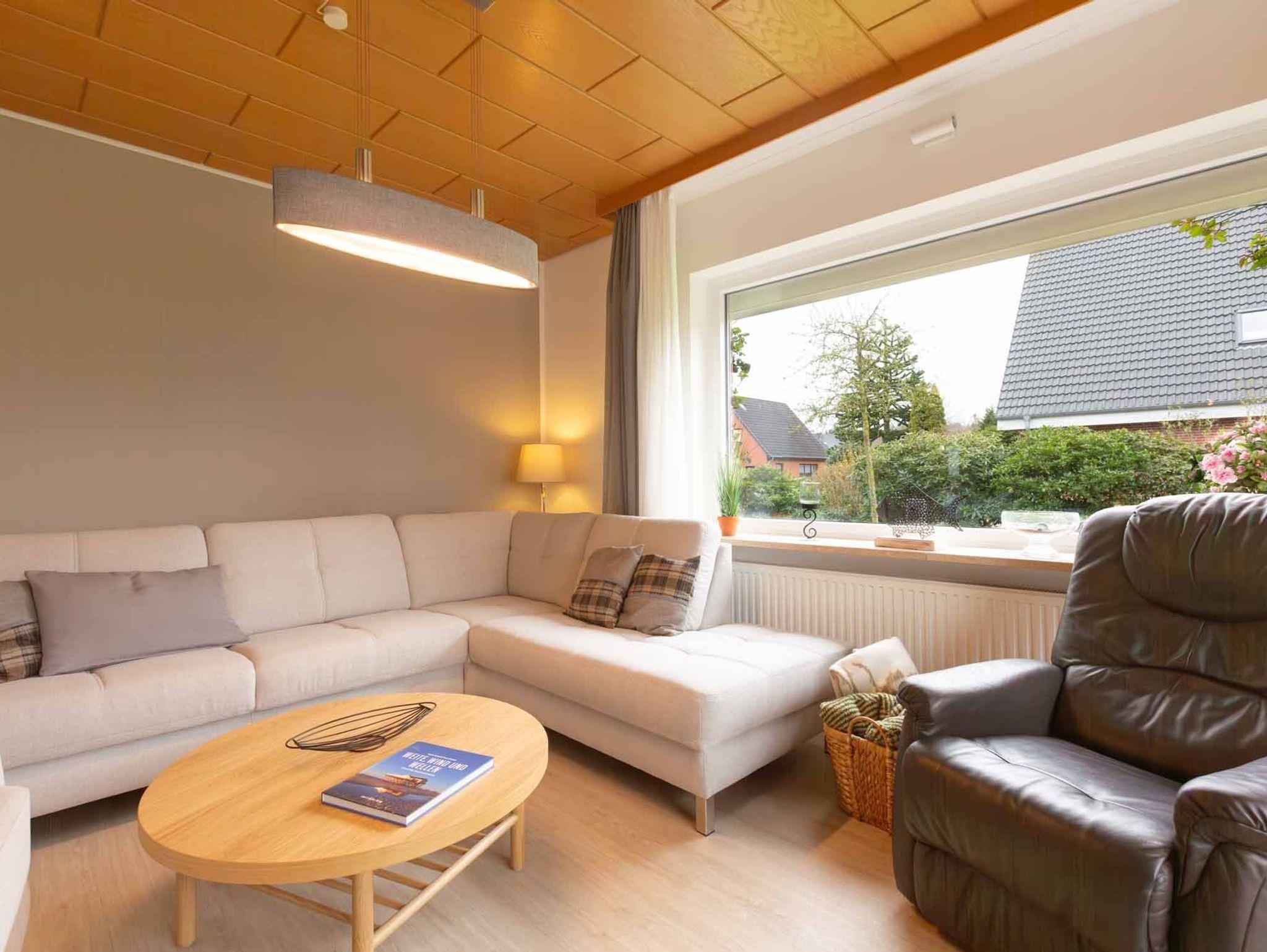 Wohnzimmer mit Ecksofa (ca. 4 Personen), Entspannungssessel, Sessel, TV (Kabel) und Stereo-Kompaktanlage. Direkter Zugang zur windgeschützten, möblierten Gartenterrasse nach Südwesten mit Strandkorb.