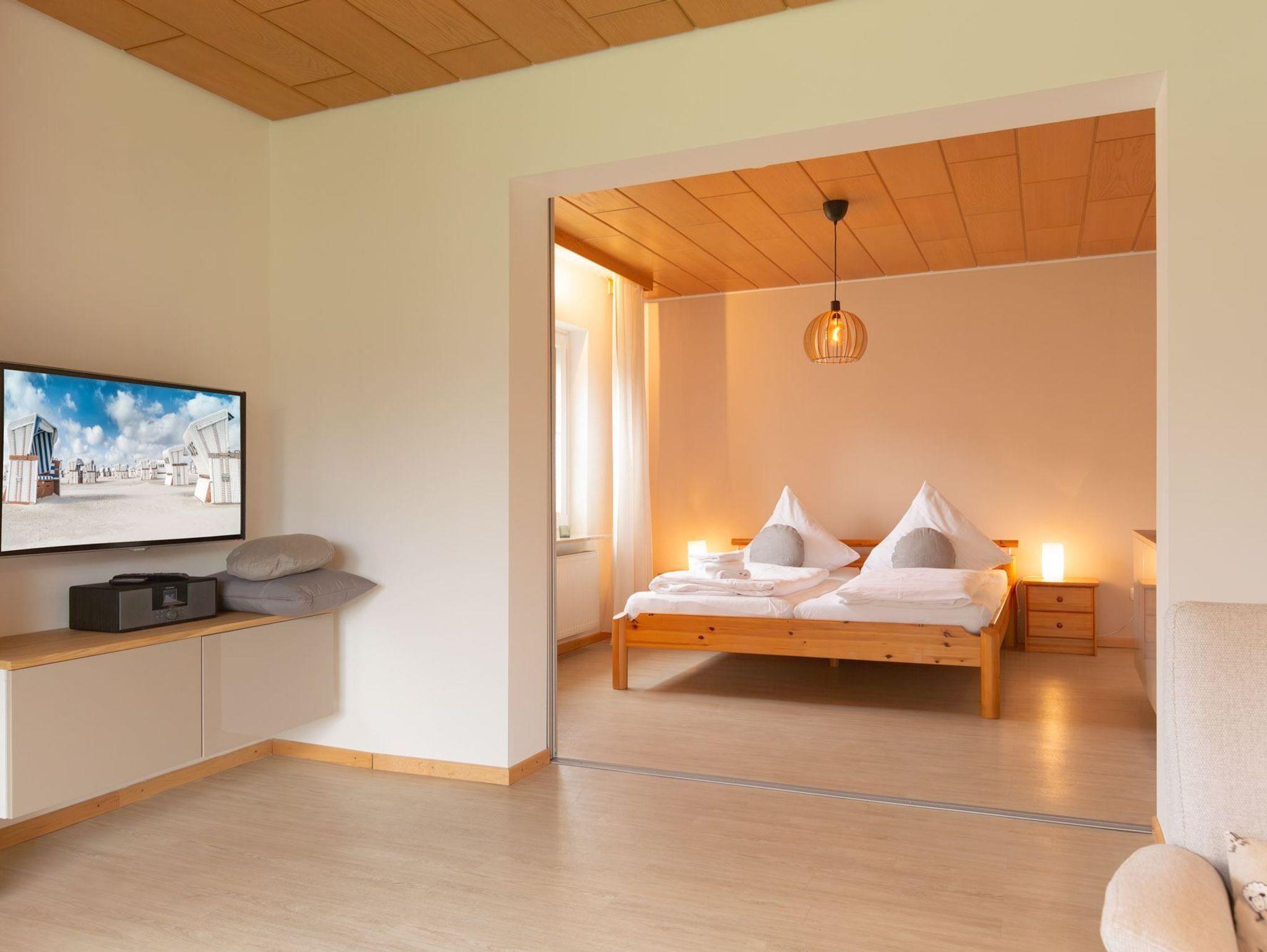 1. Schlafzimmer mit Doppelbett (2x 90x200cm) und Kleiderkommode. Dieses Schlafzimmer ist durch eine Schiebetür vom Wohnzimmer abgeteilt.