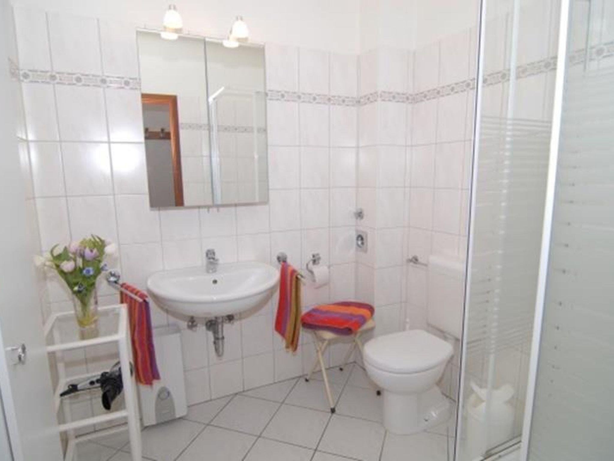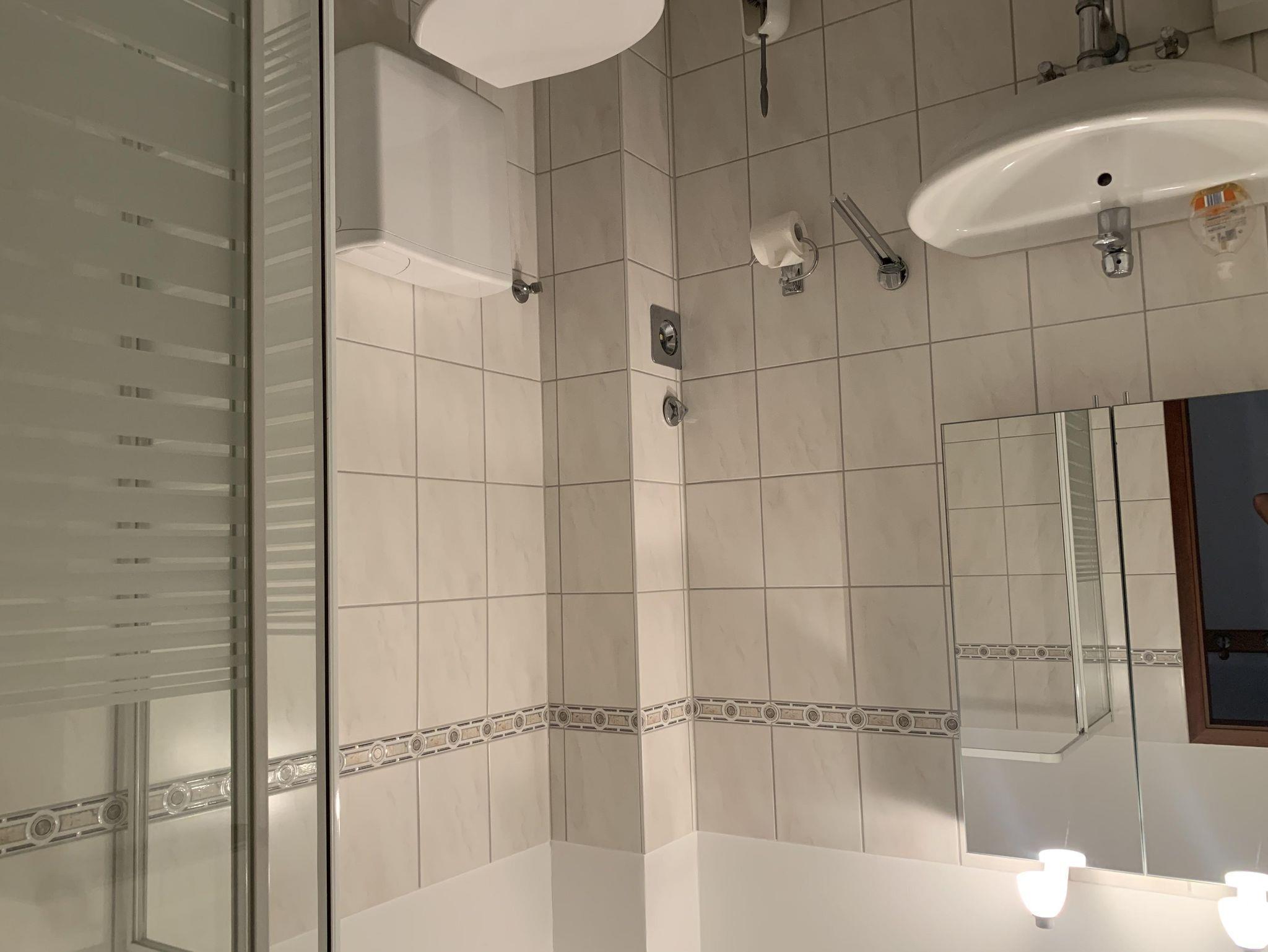 Bad: Dusche, Waschbecken, WC, Regal, Hocker, Schrank, Spiegelschrank, Fön, Duschkabine