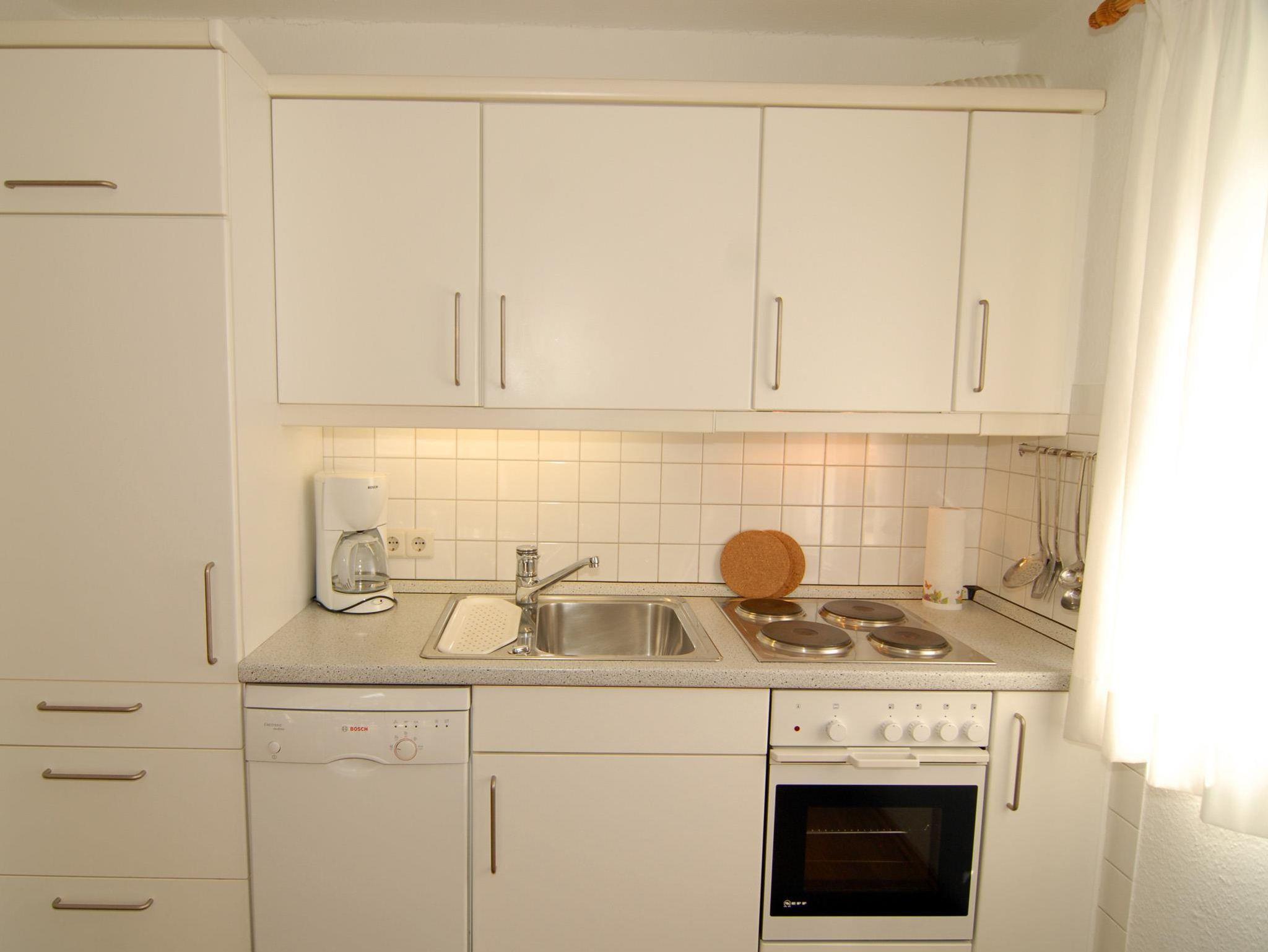 Wohnzimmer: Couch, Couchtisch, 2 Korbsessel, Vitrinenschrank, Korbtruhe, Staubsauger, 2 Nachtspeicheröfen, Stehlampe, TV-Schrank, Flachbildschirm, Sat-TV, DVD-Player, Radio, Stuhl, Esstisch, 4 Stühle, Küchenzeile, 4 Plattenherd mit Backofen, Dunstabzugshaube, Kühlschrank, Spülmaschine, Kaffeemaschine, Wasserkocher, Toaster, Geschirr, Kochtöpfe