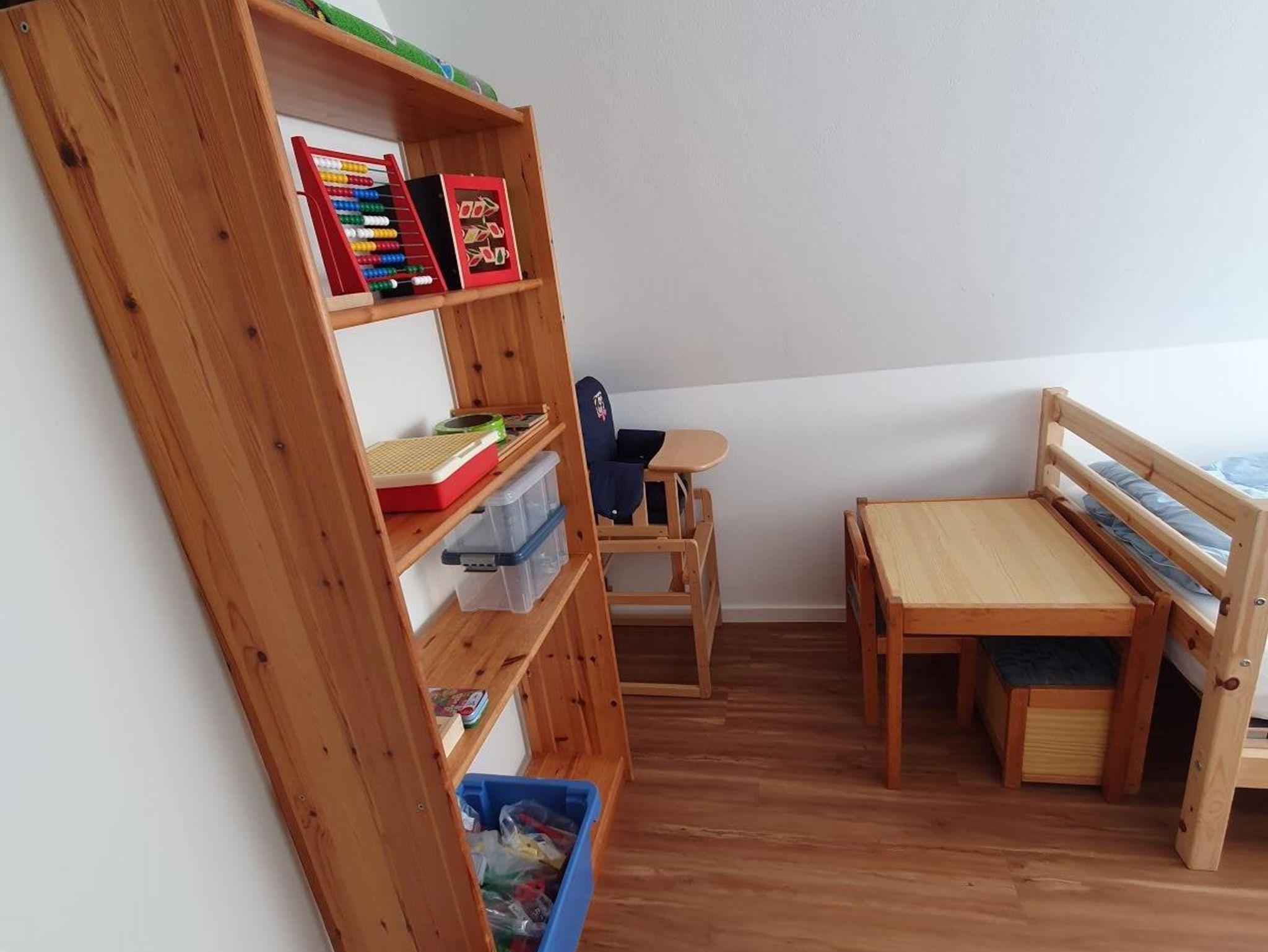 Kinderspieltisch, Kinderstühle, Spielzeug und Bücher für gross und klein.