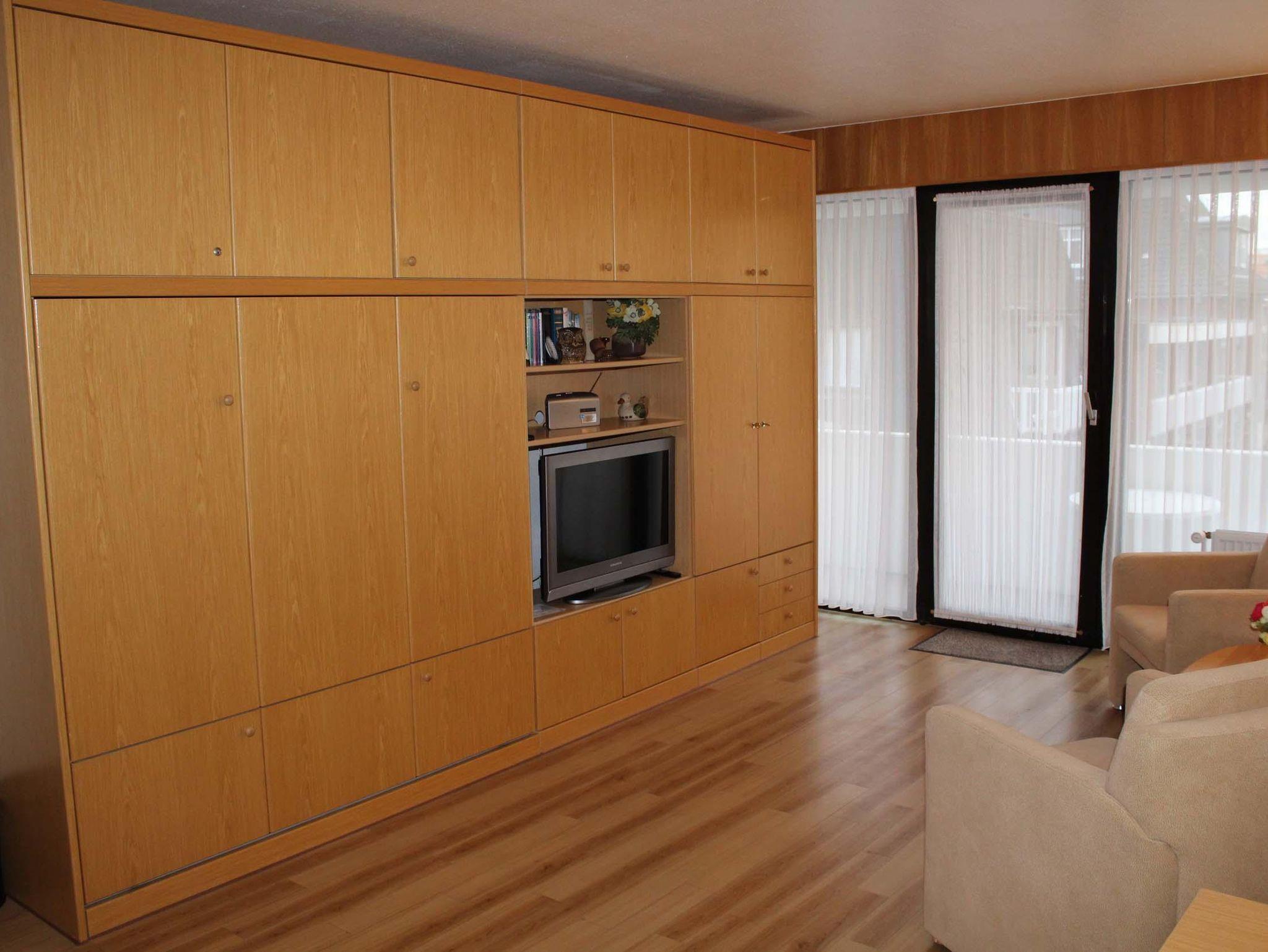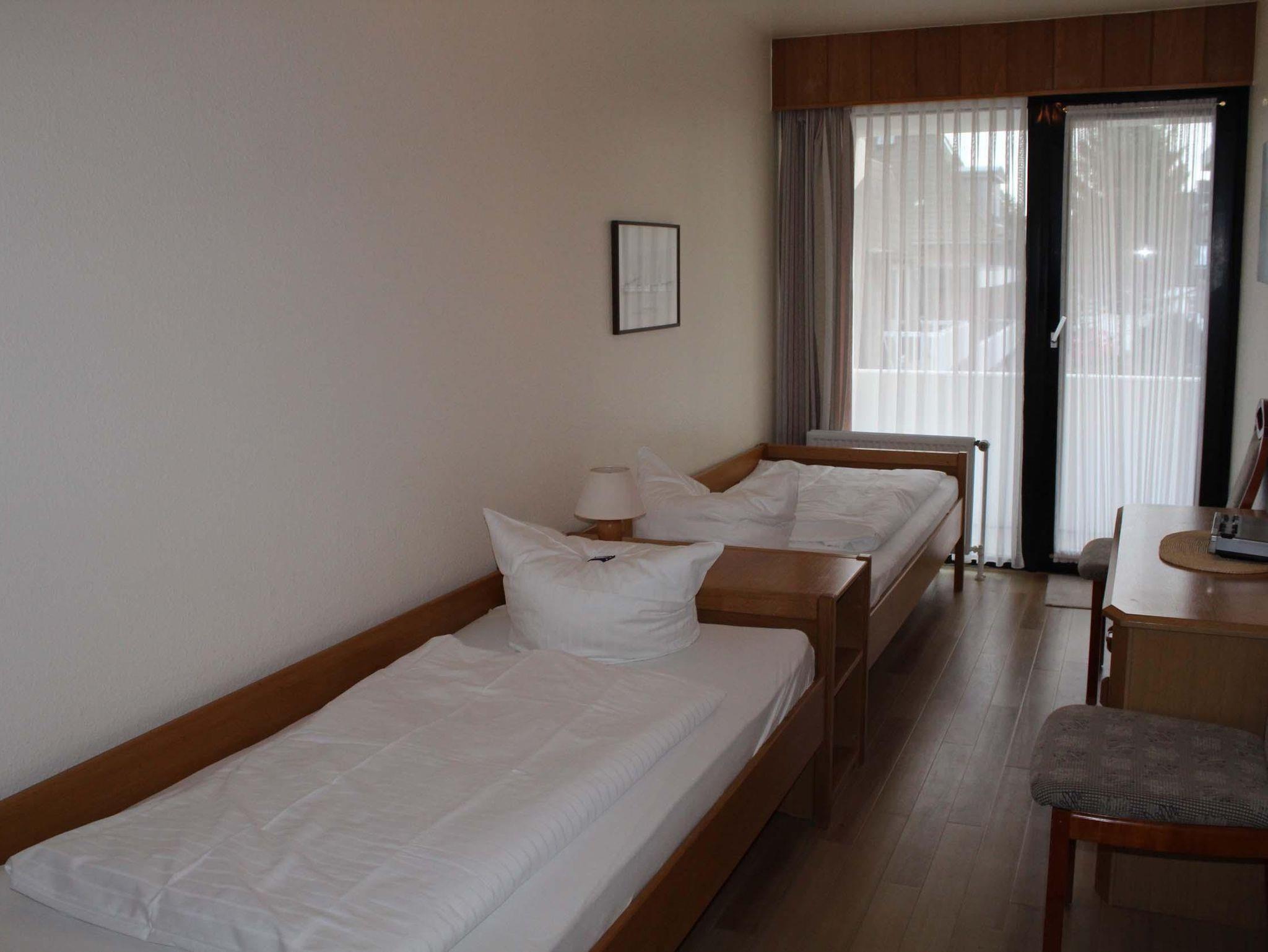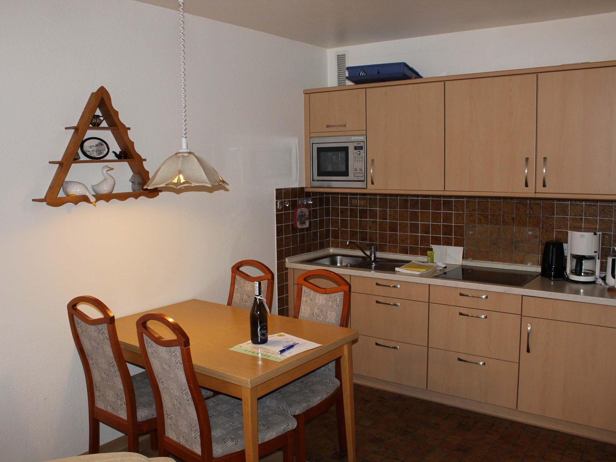 Schlafraum mit 2 Einzelbetten, Wohn-Schlafraum mit 2 Wandschrankbetten, PVC-Fußboden, Sitzecke, Essecke, Küchenzeile mit Mikrowelle, Dusche/WC, Kabel-TV, Durchwahltelefon, Balkon, PKW-Platz-Nr. 36, Aufzug und Fahrradkeller.