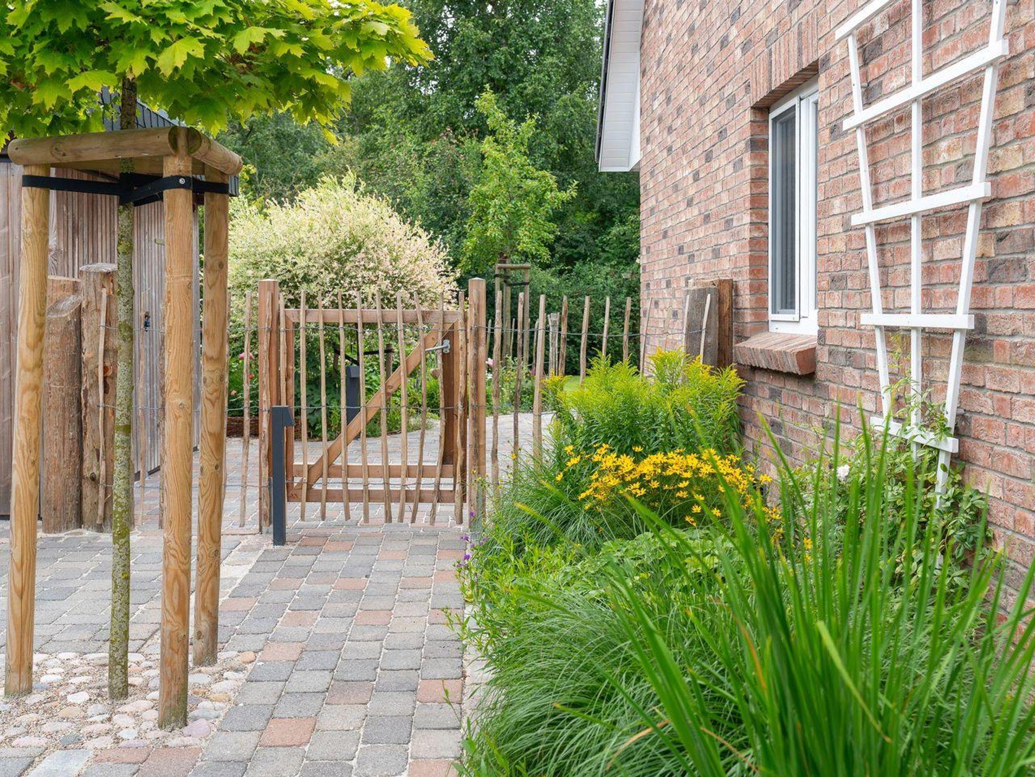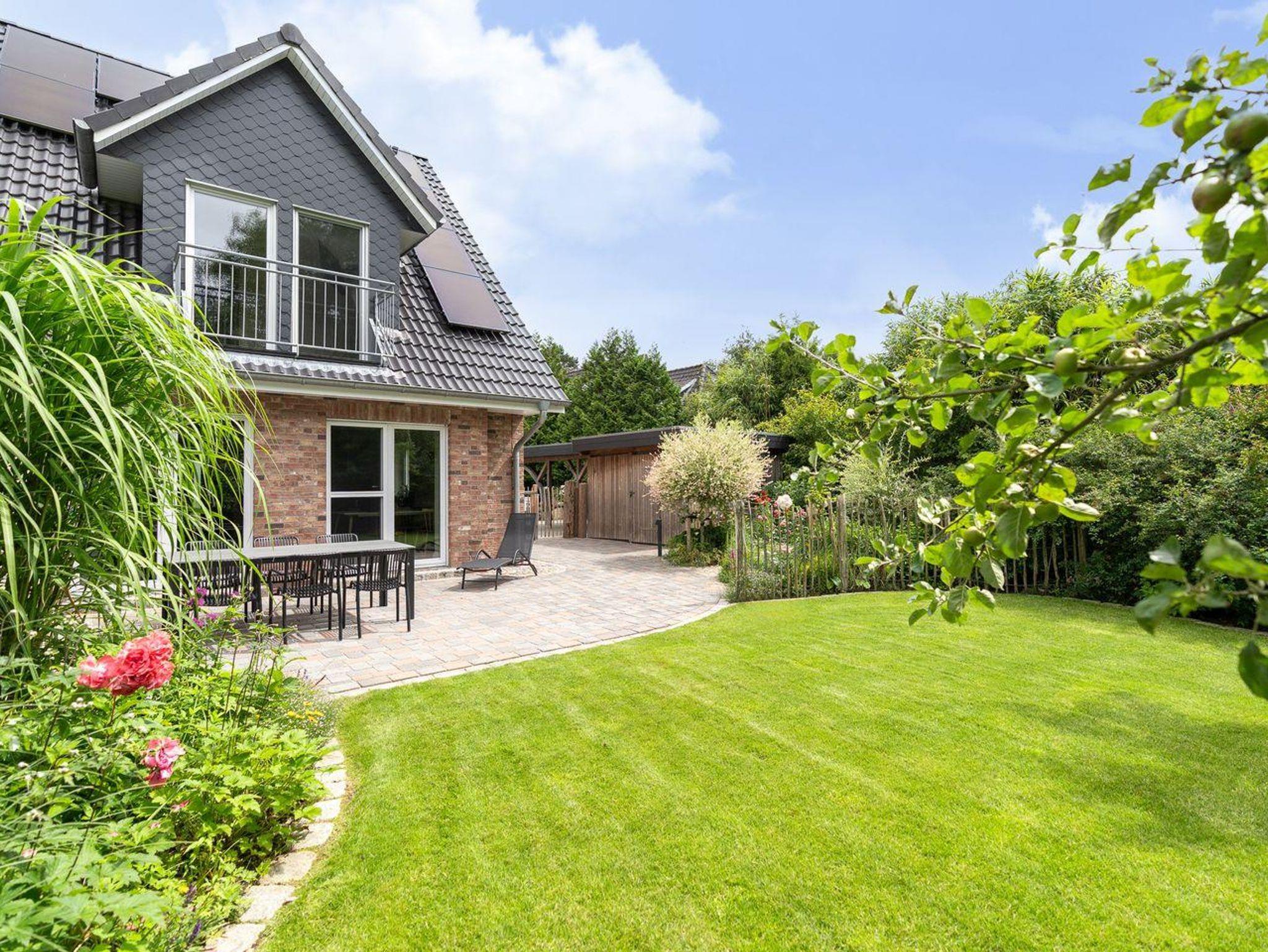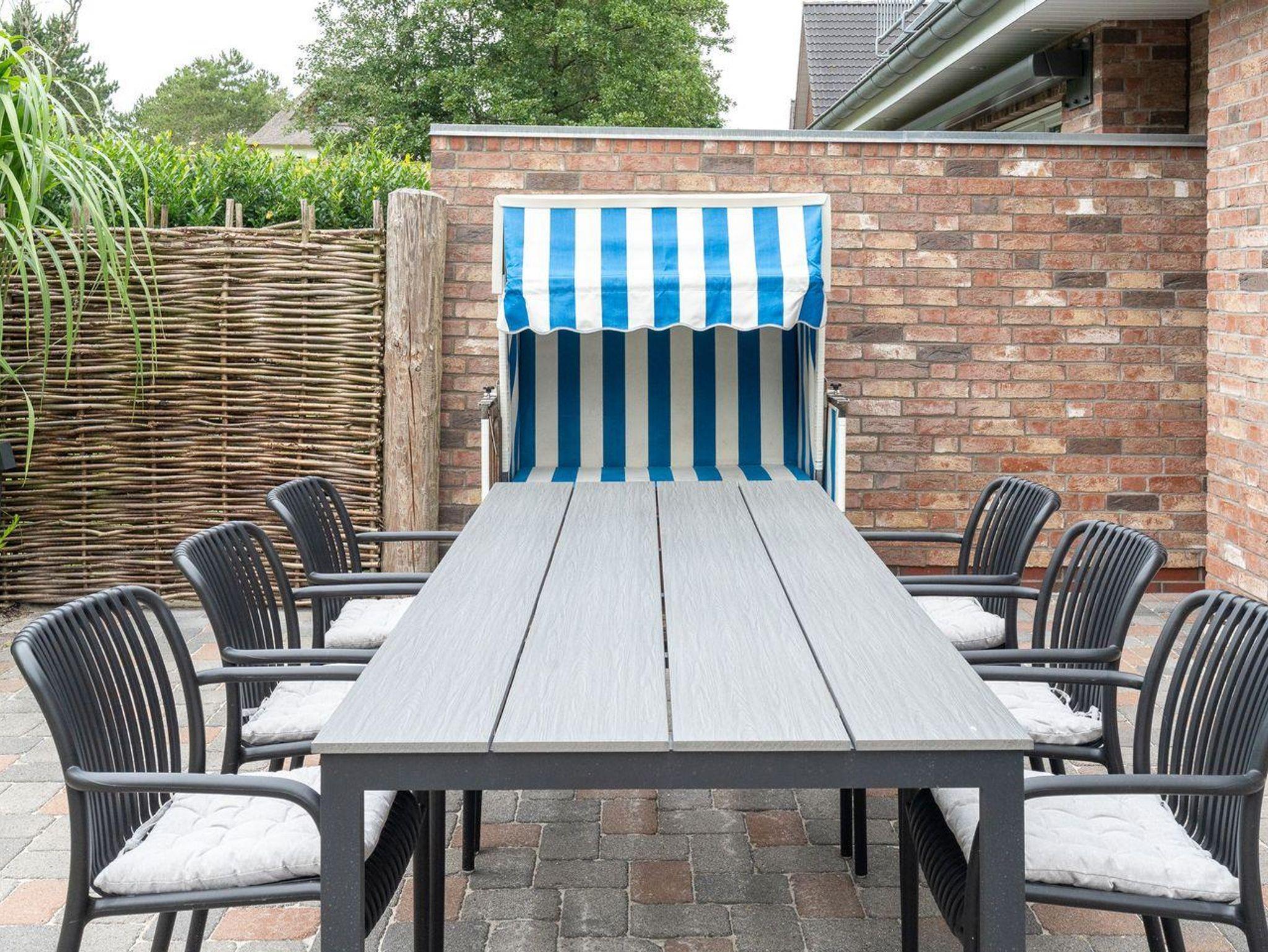 Die Terrasse im eingezäunten Garten lädt zum Entspannen ein und bietet die Möglichkeit, die frische Nordseeluft zu genießen.
