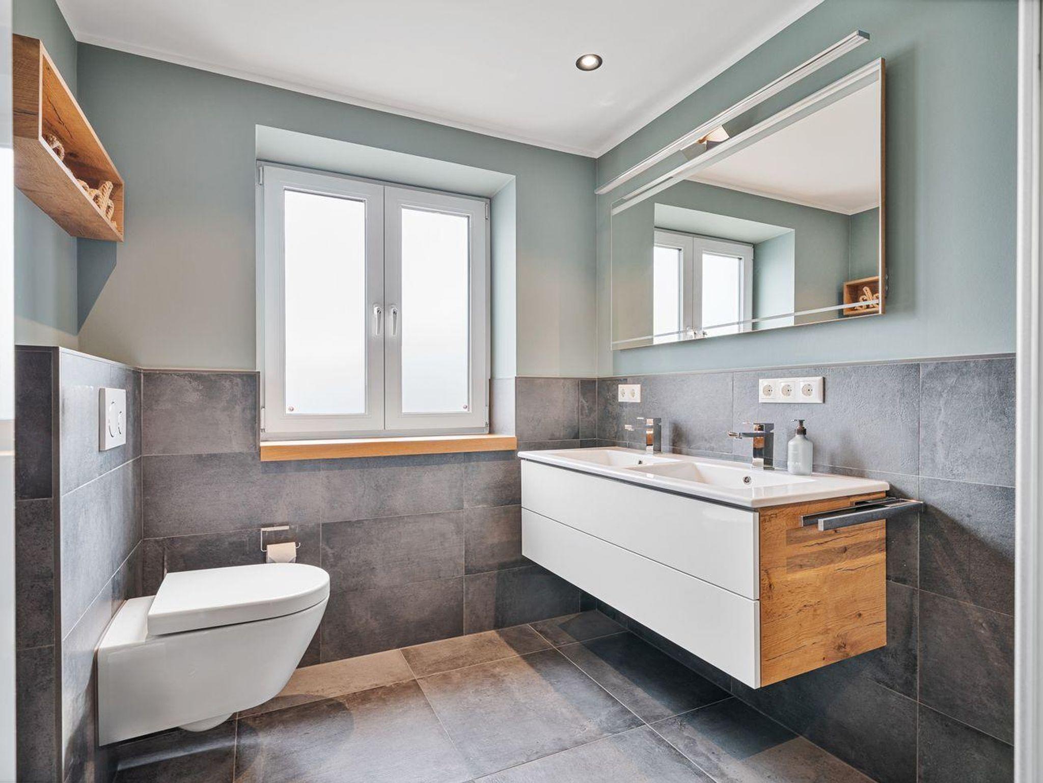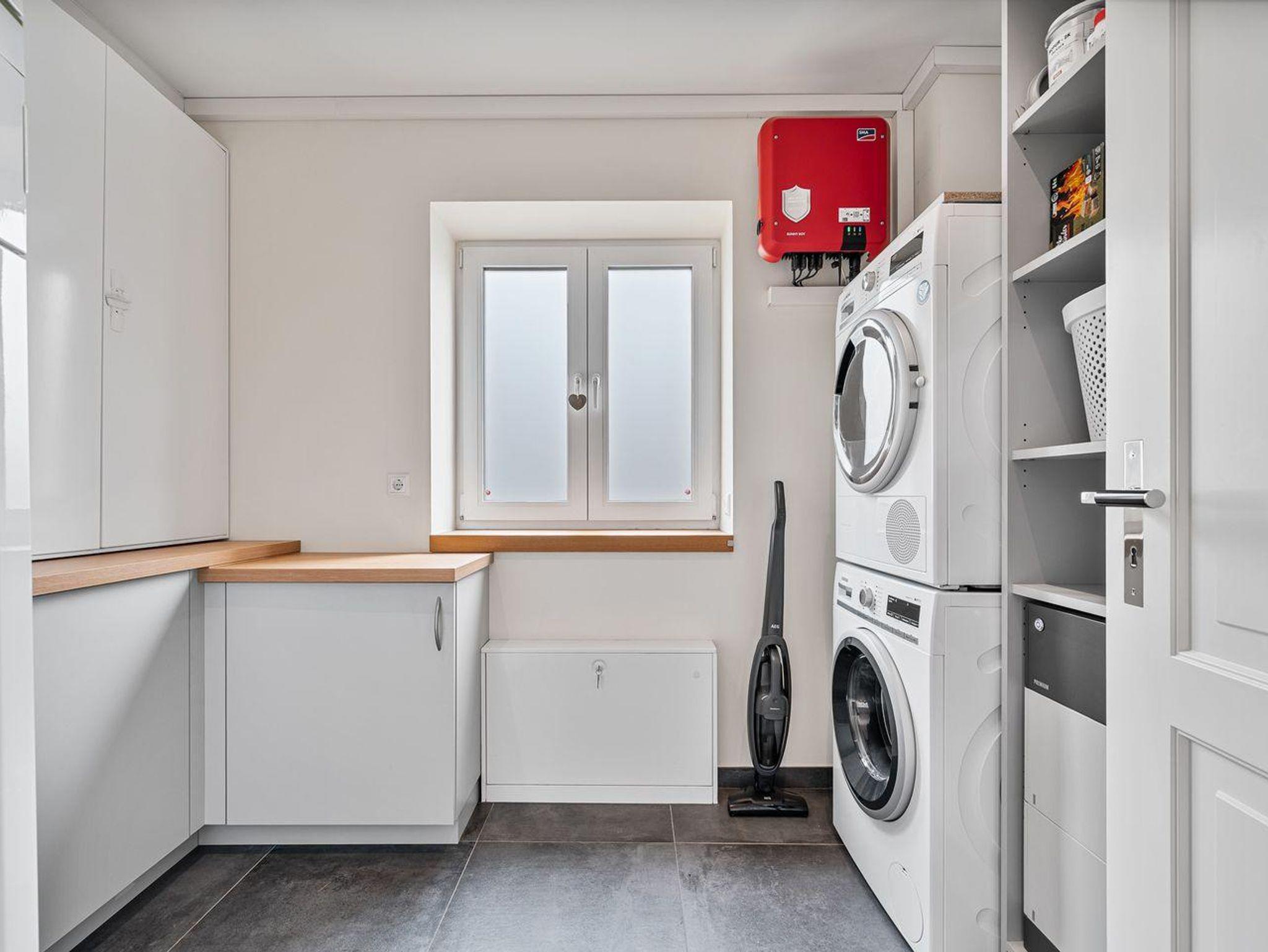 Vom Flur mit Garderobe, welche ausreichend Platz für Jacken und Schuhe bietet, gelangen Sie in ein Duschbad, sowie in den Hauswirtschaftsraum mit Waschmaschine und Trockner.