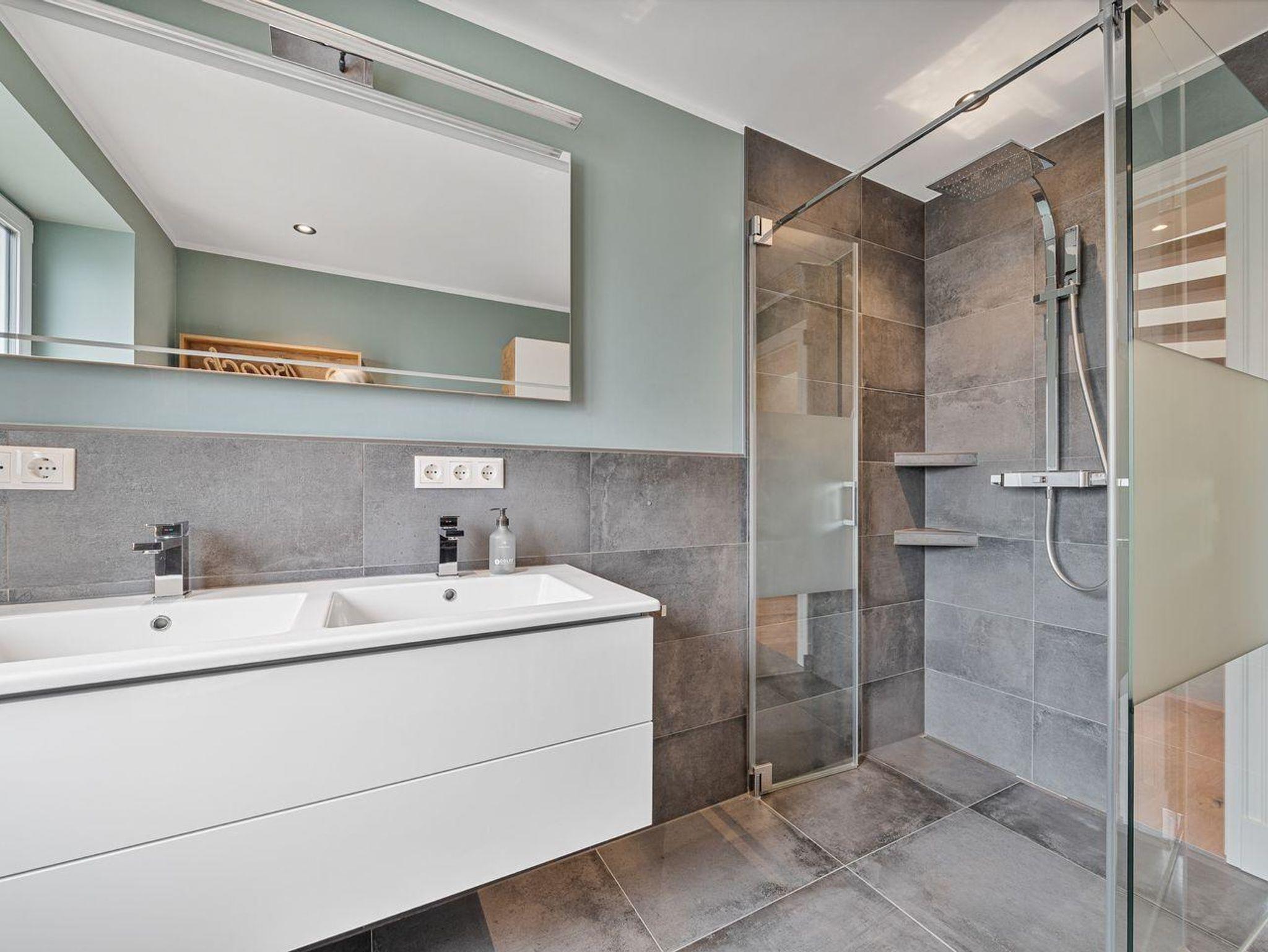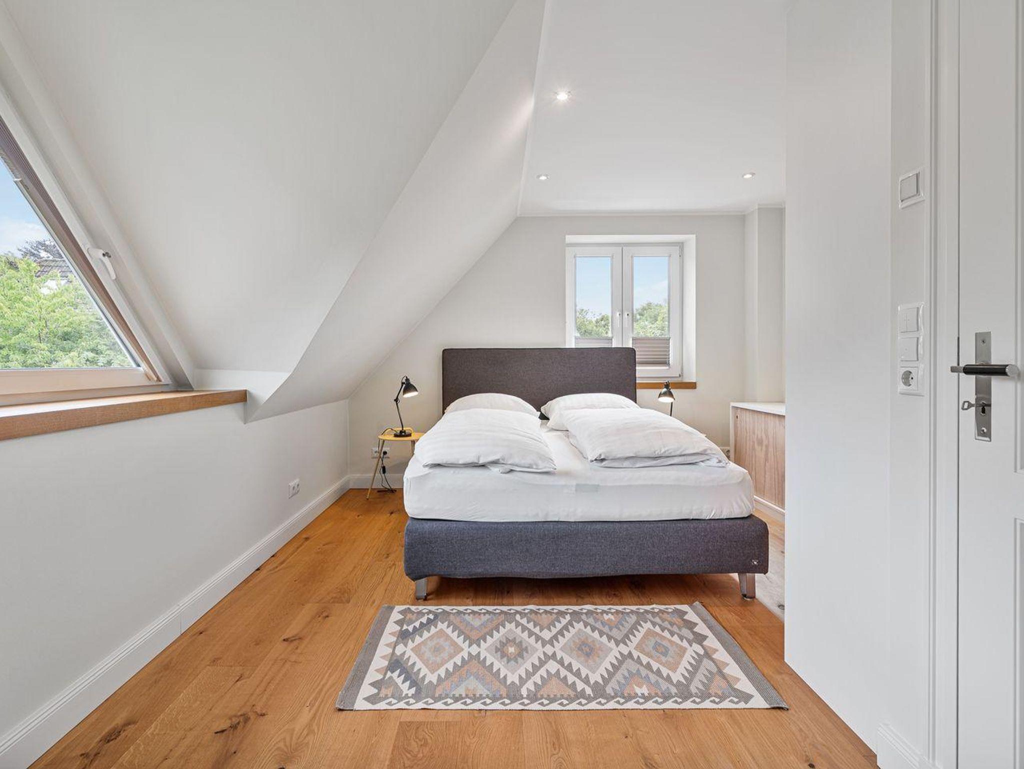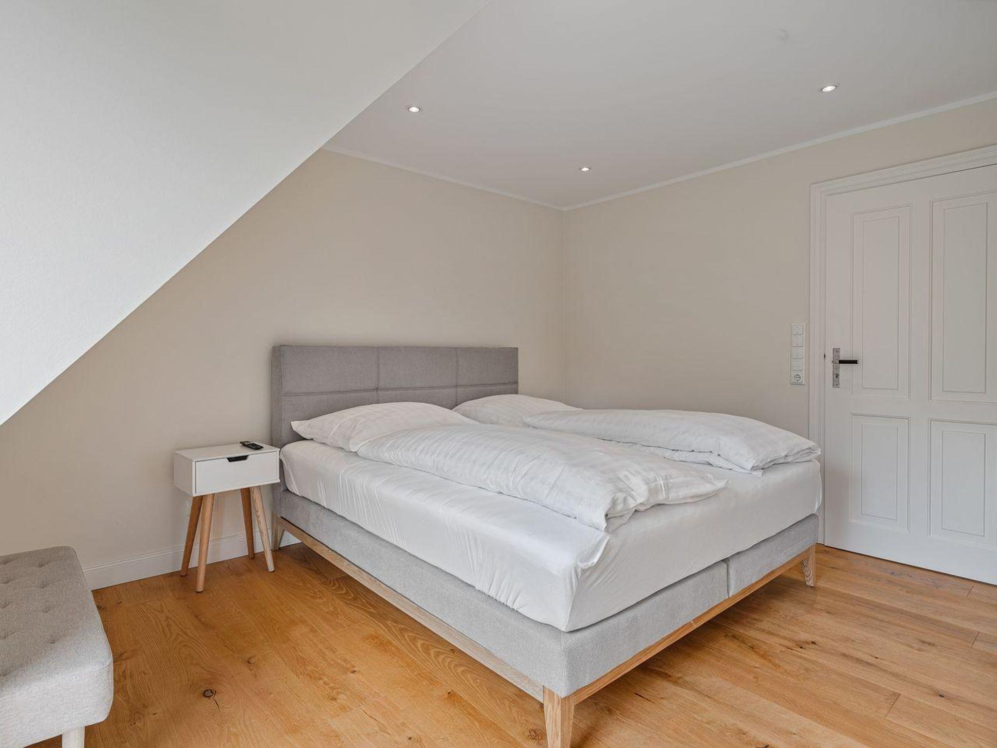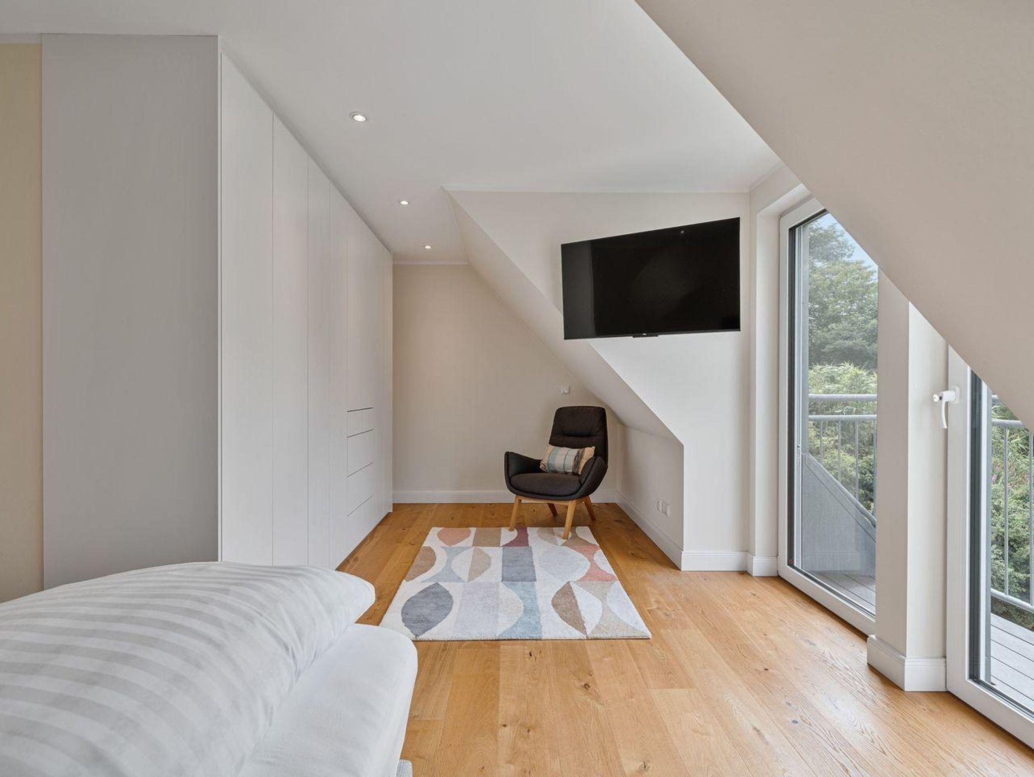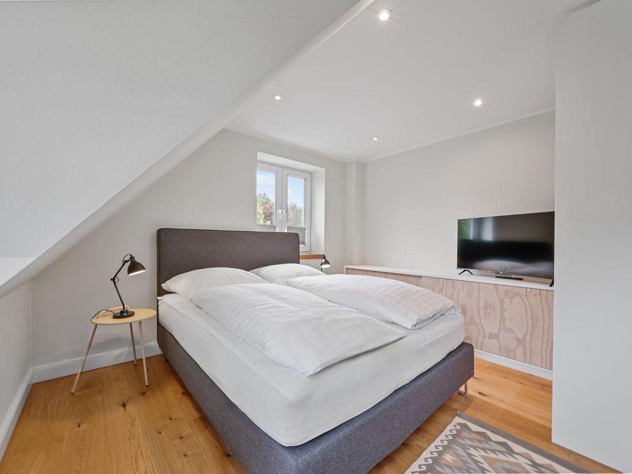 Zwei Schlafzimmer mit je einem Boxspring-Doppelbett (180x200 & 140x200 m) sind ausgestattet mit TV und großen Kleiderschränken. Darüber hinaus befindet sich im Obergeschoss ein weiteres Bad mit Dusche.