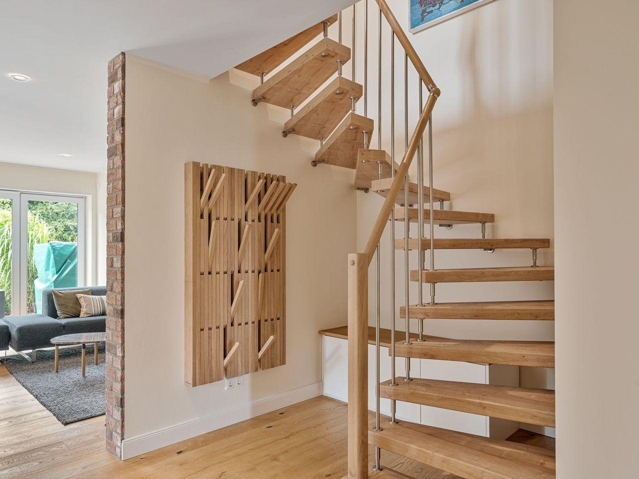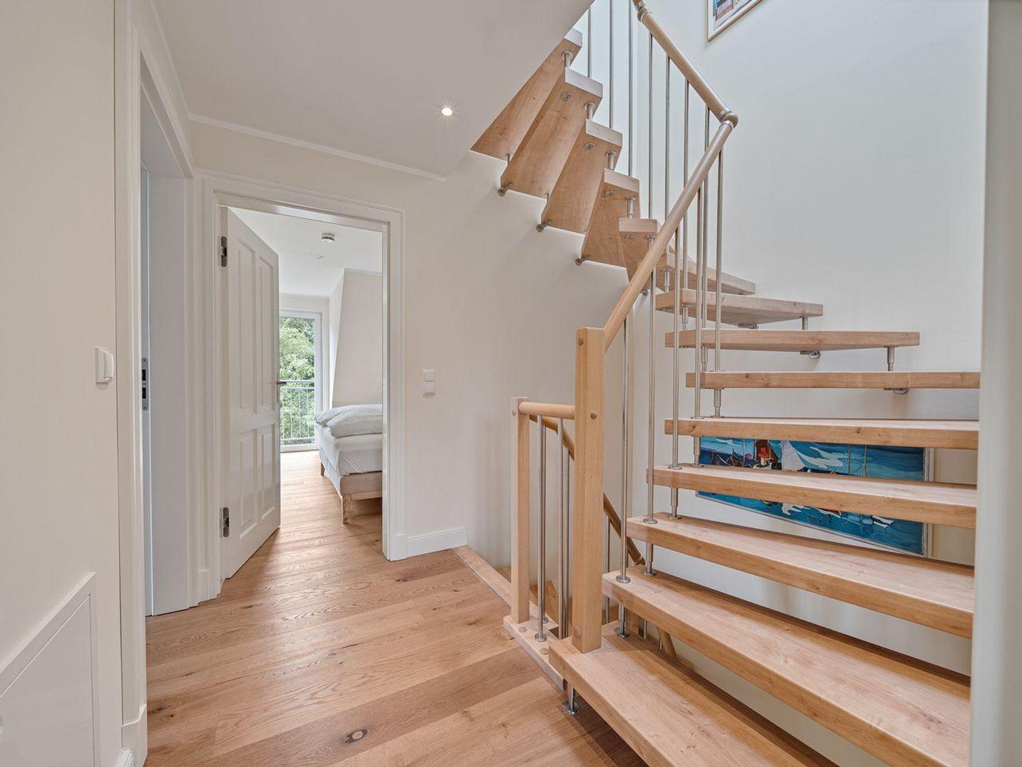 Über eine Holztreppe gelangen Sie in das Obergeschoss.