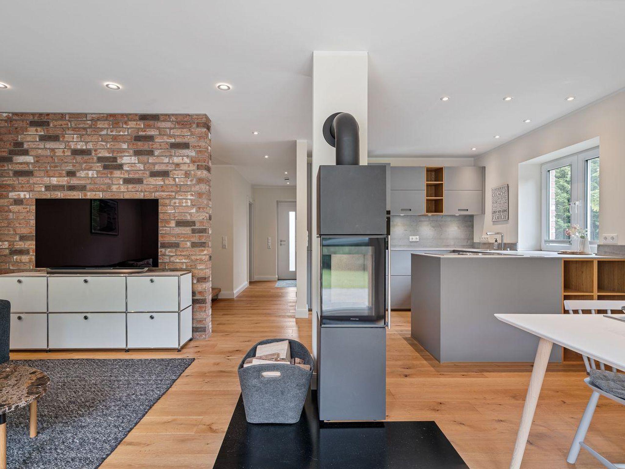 Im Erdgeschoss erwartet Sie ein lichtdurchflutetes Wohnzimmer mit einem Ecksofa, einer offenen Küche sowie einem Essbereich.