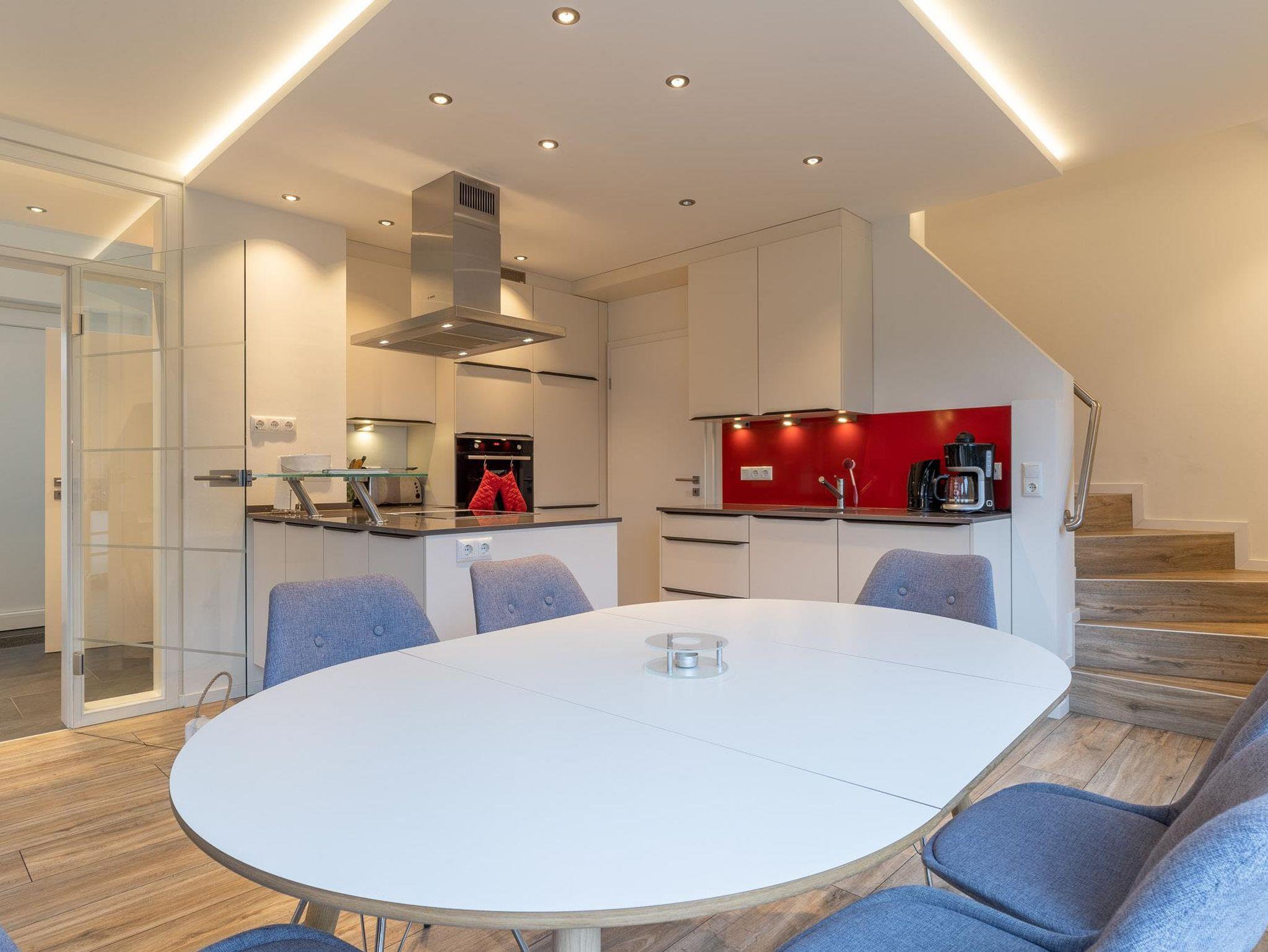 Cerankochfeld, Kaffeemaschine, Mikrowelle, Geschirrspülmaschine, Wasserkocher, Mixer, Toaster, Pürierstab, ausreichend Besteck und Geschirr für jeweils 6 Personen. Jede Wohnung verfügt im Elternschlafzimmer (DG) über ein Doppelbett 180 x 200 cm, im Kinderzimmer (DG) über ein Etagenbett 90 x 200 cm, in einem weiteren Kinderzimmer im Erdgeschoss über ein Einzelbett mit Ausziehbett („Freundschaftsbett“) 90 x 190 cm. Das Bad im OG verfügt jeweils über ein Doppelwaschbecken, WC, Dusche, einen Handtuchtrockner und einen Fön.