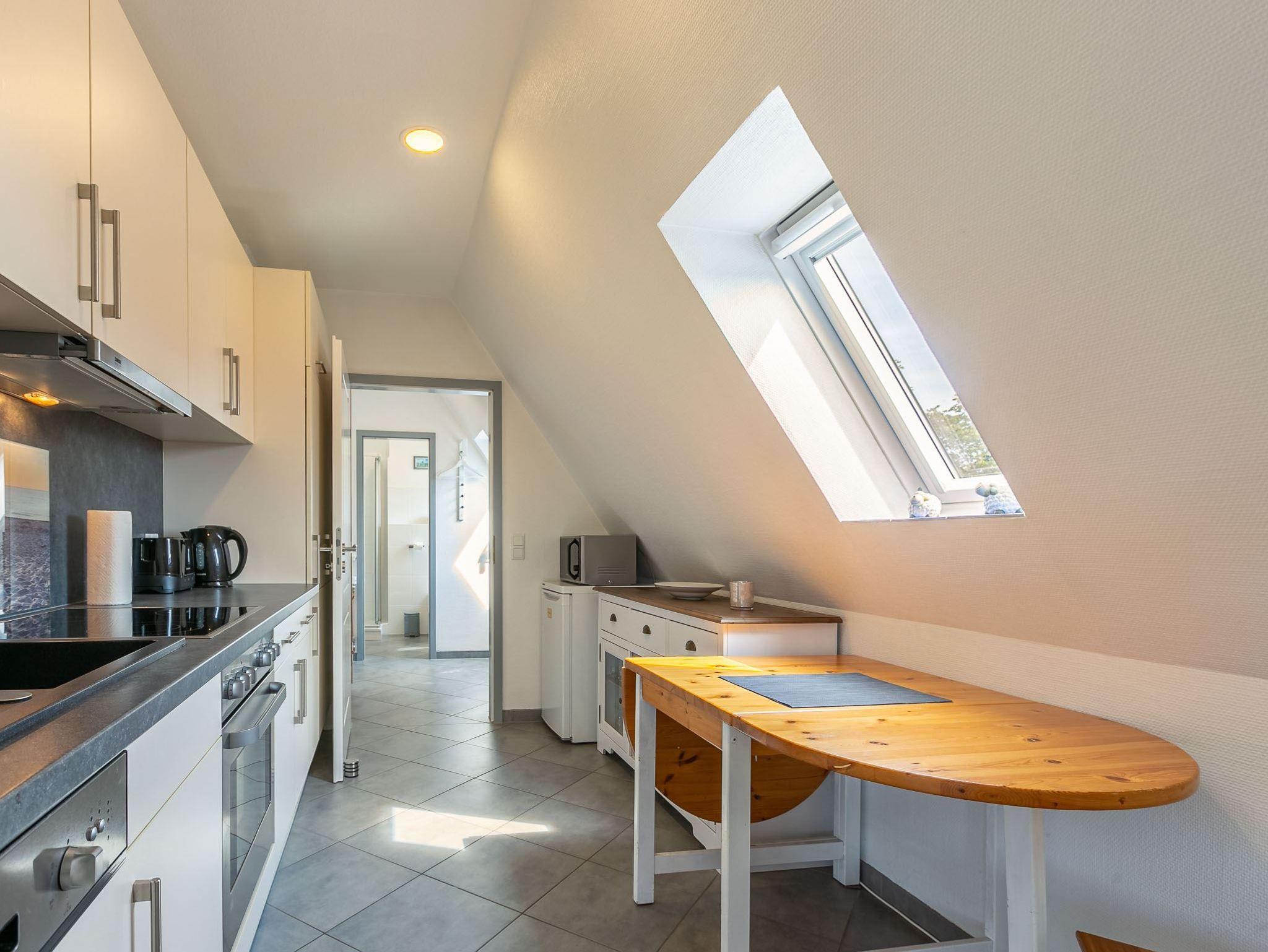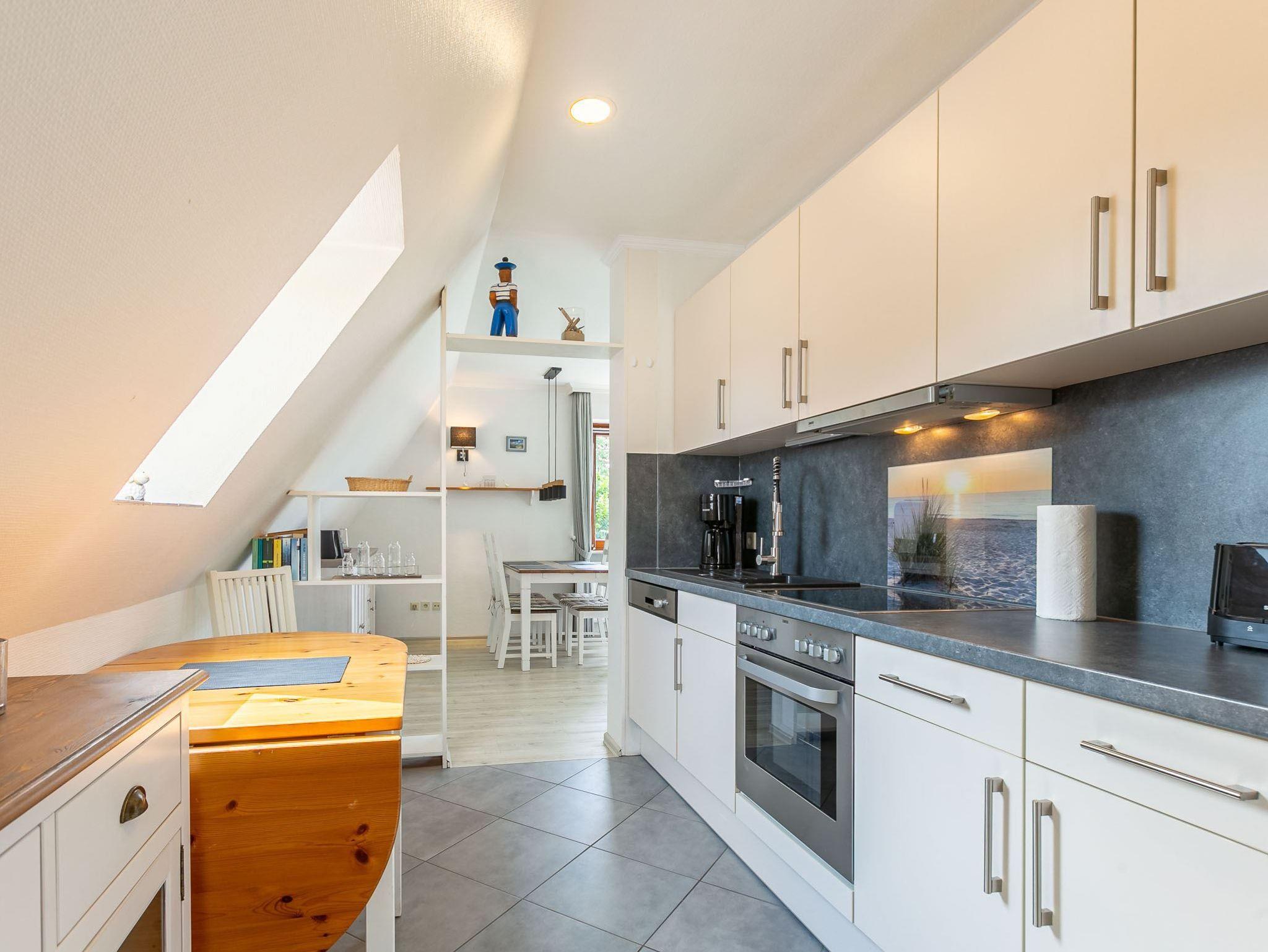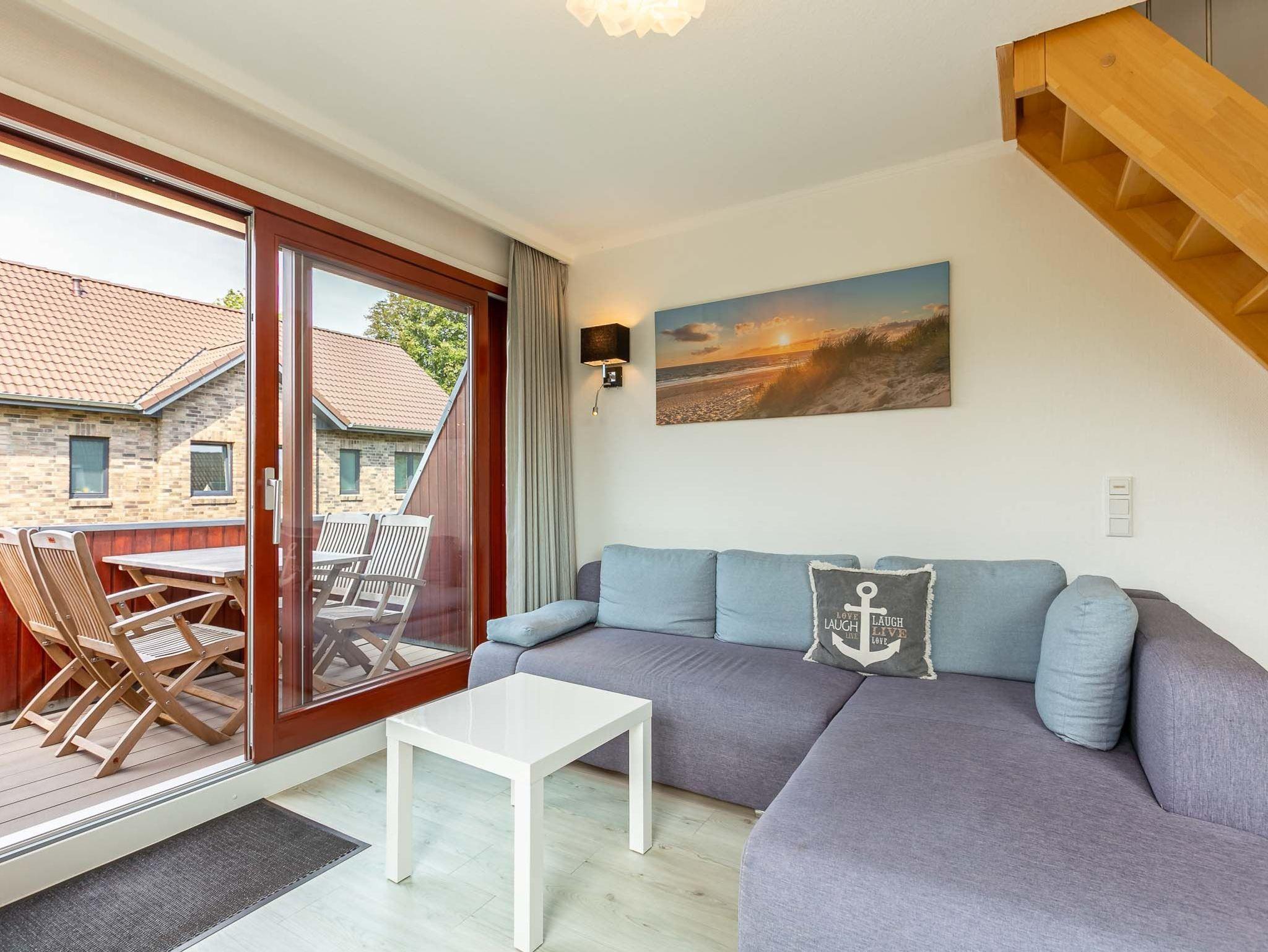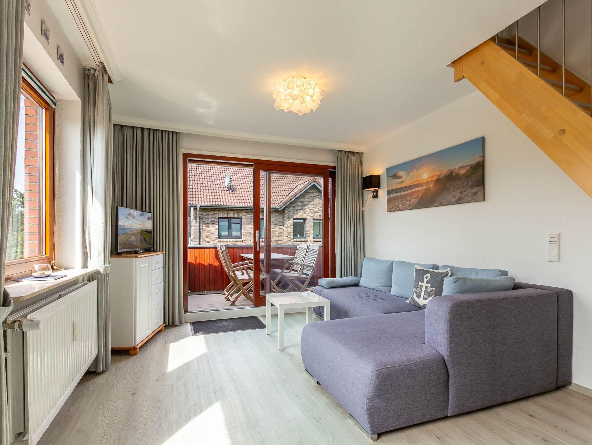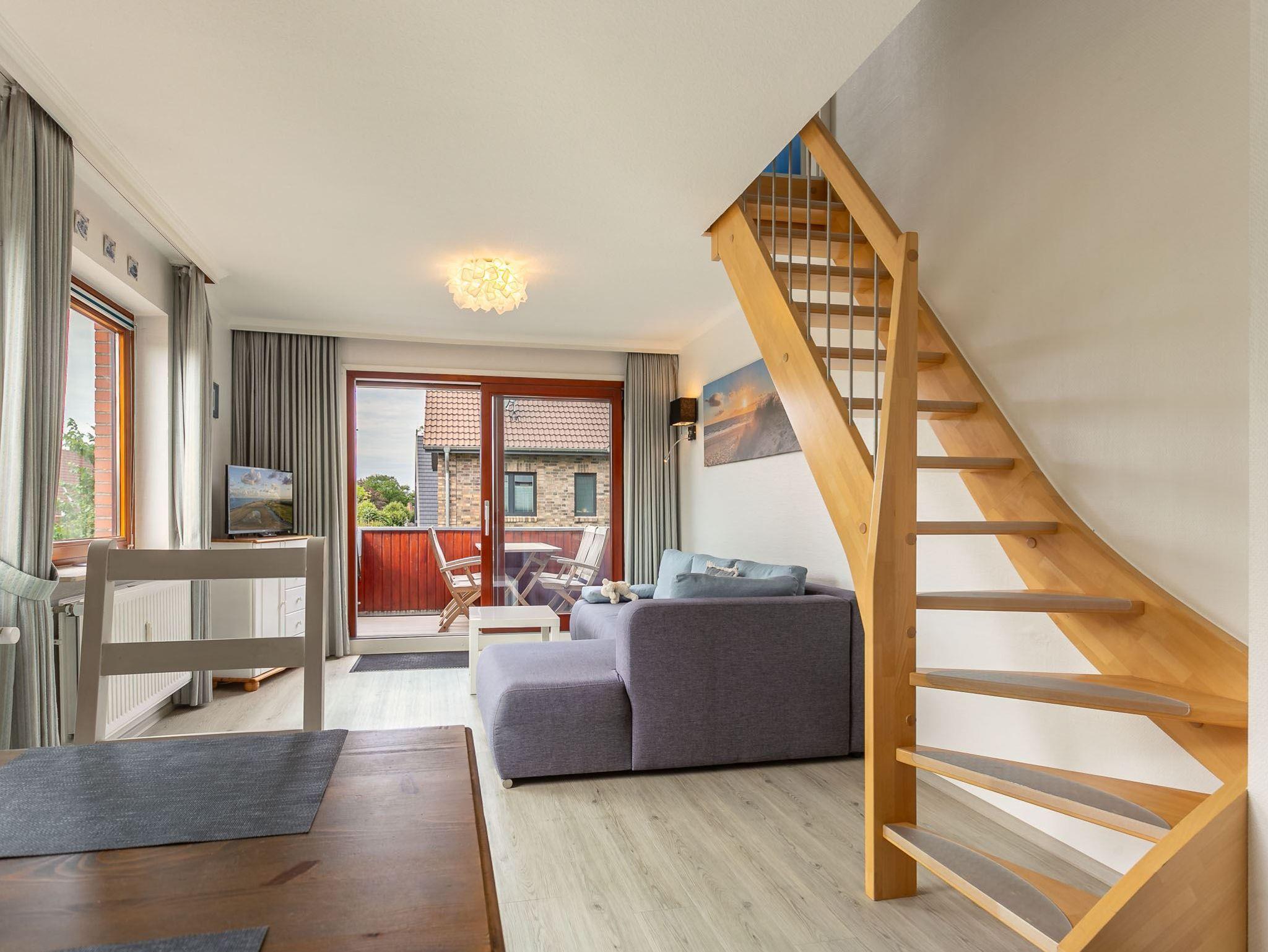 Wohnzimmer mit (ausklappbarem Schlaf-) Sofa (140x200cm), SMART-TV (Sat) und Esstisch für 4 Personen. Direkter Zugang zum möblierten und windgeschützten West-Balkon mit Markise. Vom Wohnzimmer führt eine steile Treppe zum Schlafzimmer. Offene Küche mit Backofen, Mikrowelle, Geschirrspüler, Kühlschrank, sep. Gefrierschrank, Philips Senseo Kapsel-Kaffeemaschine und Frühstückstisch für 2 Personen.