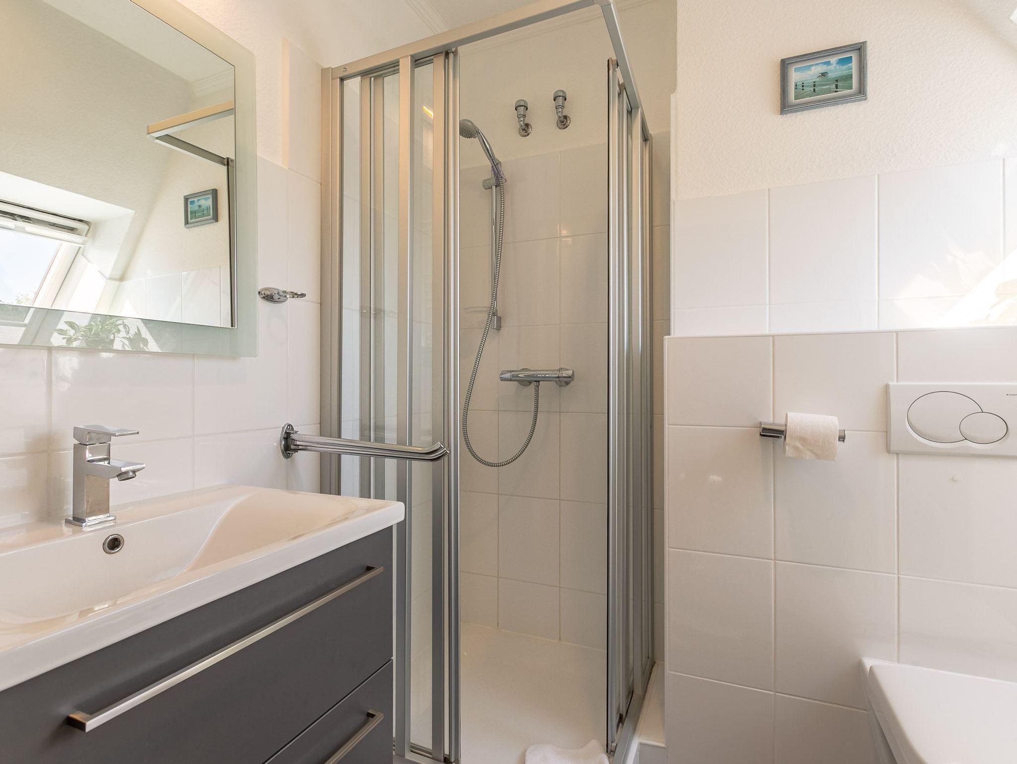 Badezimmer (Duschbad) mit Dusche, WC, Handtuchheizung, Tageslicht und Föhn.