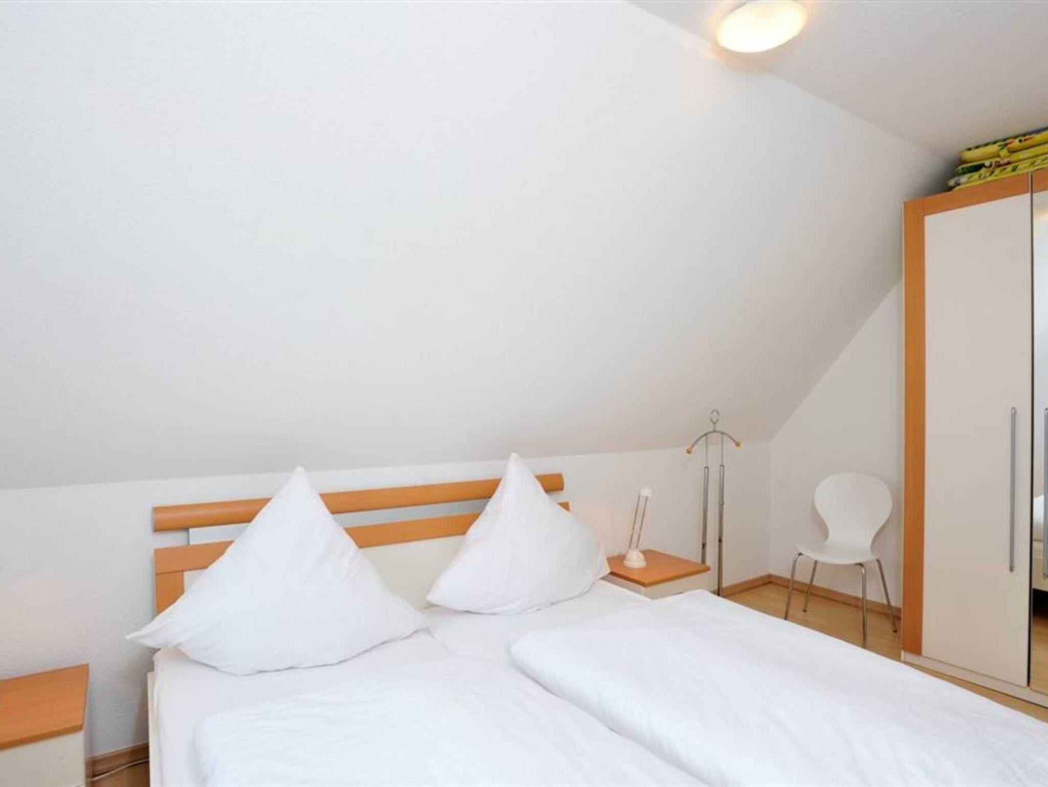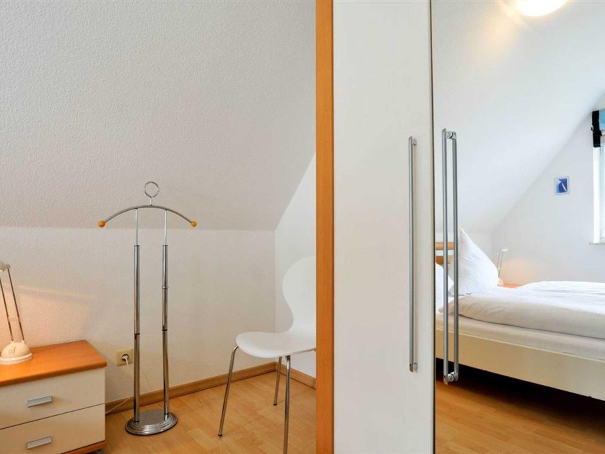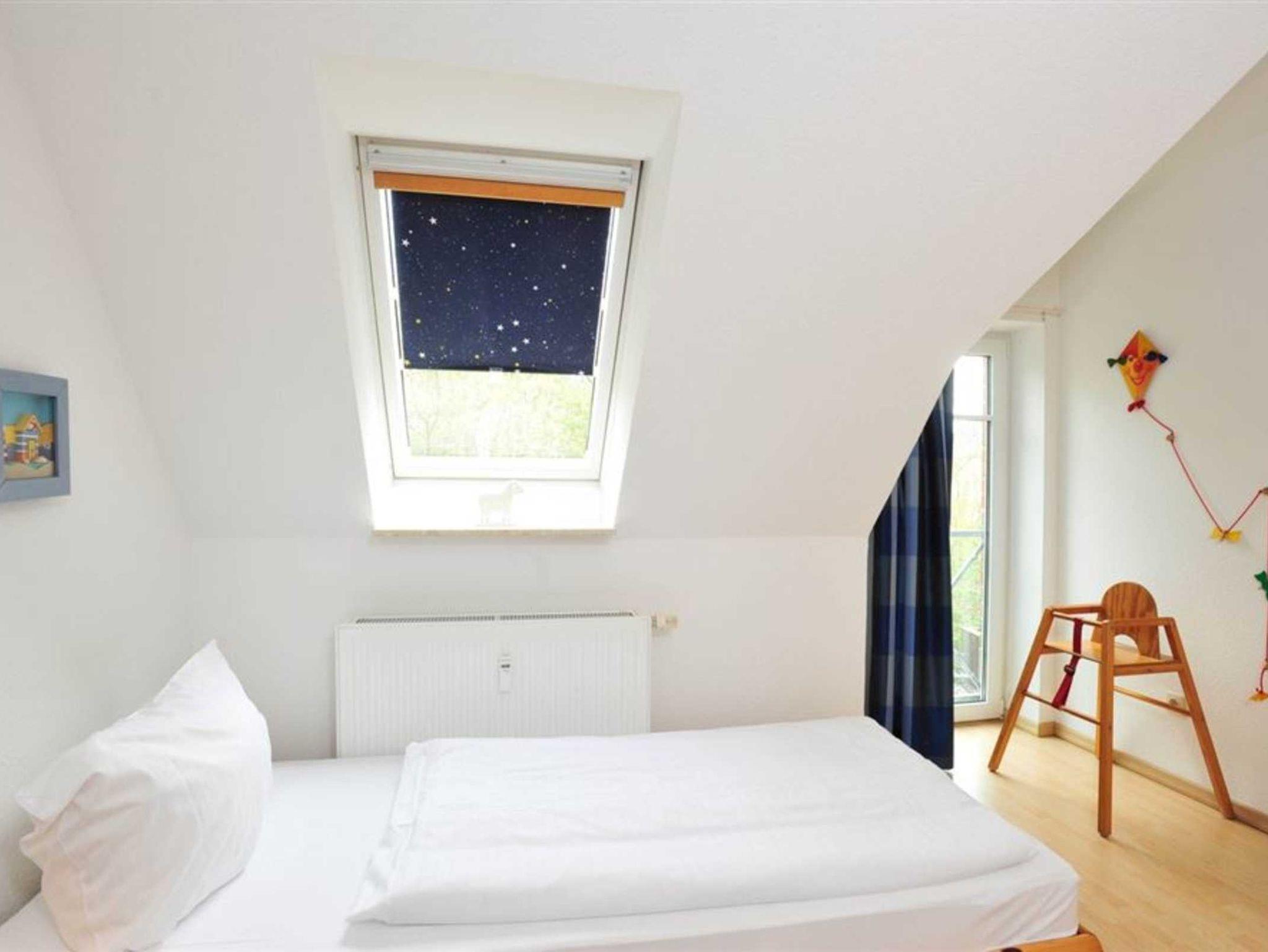 2. Schlafzimmer mit 2 Einzelbetten (je 90x200cm), Kleiderschrank, Stuhl, Kinderhochstuhl und Garderobe.