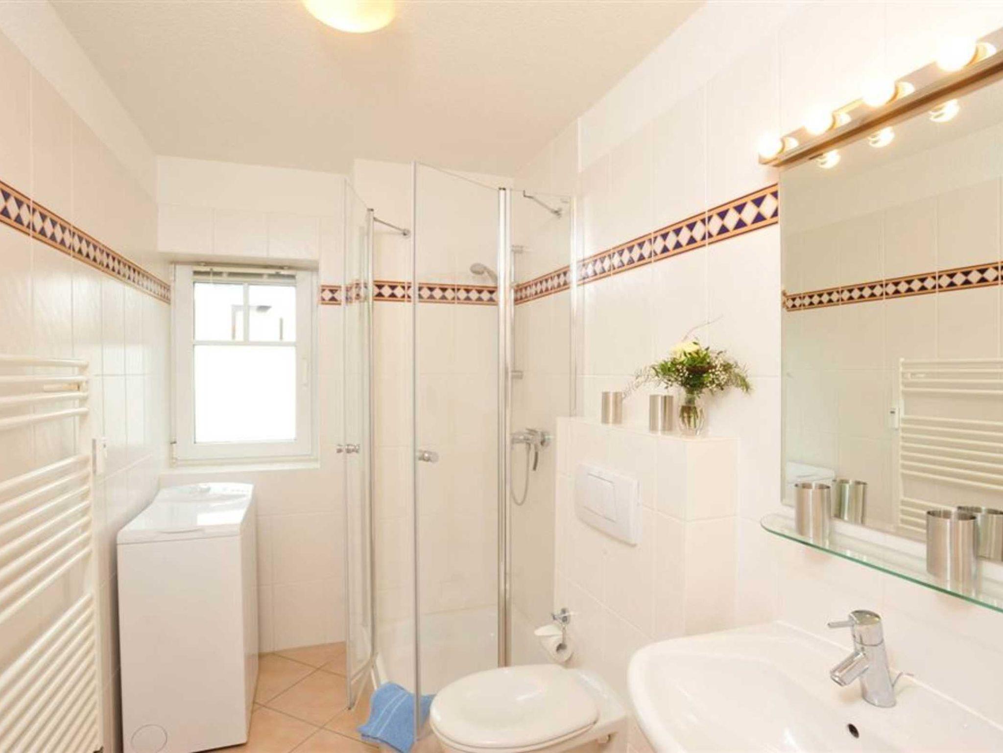 Badezimmer (Duschbad) mit Dusche, WC, Handtuchwärmer, Waschmaschine (Toploader), Tageslicht und Föhn.