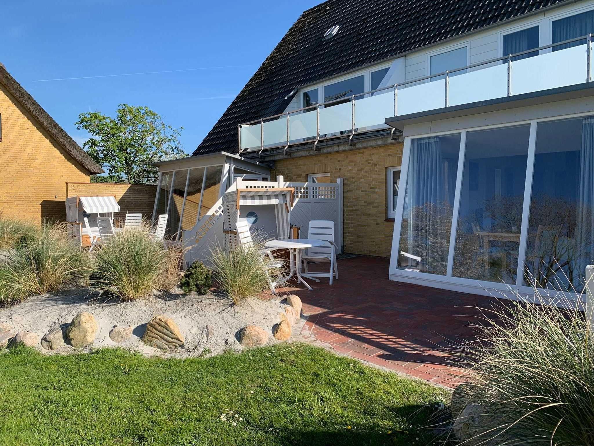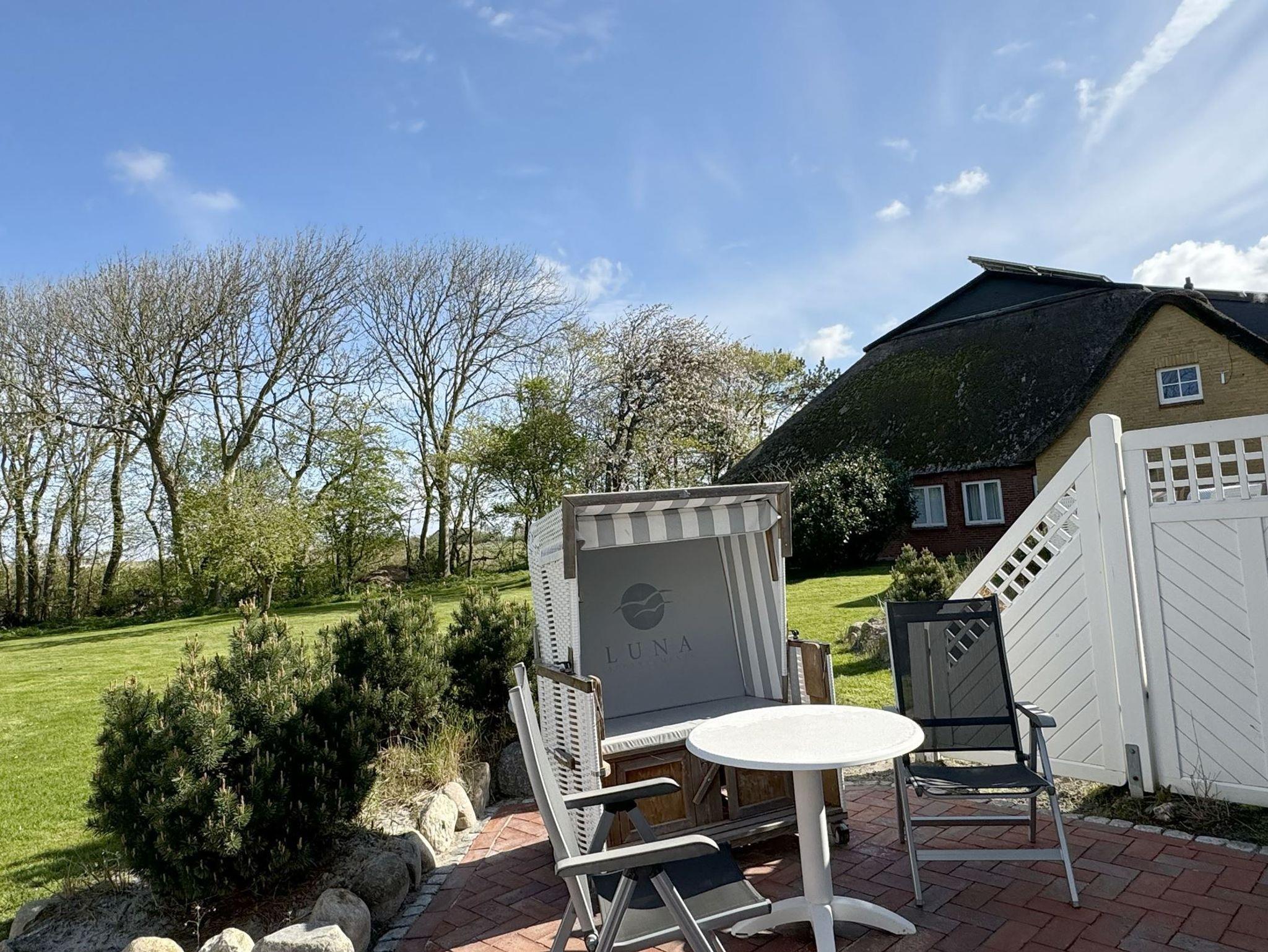 Helle Ferienwohnung in St. Peter-Ording mit Terrasse und Blick in den Obstgarten, nur 100 m vom Strand entfernt.