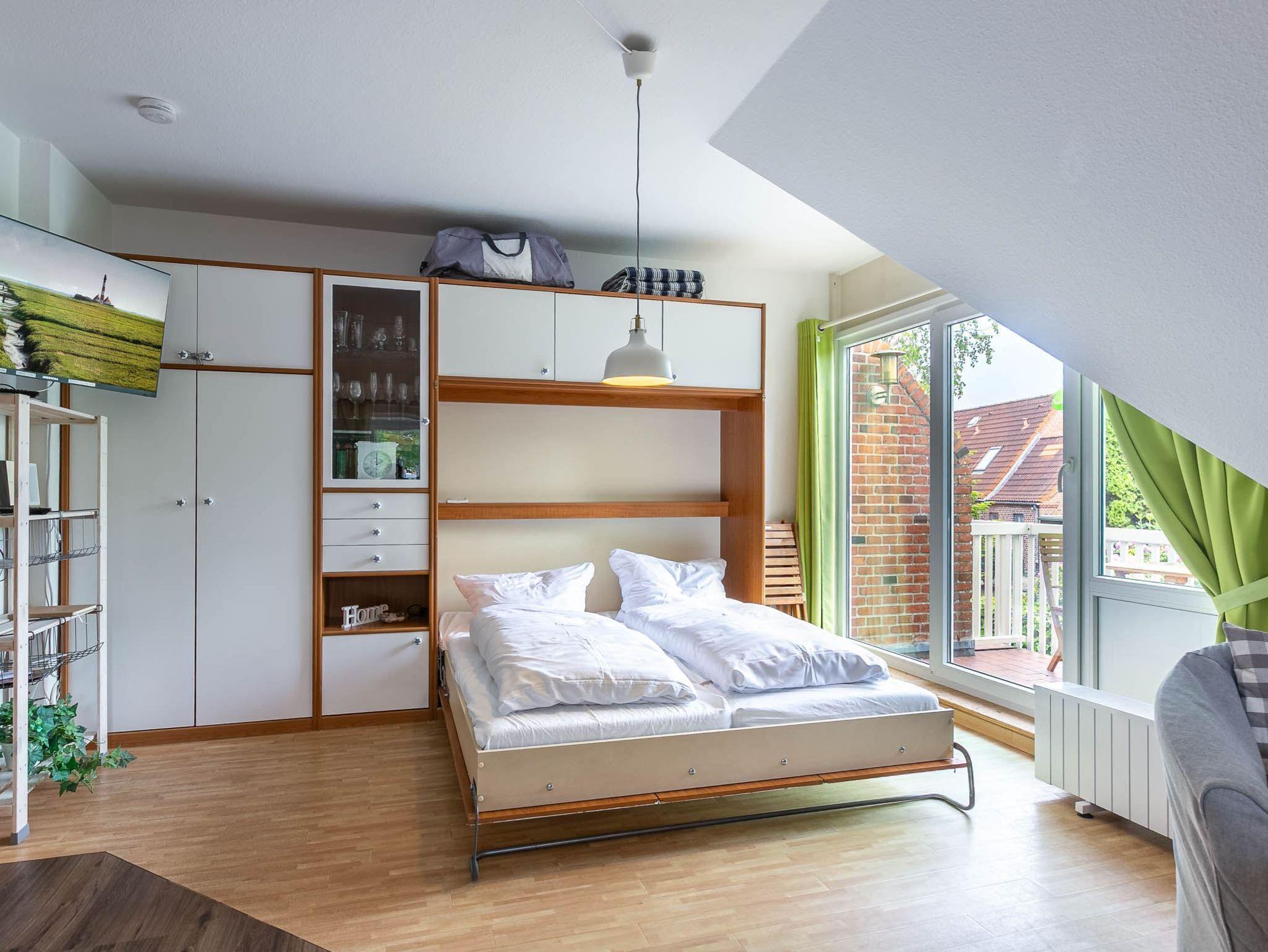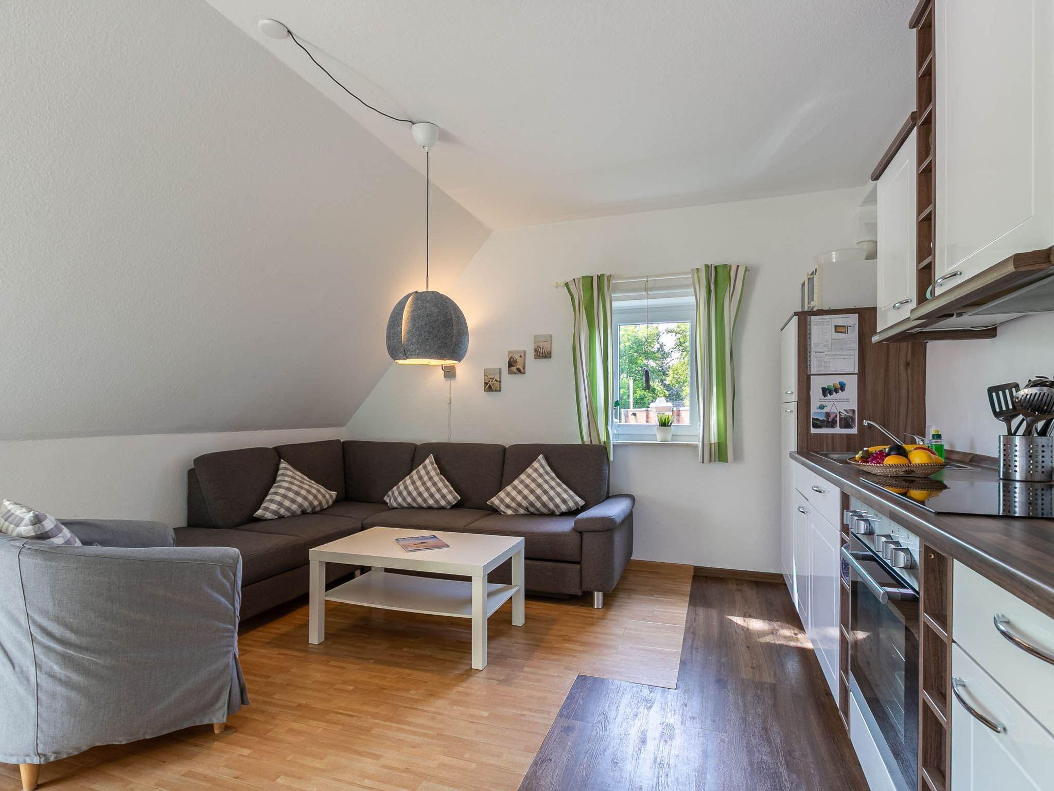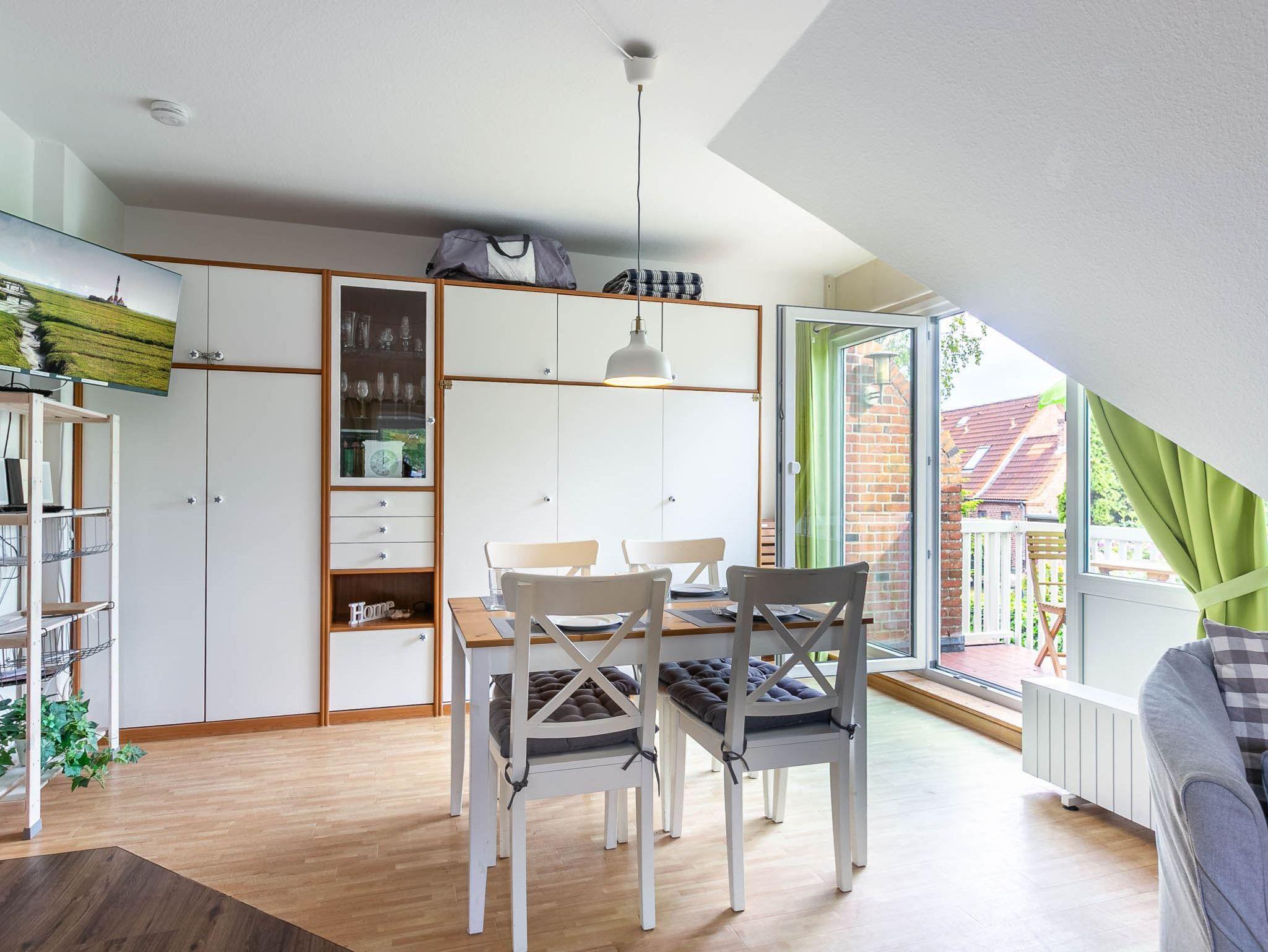 Wohnzimmer mit Ecksofa (bis zu 5 Personen), Schrank-Doppelbett (2x 80x200cm), Sessel, großem TV (Kabel), Stereoanlage und Esstisch mit 4 Stühlen. Direkter Zugang zum möblierten Balkon nach Süden mit Blick auf grüne Gärten und prächtige Reetdachhäuser. Offene Küche mit Backofen, Mikrowelle, Kühlschrank, separatem Gefrierschrank und Geschirrspüler.