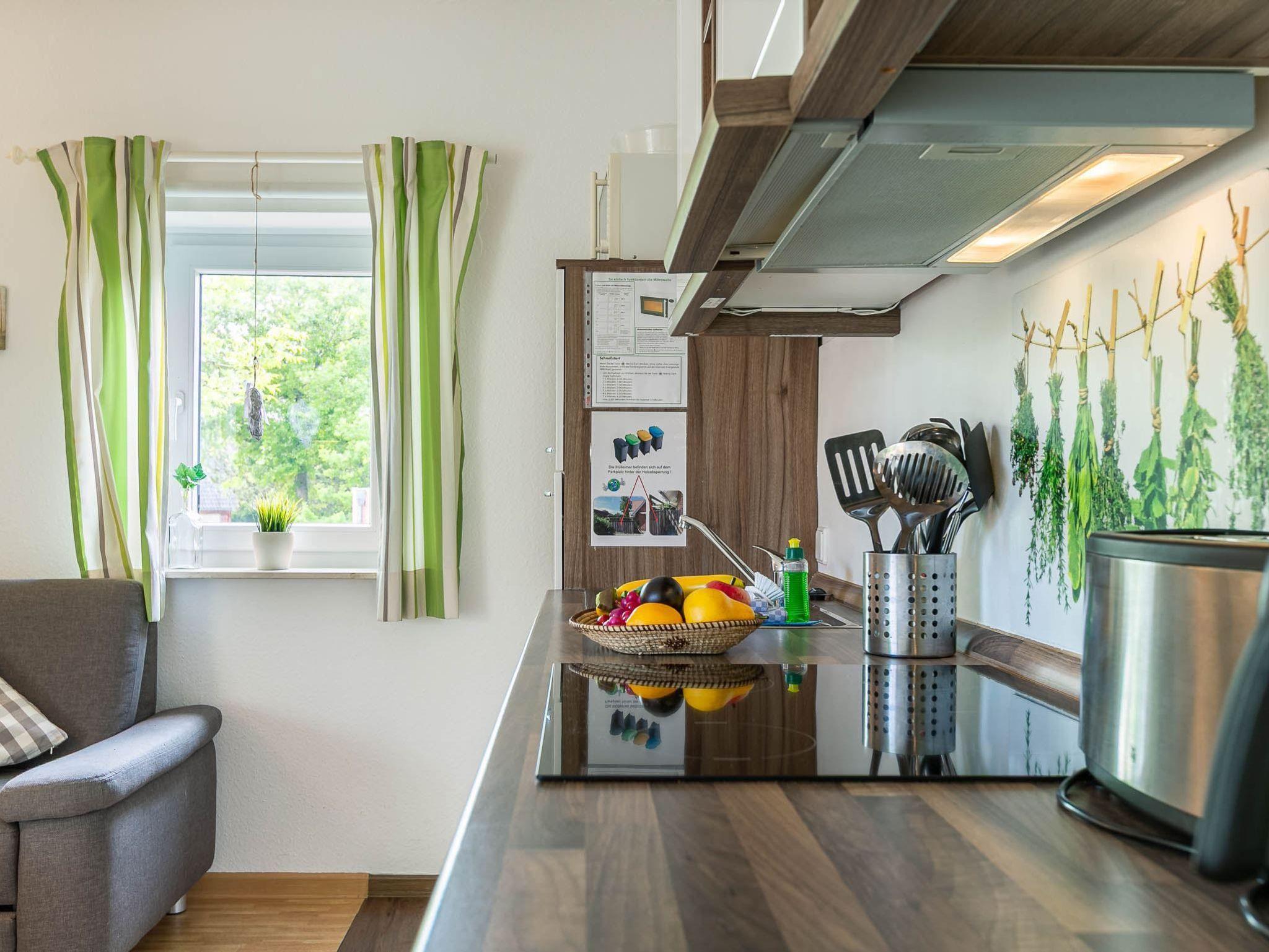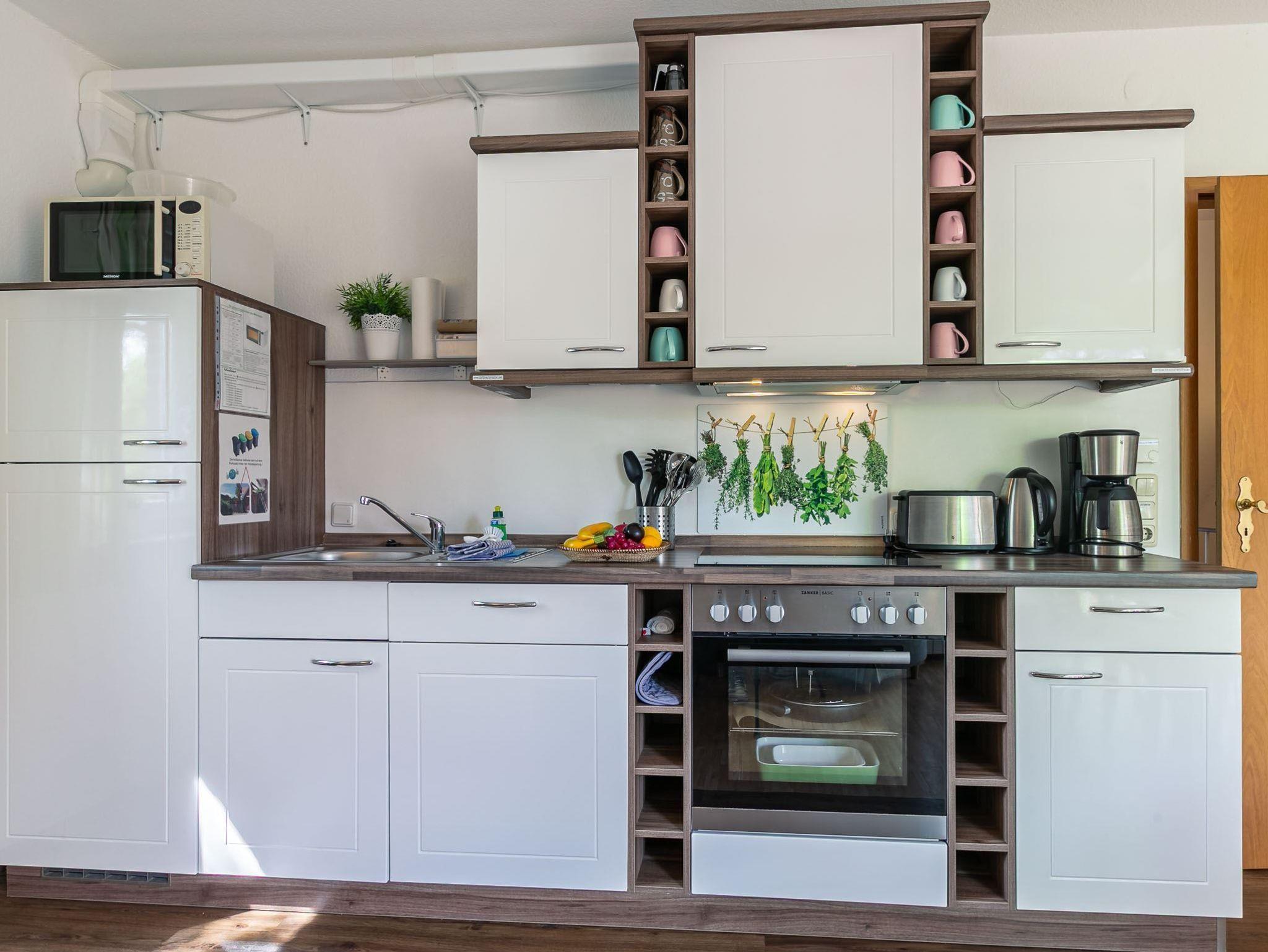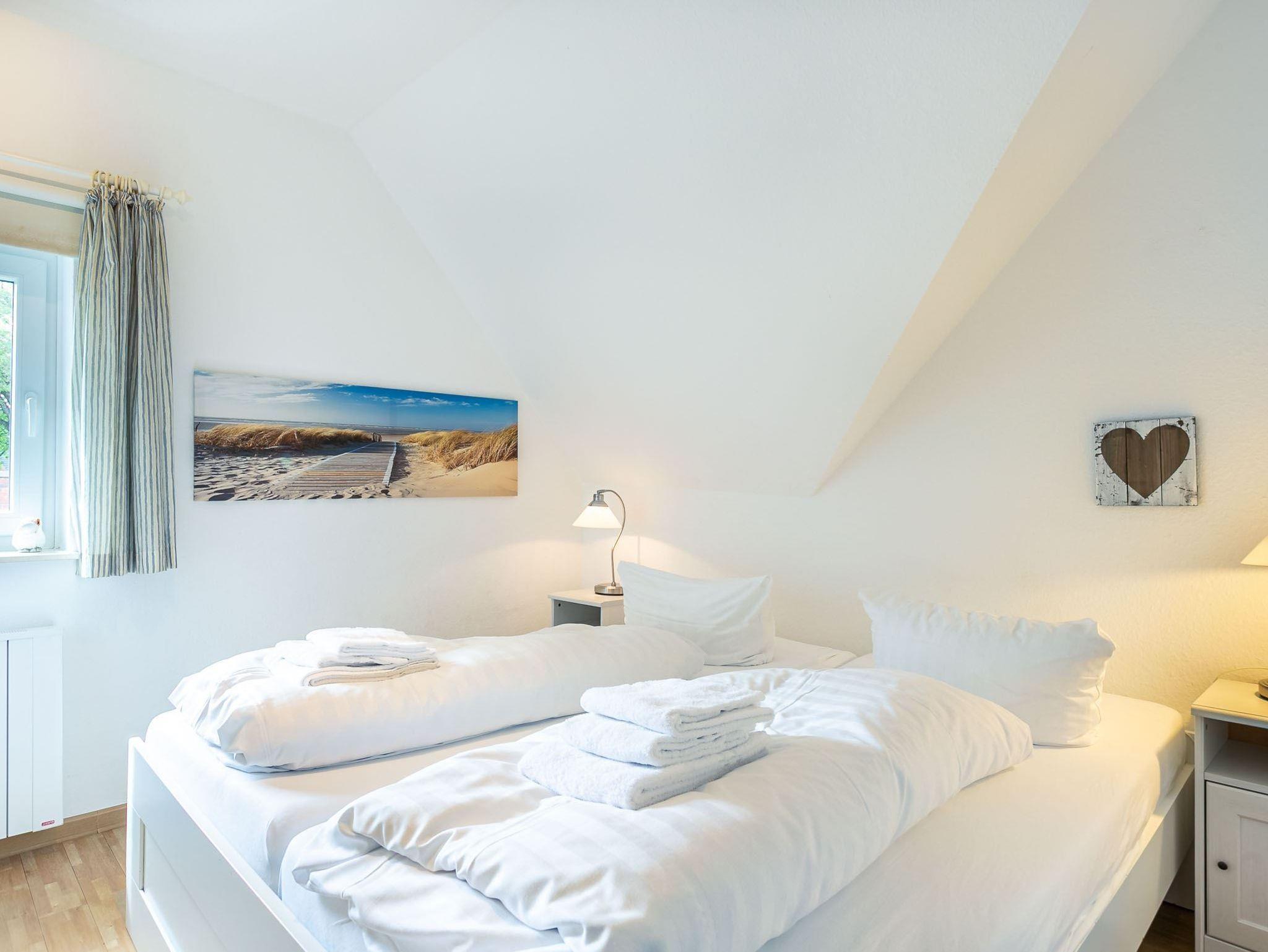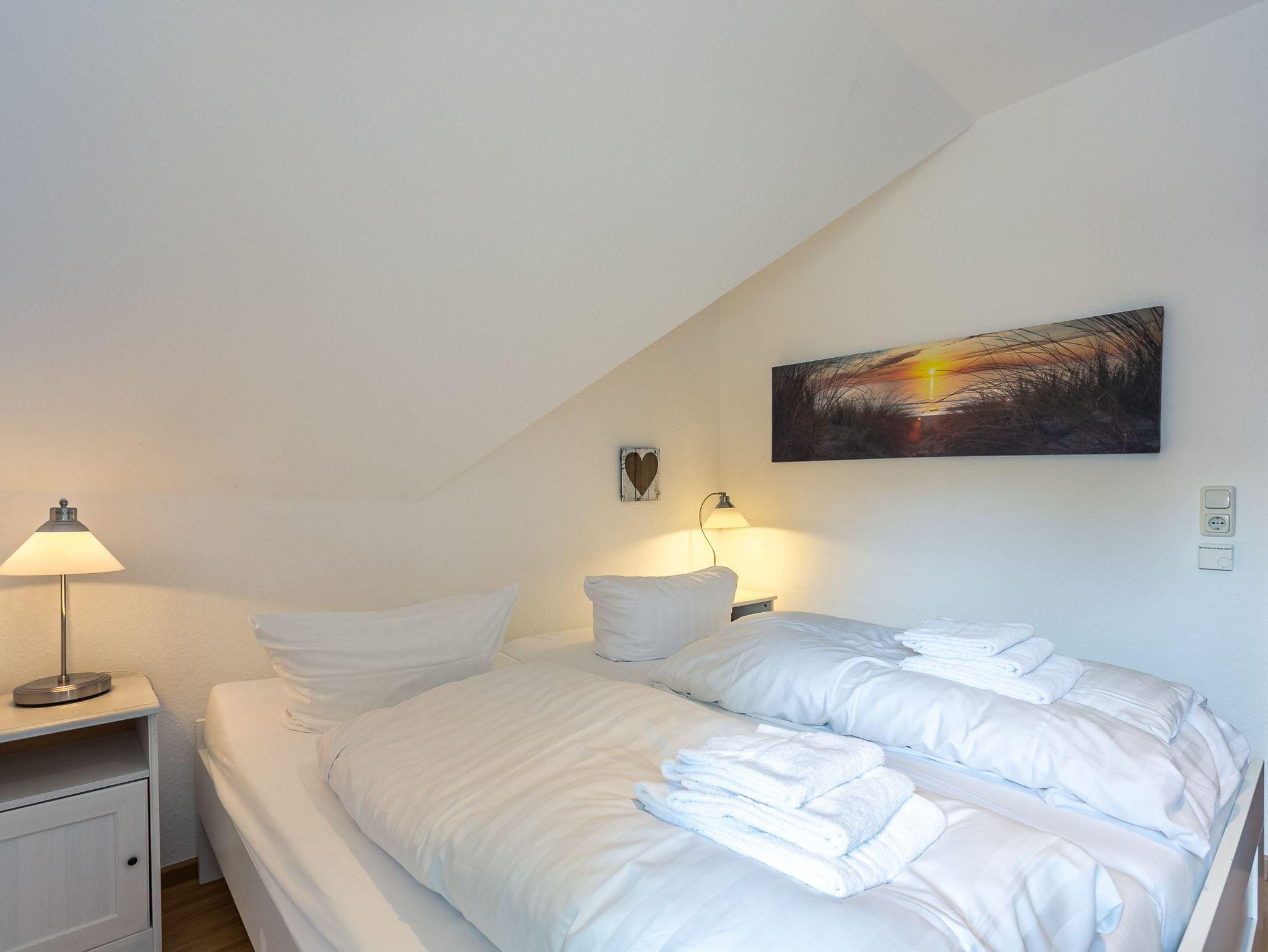 Wohnzimmer mit Ecksofa (bis zu 5 Personen), Schrank-Doppelbett (2x 80x200cm), Sessel, großem TV (Kabel), Stereoanlage und Esstisch mit 4 Stühlen. Direkter Zugang zum möblierten Balkon nach Süden mit Blick auf grüne Gärten und prächtige Reetdachhäuser. Offene Küche mit Backofen, Mikrowelle, Kühlschrank, separatem Gefrierschrank und Geschirrspüler.