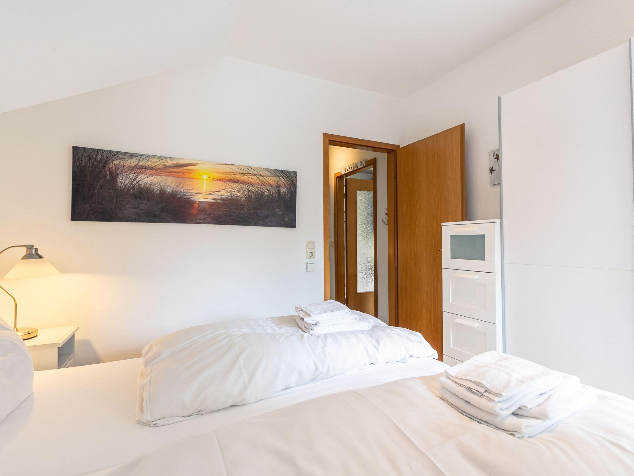 Schlafzimmer mit Doppelbett (2x 90x200cm), Kleiderschrank und Kommode.