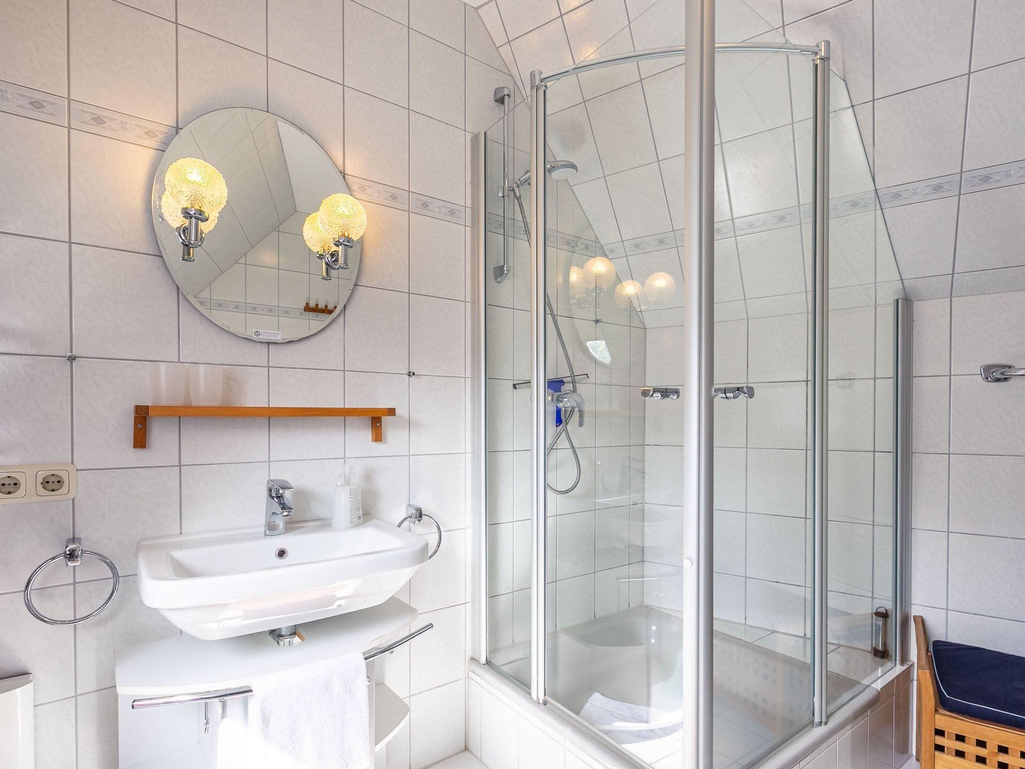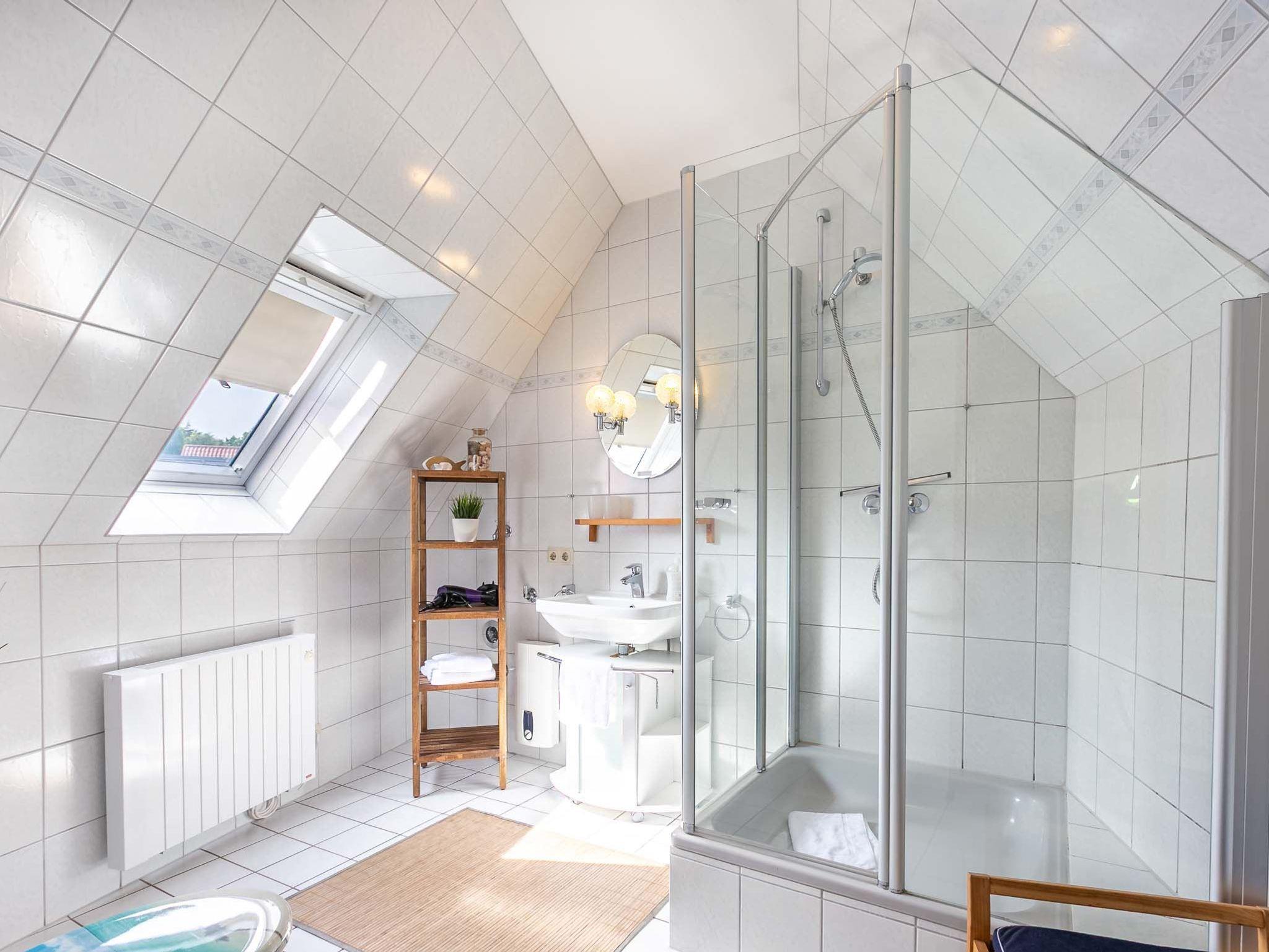 Badezimmer (Duschbad) mit Dusche, WC, Tageslicht und Föhn.