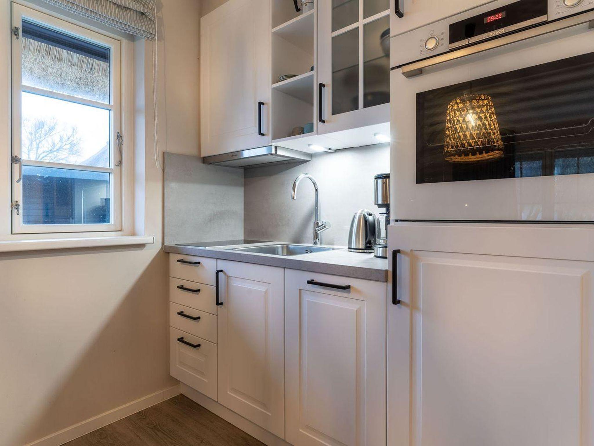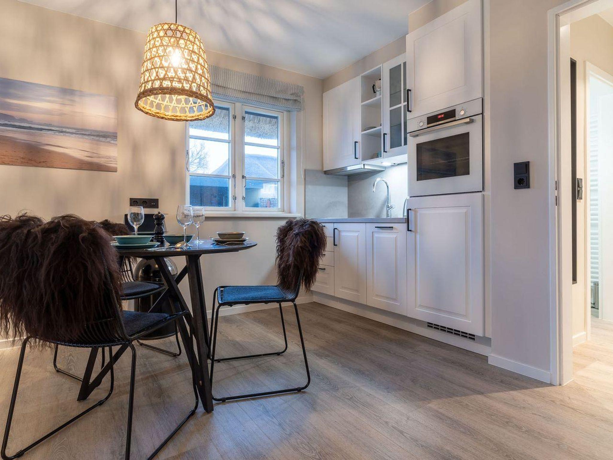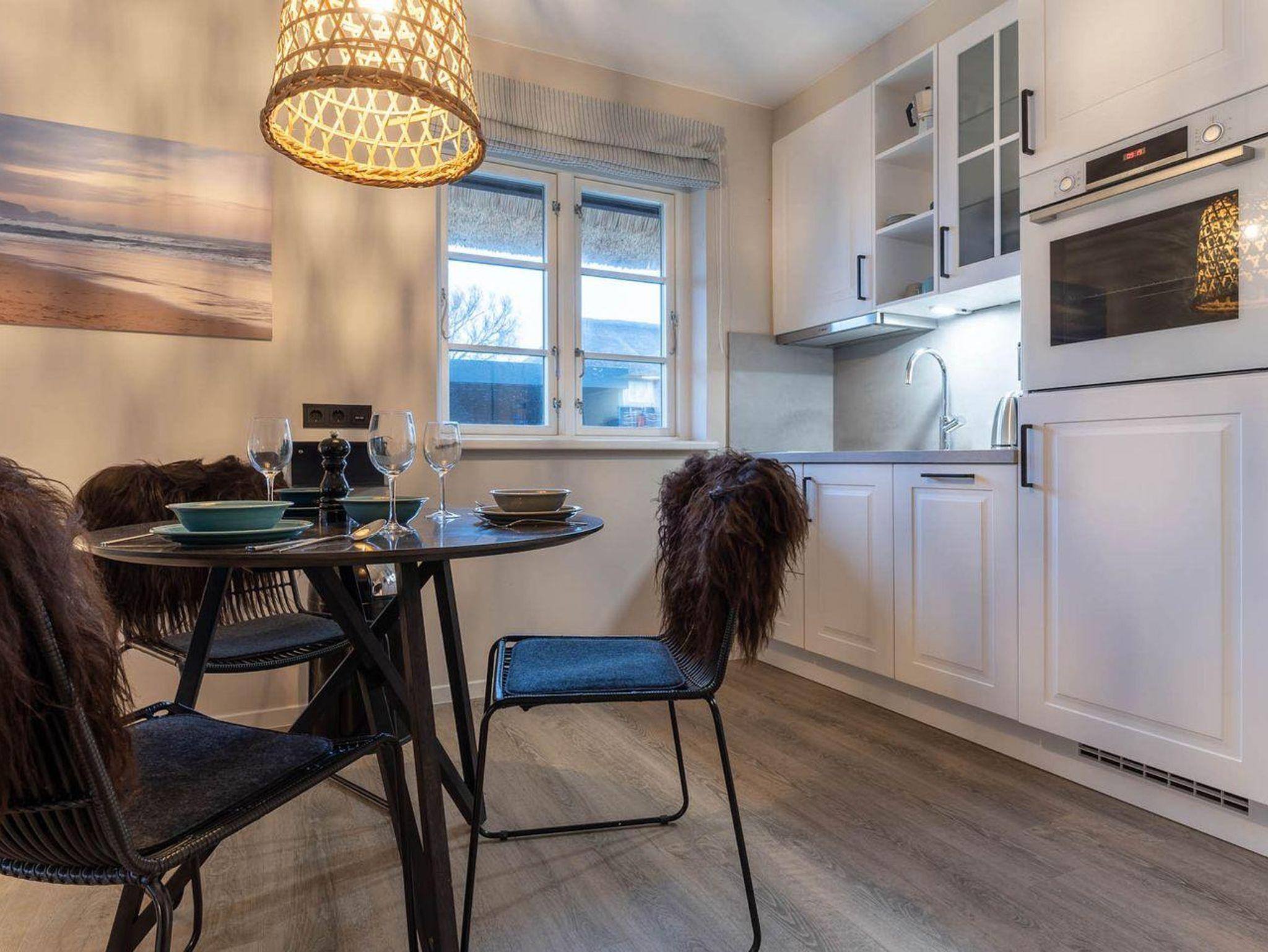 Am Esstisch oder auf der möblierten, eigenen Süd-WestTerrasse unter Reet lässt es sich mit frischen Brötchen vom nahegelegenen Bäcker wunderbar in den Urlaubstag starten.