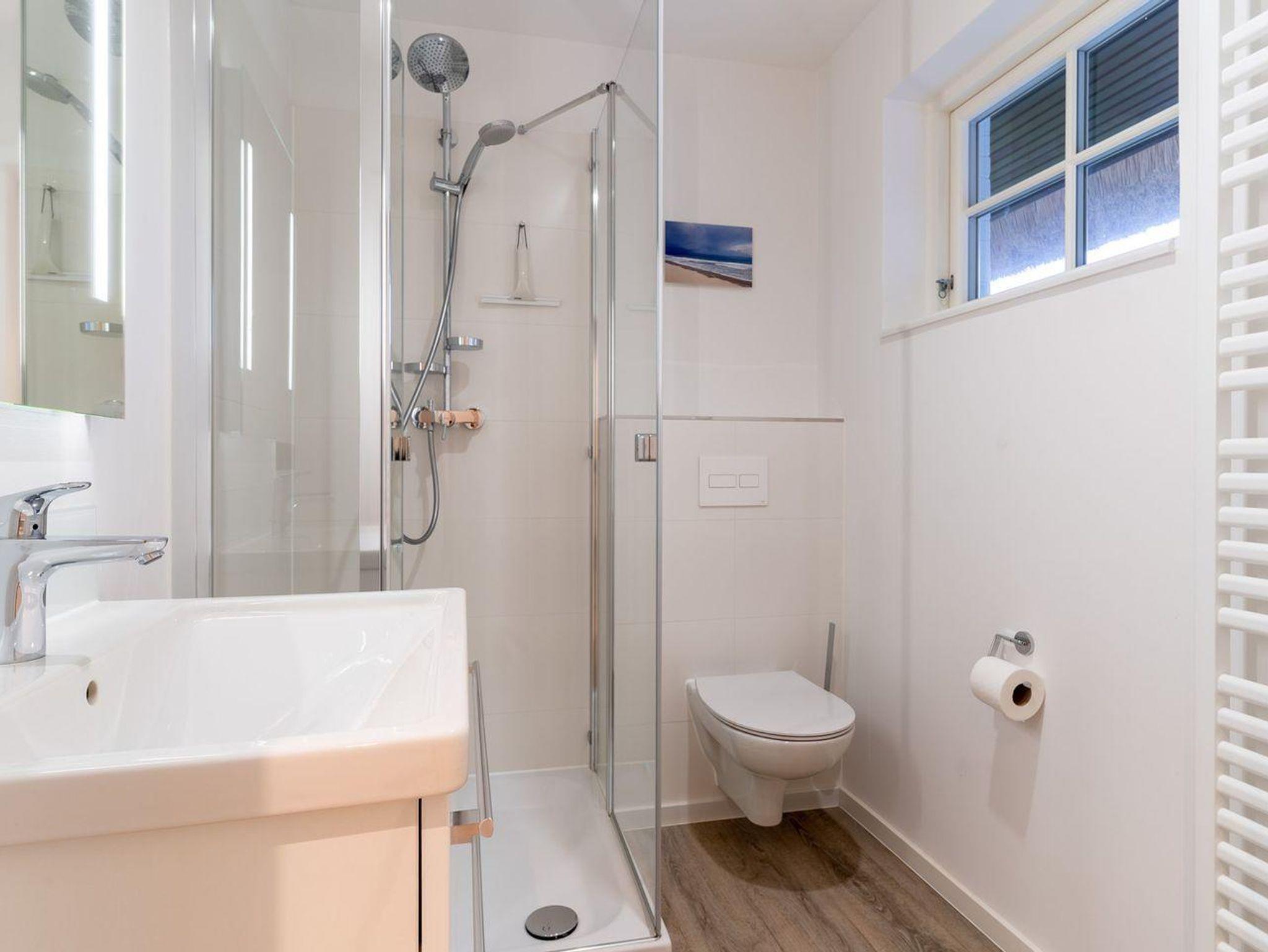 Das moderne Bad mit Fenster verfügt über eine bodentiefe Regendusche, Handtuchheizung, Waschbecken und WC.