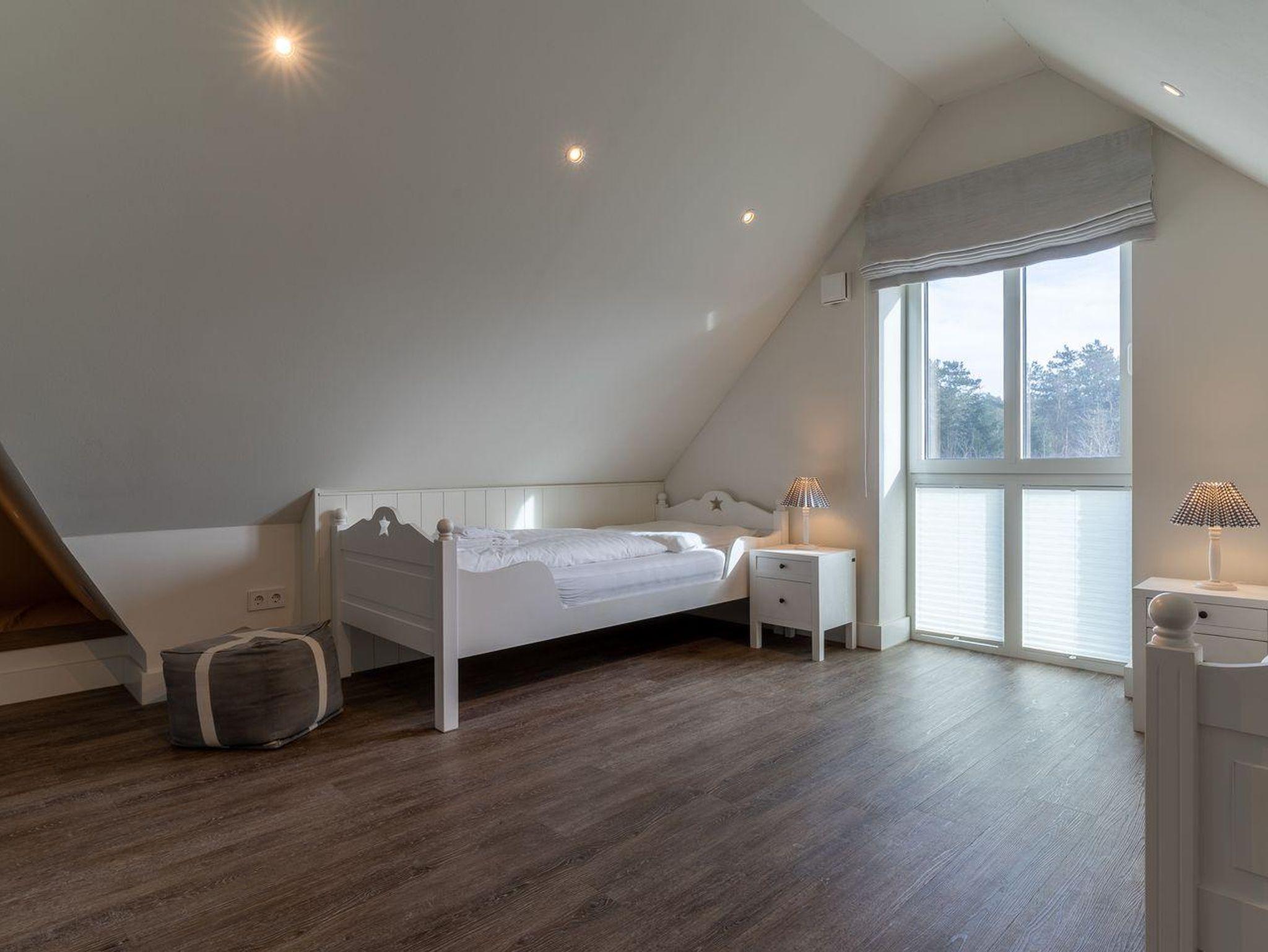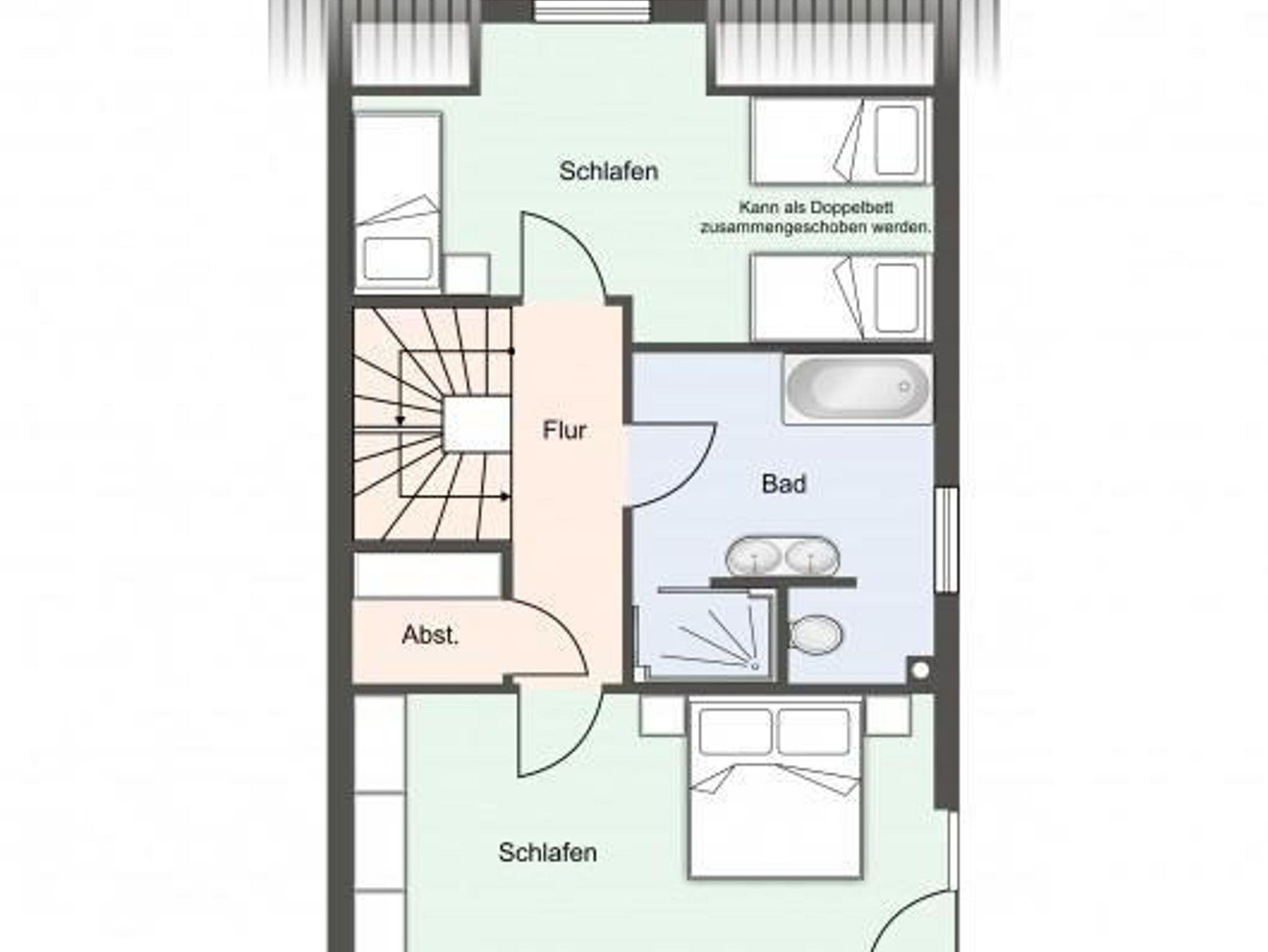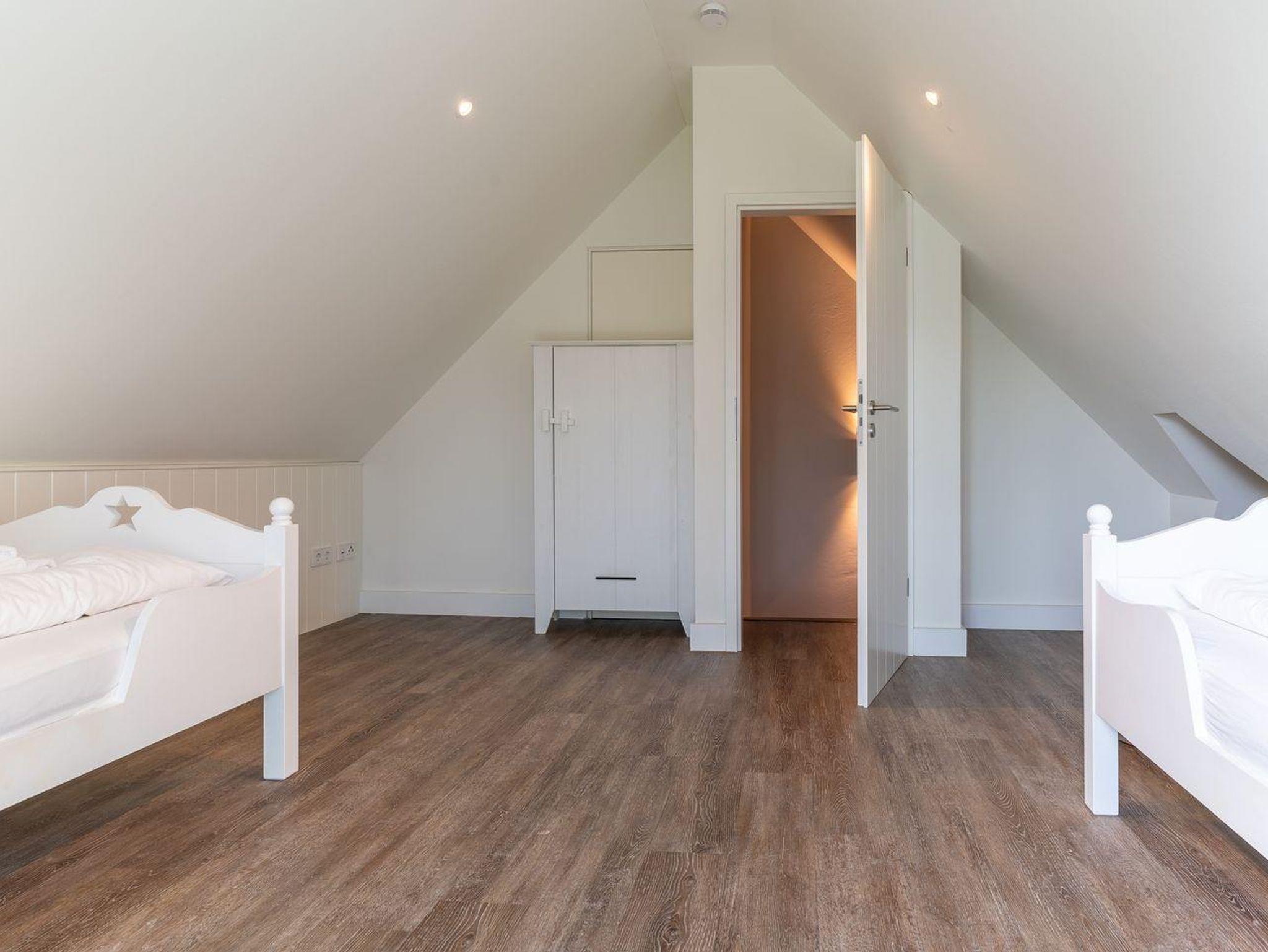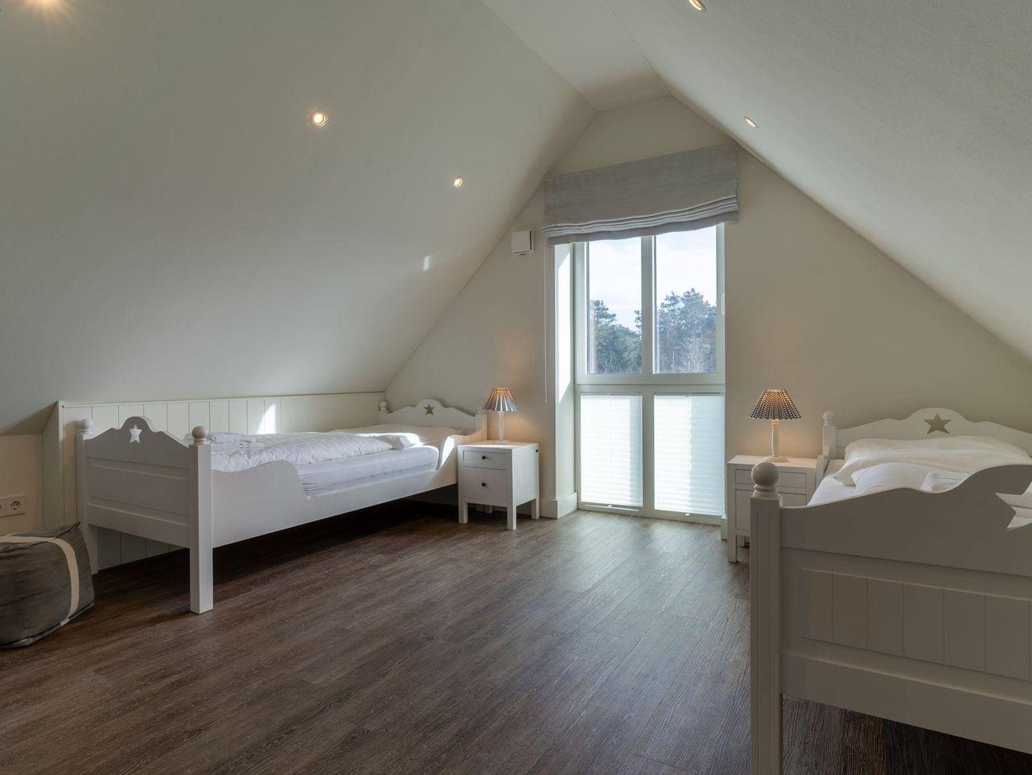 Über eine weitere Holztreppe geht es vom Flur ins Dachgeschoss mit einem weiteren Zimmer mit 2 Einzelbetten.