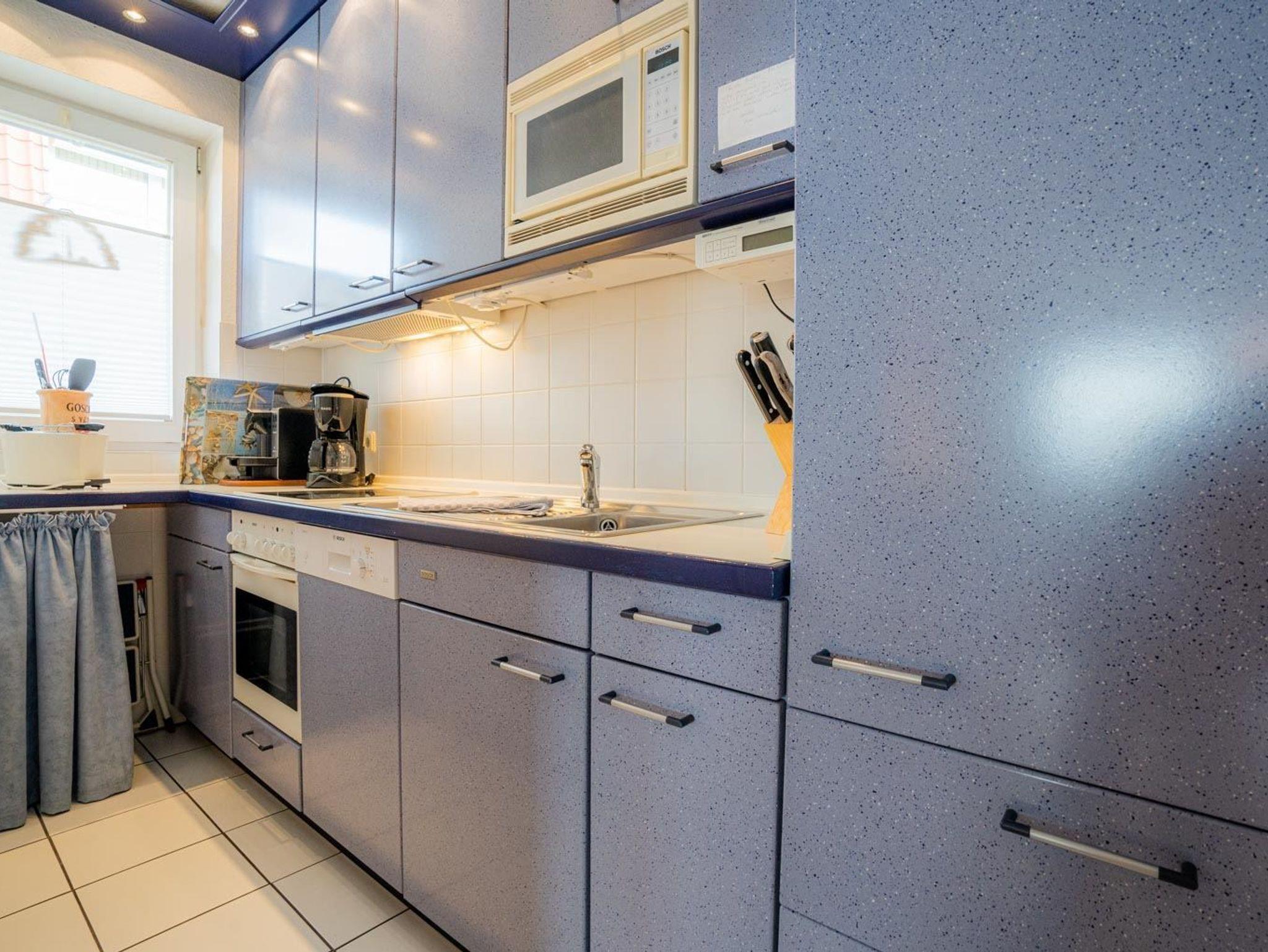 Halboffene Küche mit Backofen, Mikrowelle, Kühlschrank mit Gefrierfach, Geschirrspüler und Kaffeemaschine sowie eine Nespresso Kapsel-Kaffeemaschine.