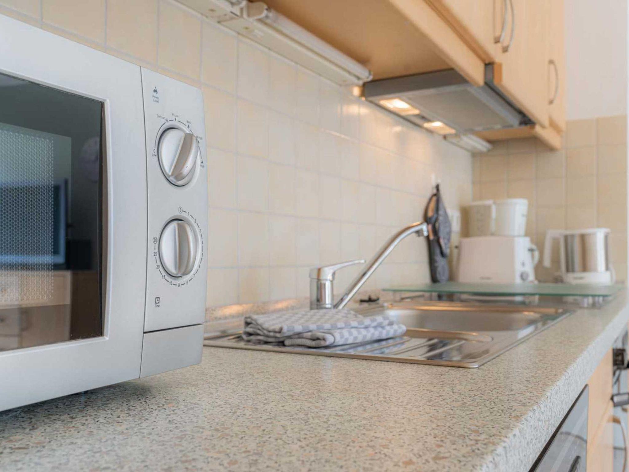 Wohnzimmer mit ausziehbarem (Schlaf-) Eck-Sofa (145x195cm), 1 Sessel, großes TV (Kabel), Stereo-Kompaktanlage mit CD-Player und Esstisch für 4 Personen. Offene Küche mit Backofen, Mikrowelle, Geschirrspüler und Kühlschrank mit Gefrierfach. Direkter Zugang zum möblierten Balkon nach Süden.