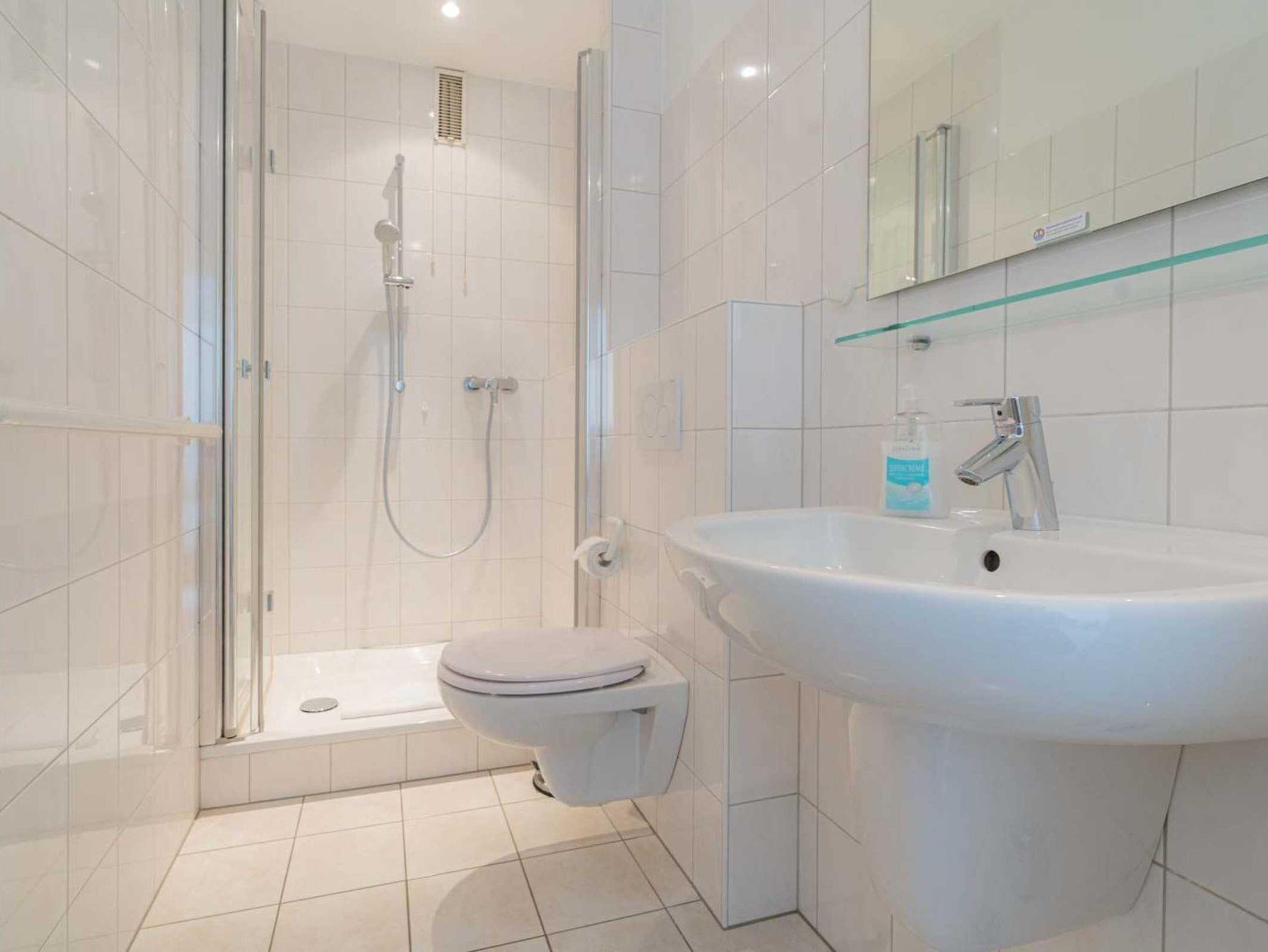 Badezimmer (Duschbad) mit Dusche, WC und Föhn.