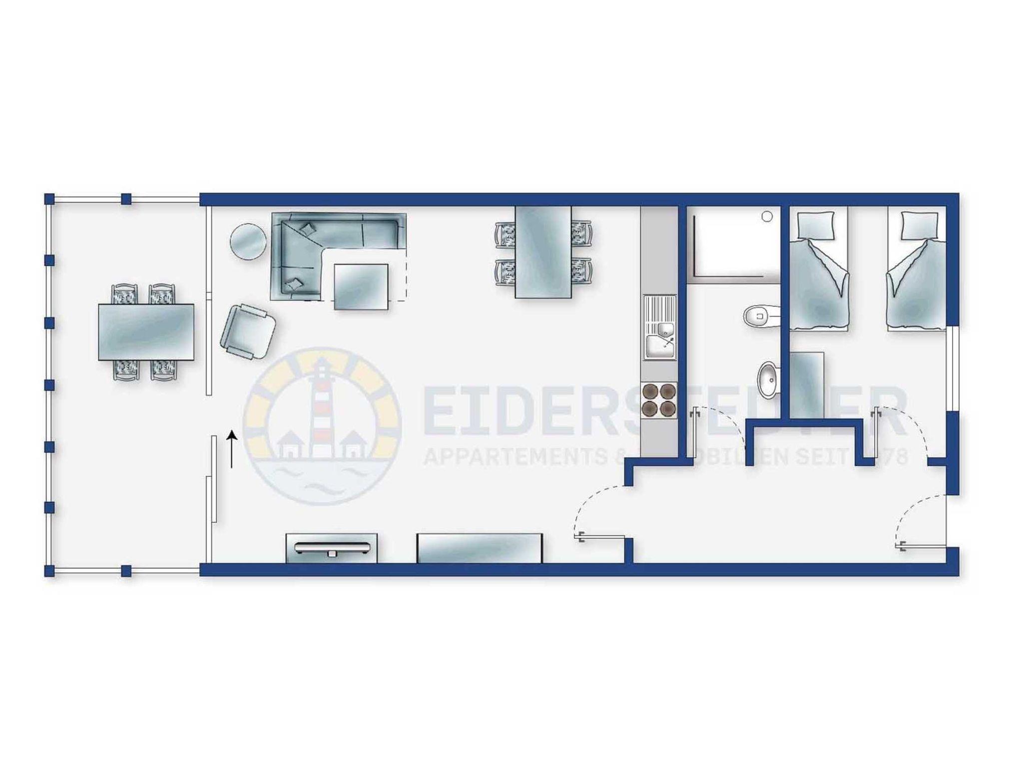 Moderne 2-Zimmer-Ferienwohnung Blanker Hans im Haus im Kurbad mit ca. 44 qm auf 1 Ebene (2. OG) für bis zu 4 Personen (Wohlfühlbelegung: max. 2 Erwachsene). In zentraler Lage im Ortsteil Bad in St. Peter-Ording. Restaurants, Einkaufsmöglichkeiten, Strand - alles in unmittelbarer Nähe.
