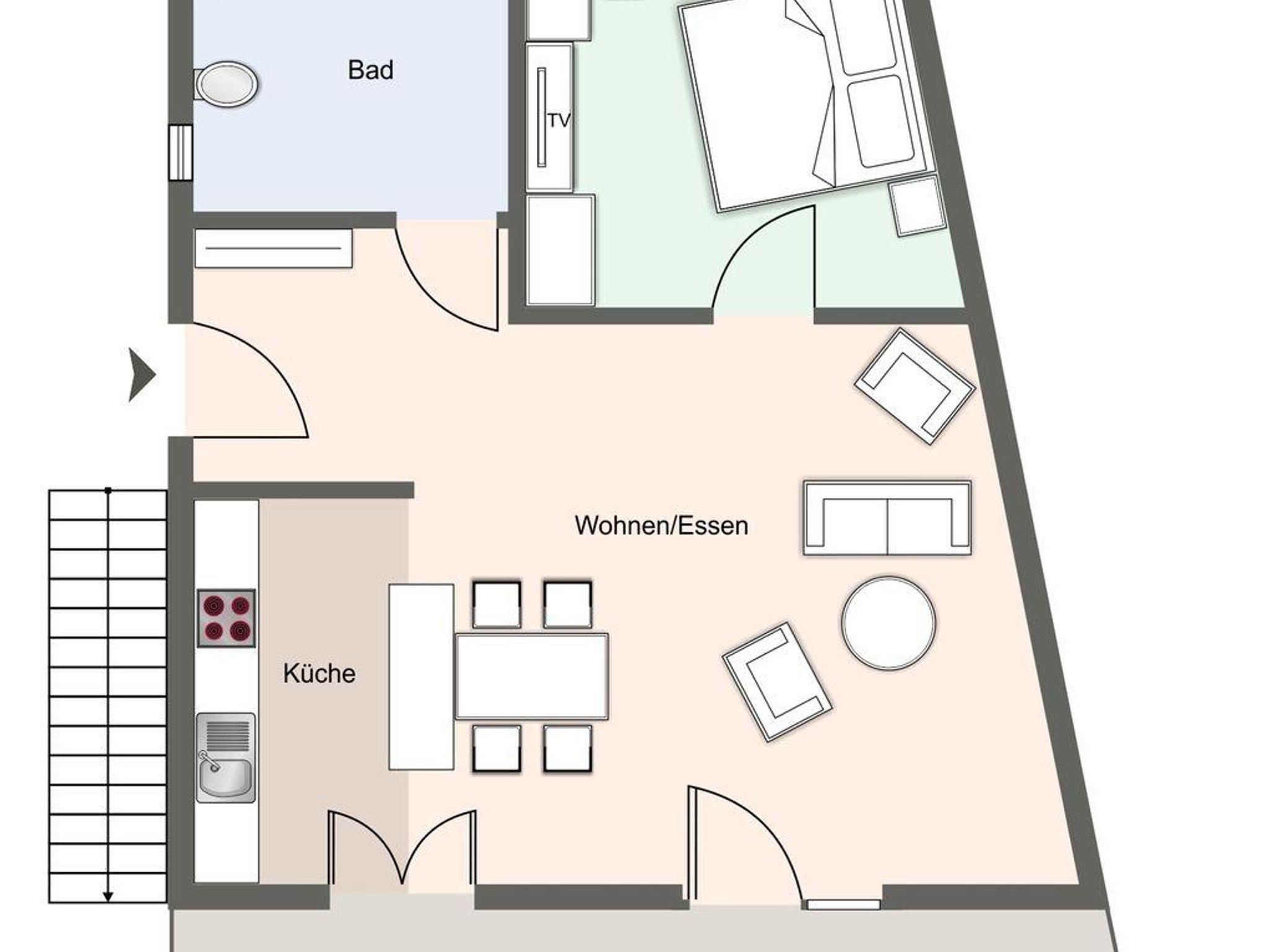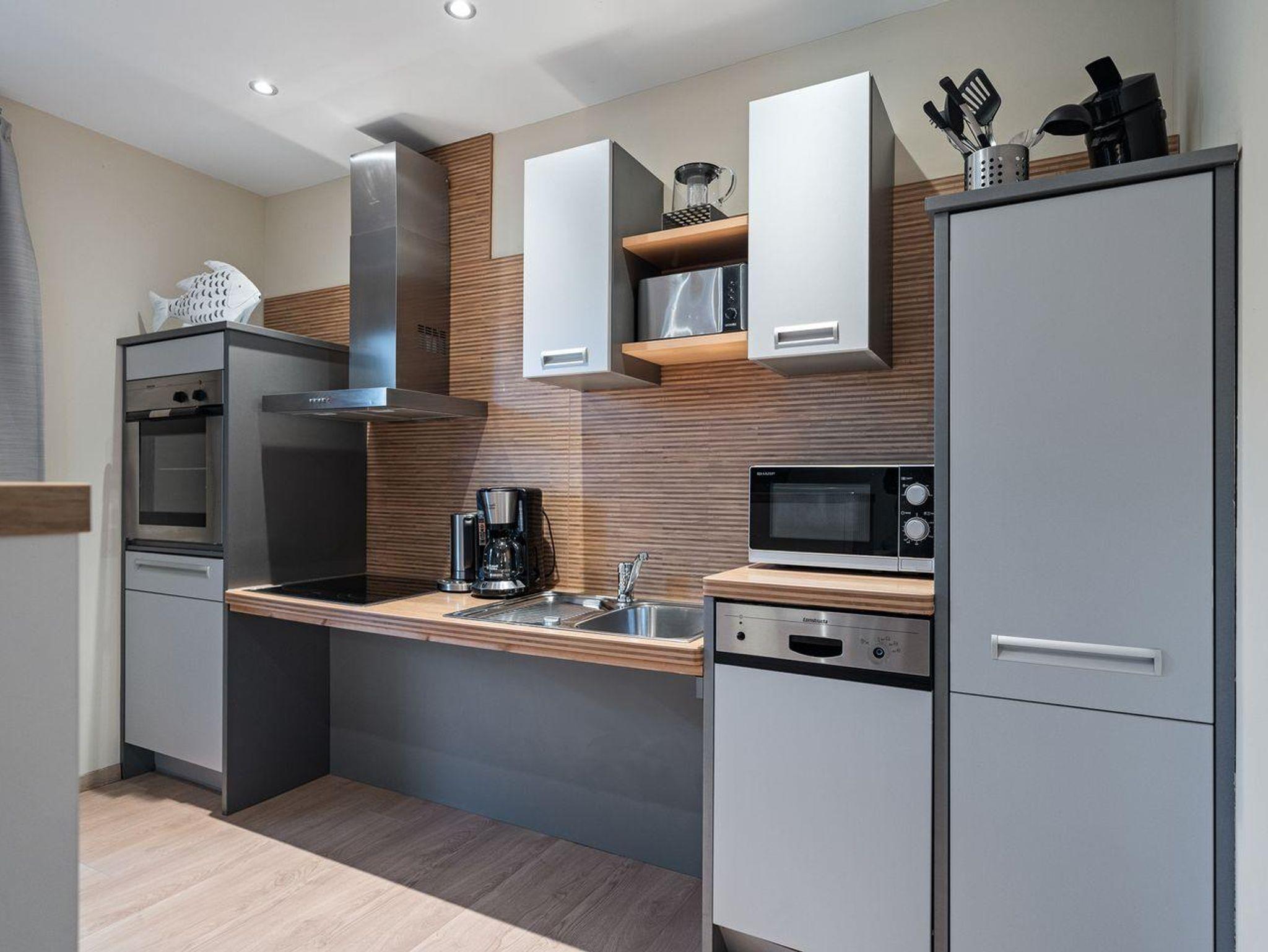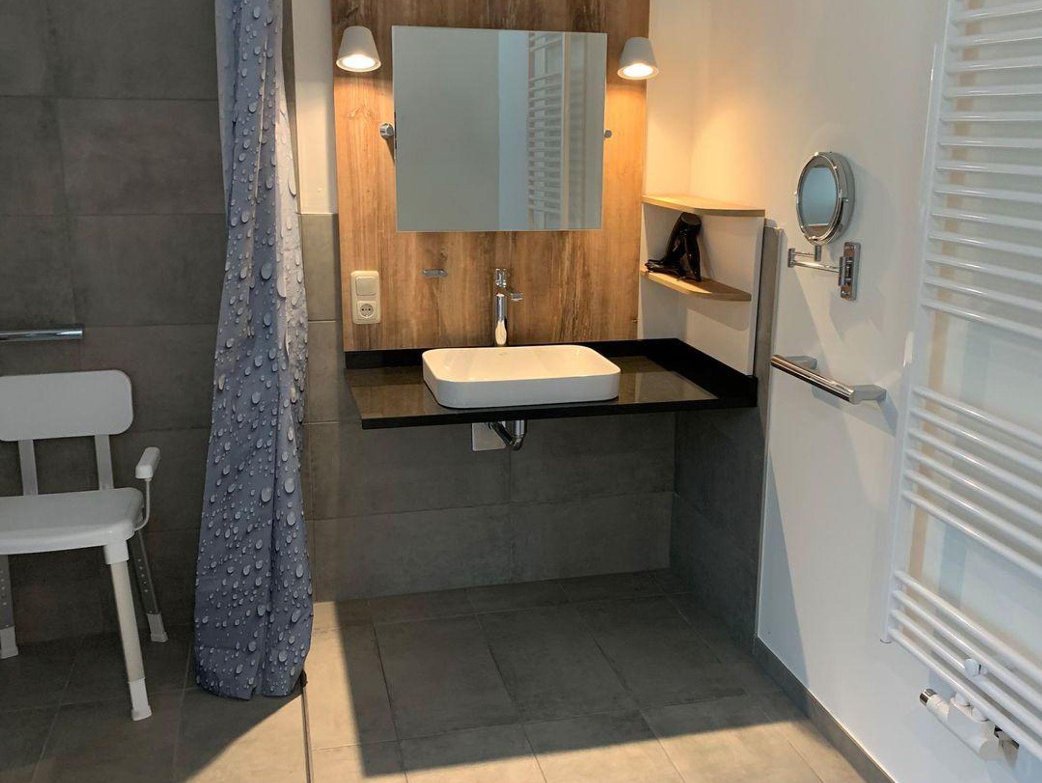 Die Wohnung befindet sich im Erdgeschoss und wurde behindertengerecht und barrierefrei eingerichtet. Der großzügige Wohnraum mit TV und einer modernen Wohnküche bietet jeden Komfort. Die Küche verfügt über hochwertige Elektrogeräte, eine Pad-Kaffeemaschine und eine Filter- Kaffeemaschine.