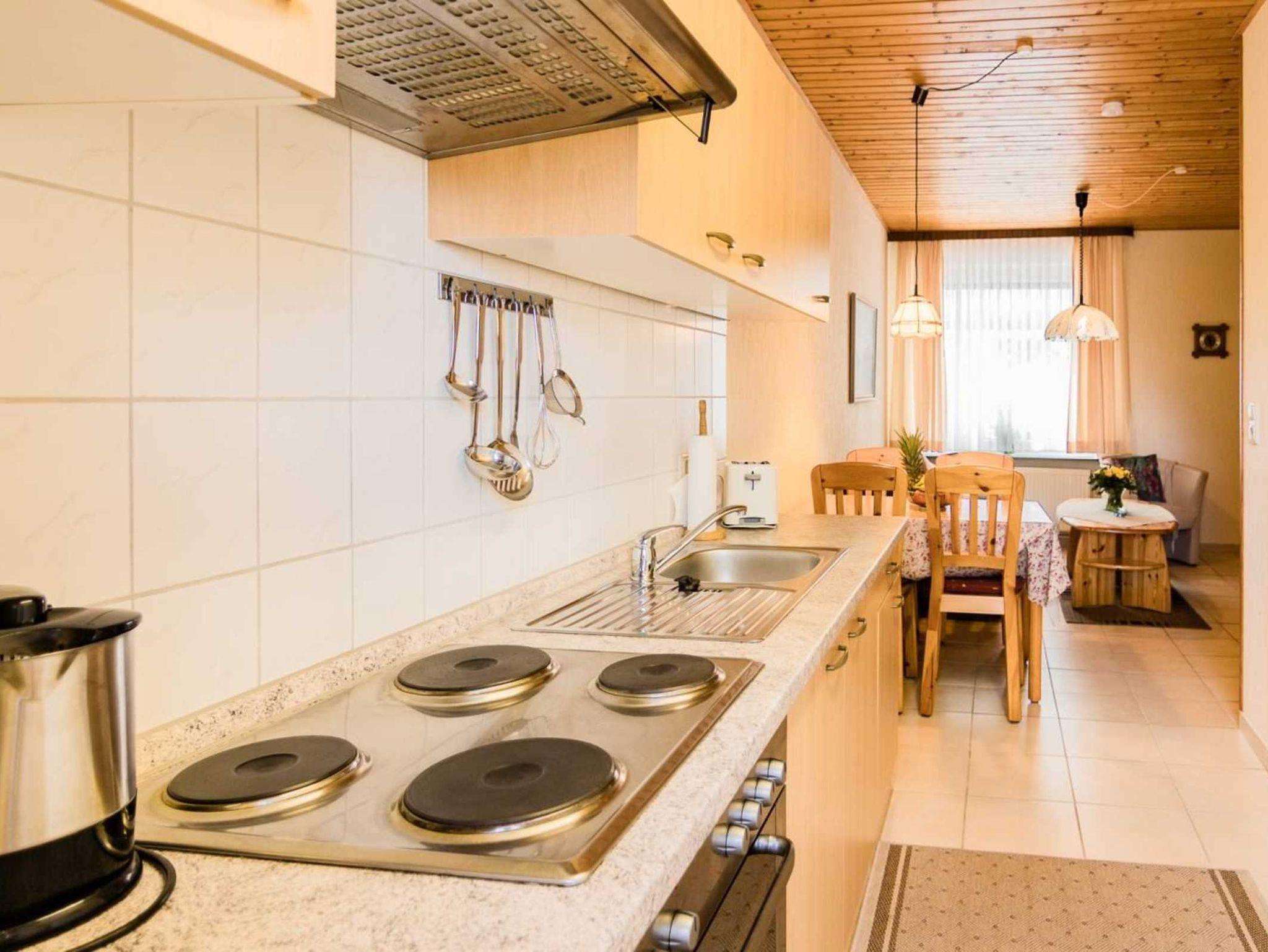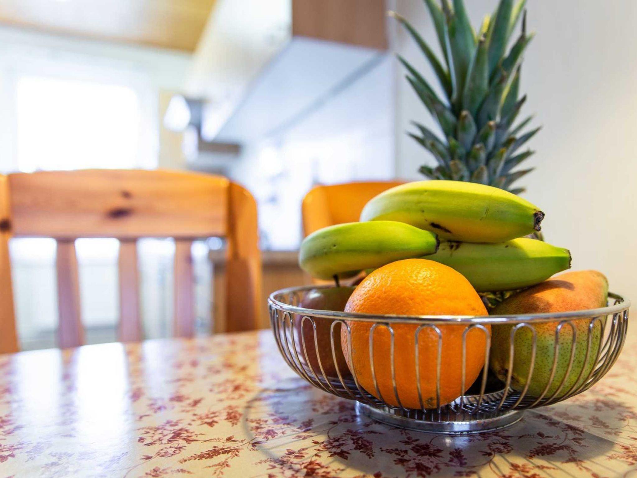 Wohnzimmer mit Sofa (3er), 1 Sessel, TV (Sat), Stereo-Kompaktanlage und Esstisch mit 4 Stühlen. Offene Küche mit Backofen, Mikrowelle und Kühlschrank mit Gefrierfach.