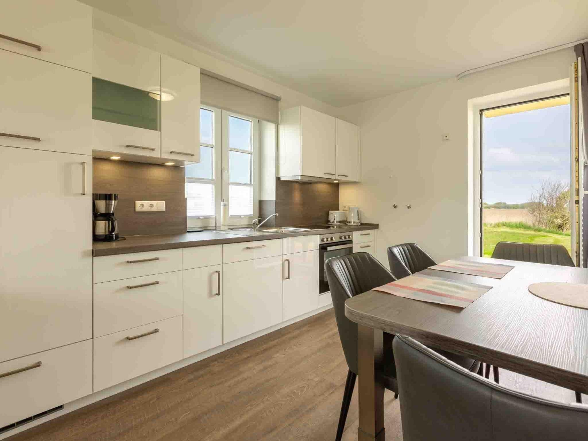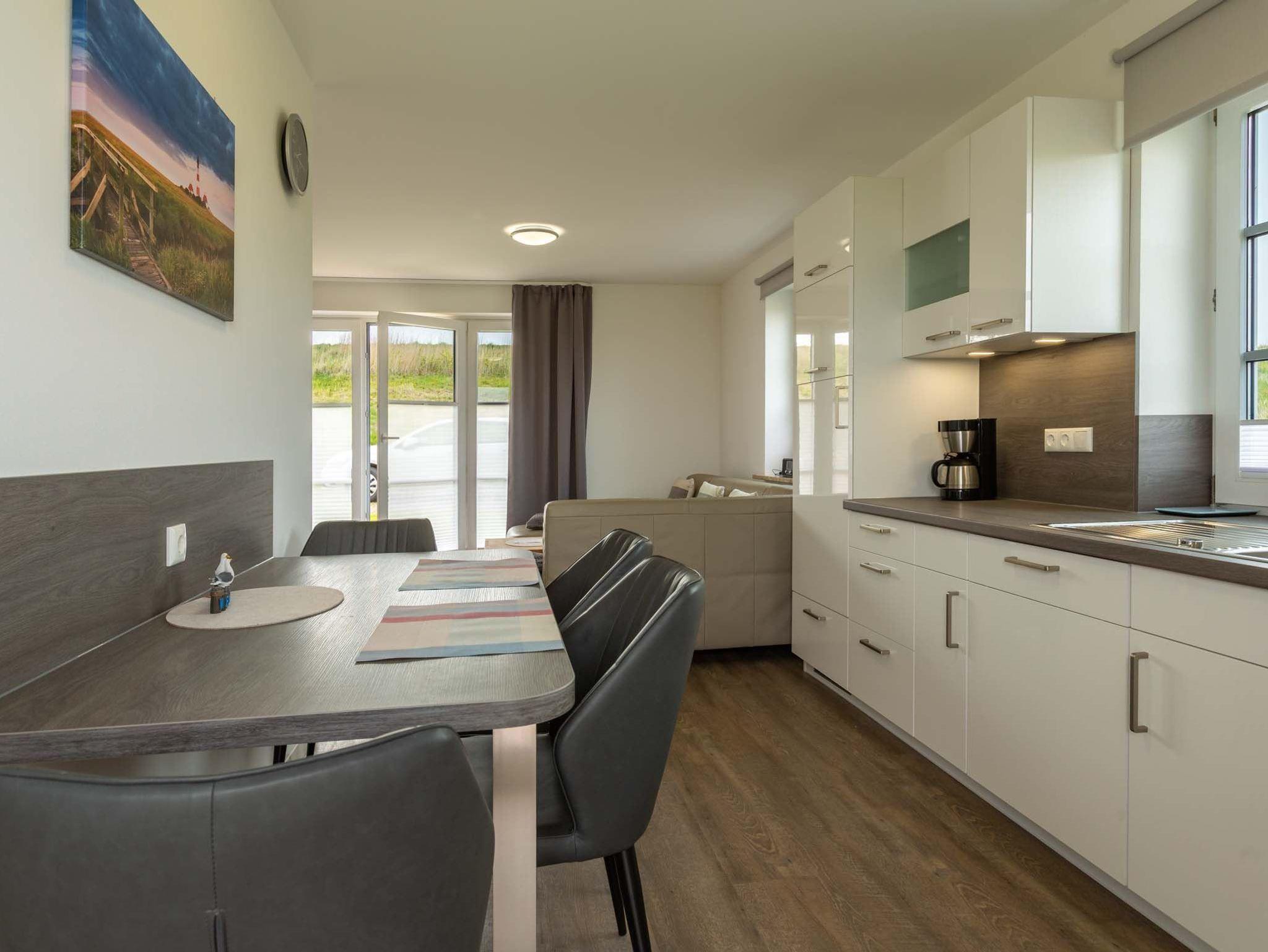 Wohnzimmer mit großer Wohnlandschaft, SMART-TV (Sat) und direktem Zugang zu beiden Terrassen nach Westen und nach Osten. Offene Küche mit Backofen, Mikrowelle, Geschirrspüler, Kühlschrank mit Gefrierfach und Esstisch mit 4 Stühlen.