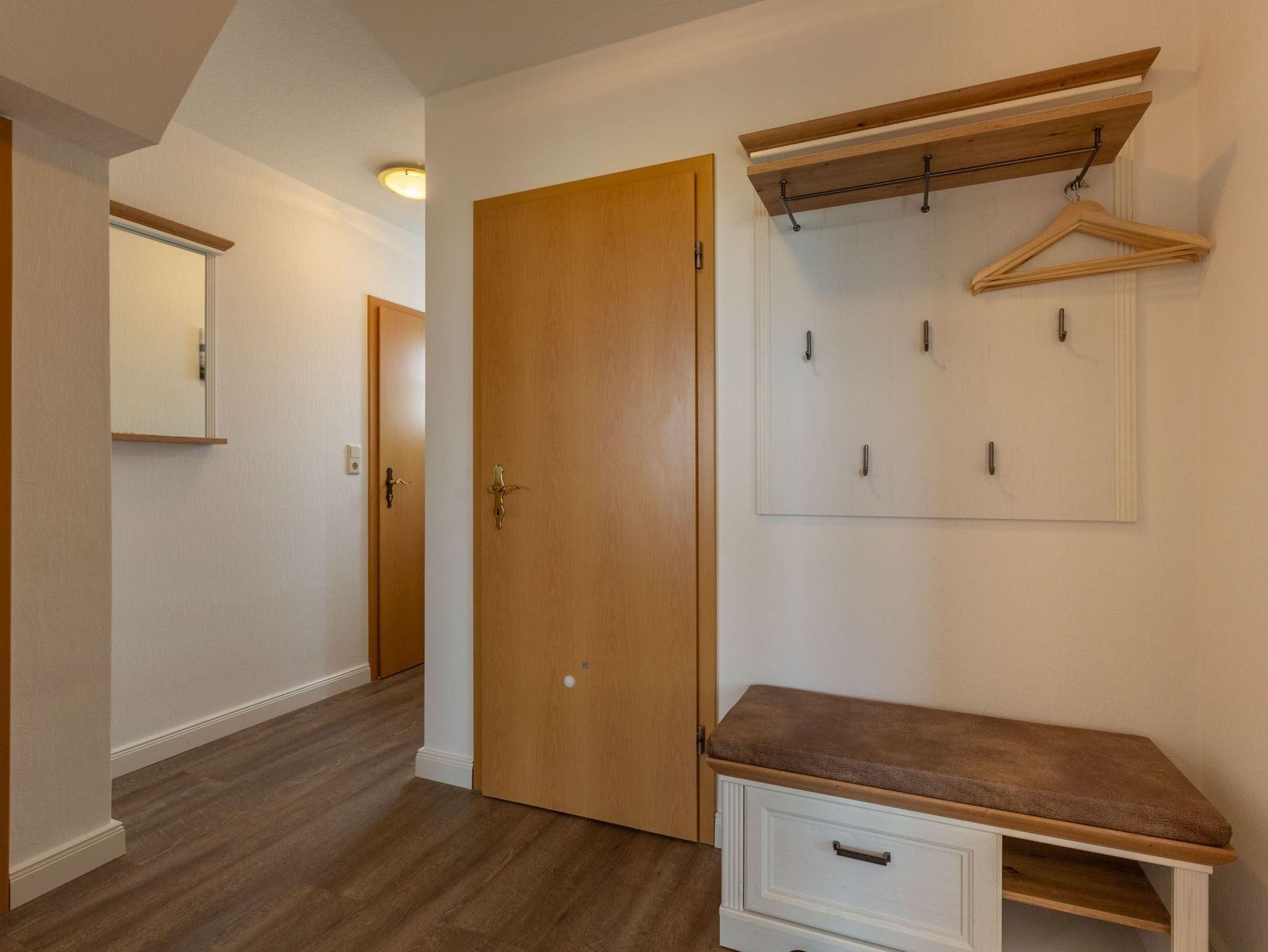 Flur mit Garderobe, Spiegel und Schuhbank. Abstellraum für Staubsauger und Wäscheständer.