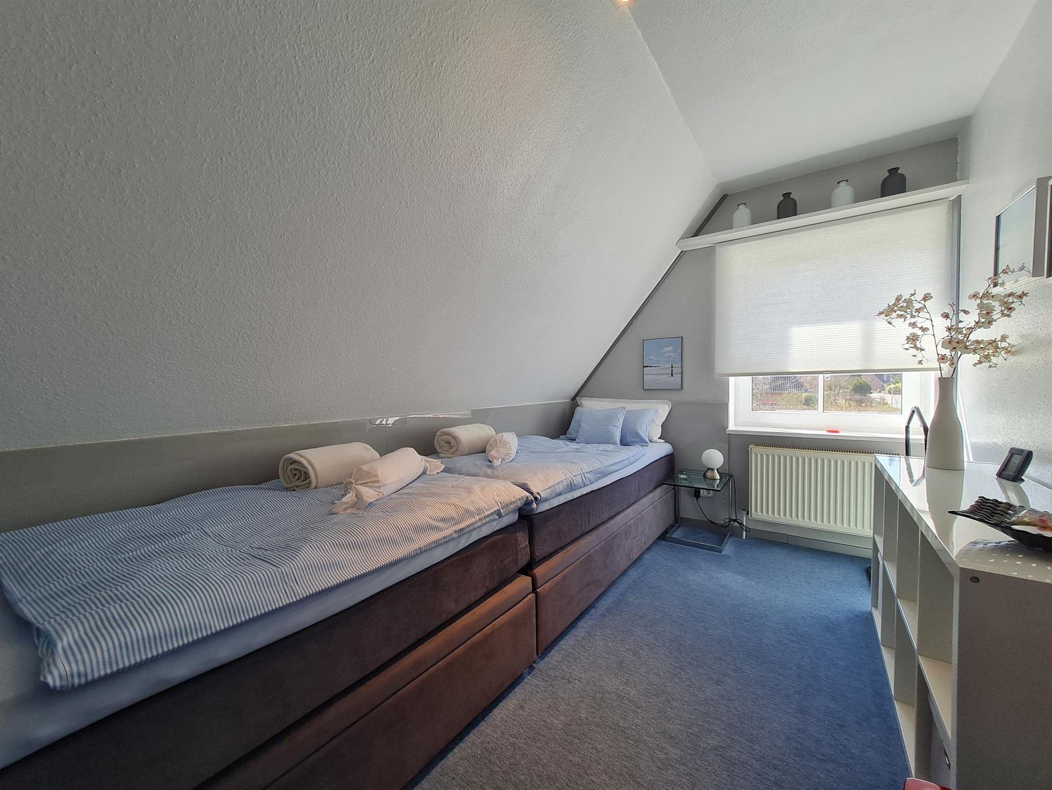 Auf zwei modernen Boxspringbetten lässt es sich in hochwertiger Bettwäsche entspannt schlummern.