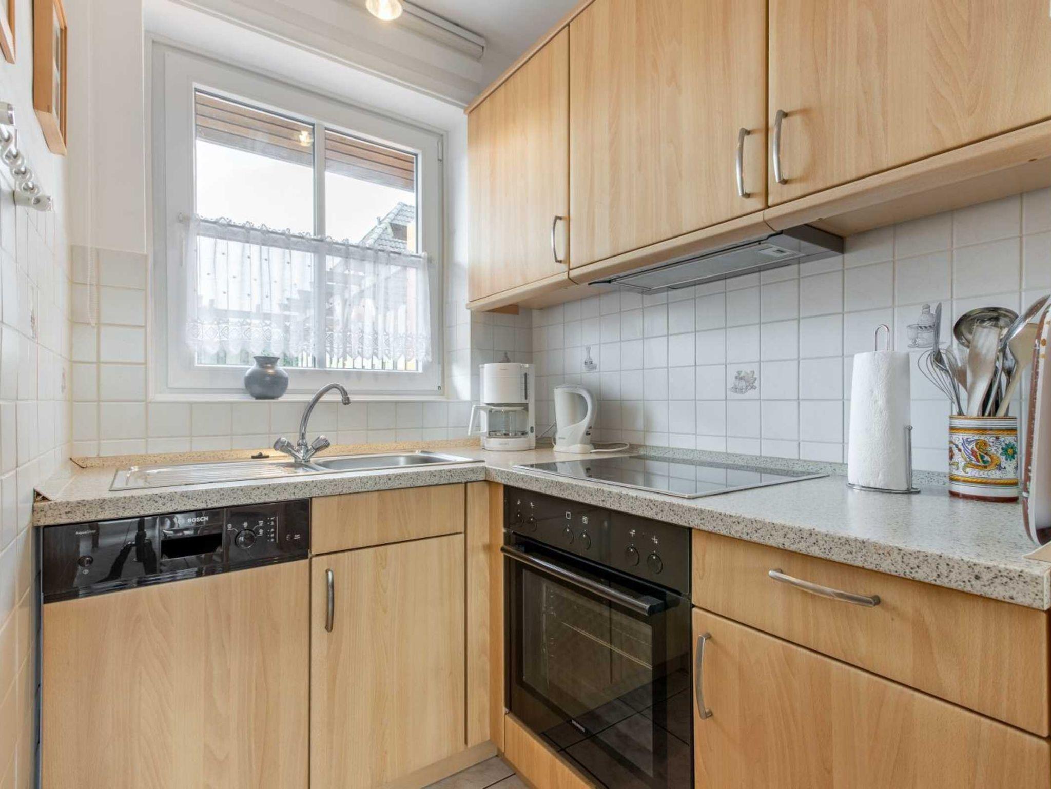 Wohnzimmer mit Sofa (2er), 2 Korbsesseln, Kaminofen, TV (Sat), DVD-Player, Stereo-Kompaktanlage und Esstisch mit 4 Stühlen. Direkter Zugang zur windgeschützten, möblierten Terrasse nach Osten. Offene Küche mit Backofen, Kühlschrank mit Gefrierfach und Geschirrspüler. Keine Mikrowelle. Abstellraum mit Staubsauger und Bügelset.