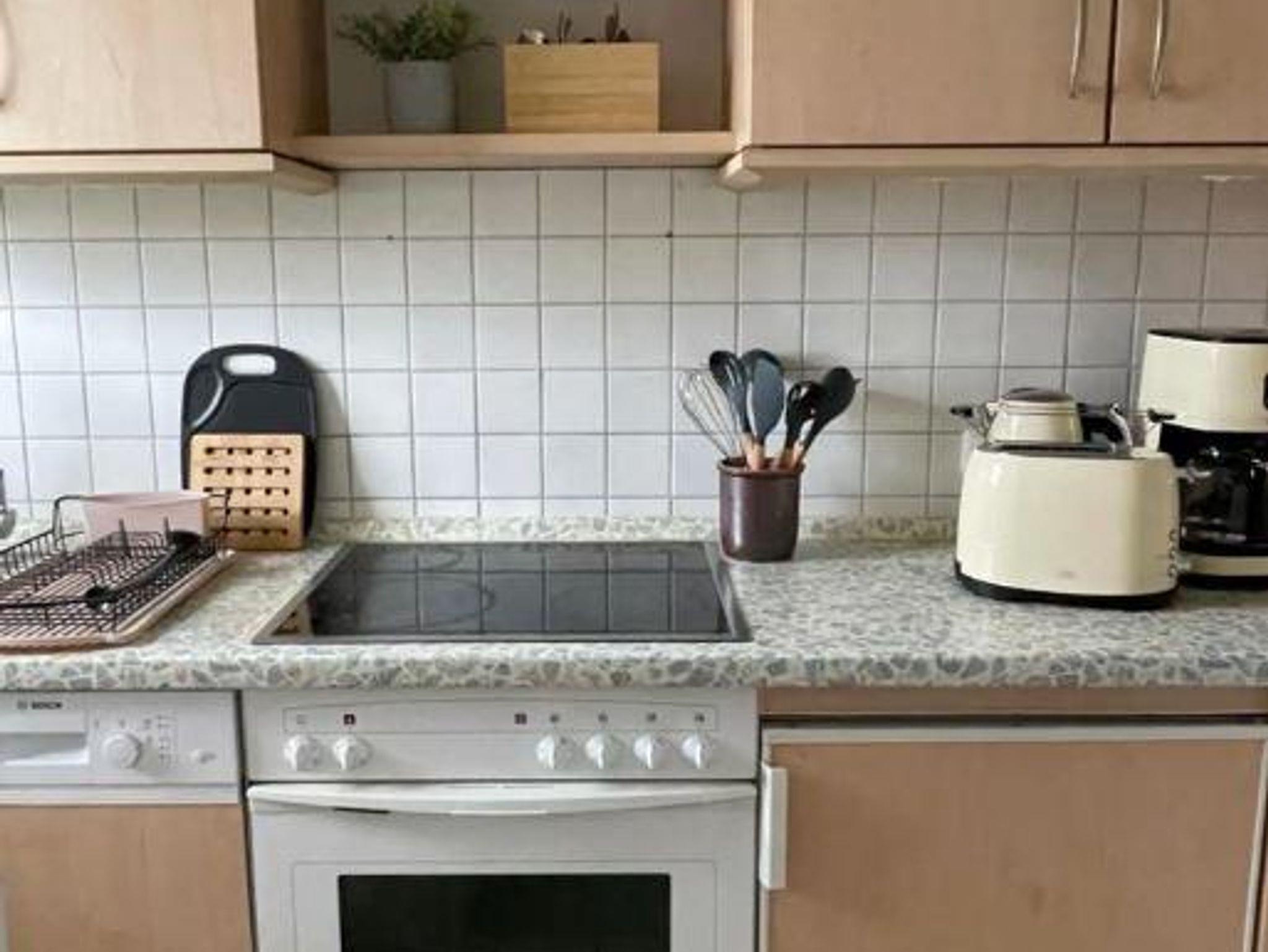 Küche mit Ceran-Kochfeld, Backofen und Geschirrspüler.